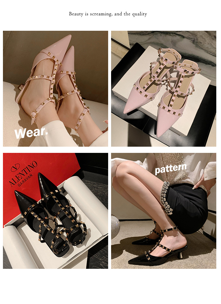 발가락 샌들 여성의 2025 년 봄과 여름 새로운 뾰족한 하이힐 리벳, 소 가죽 여성 신발 도매스토어 가기