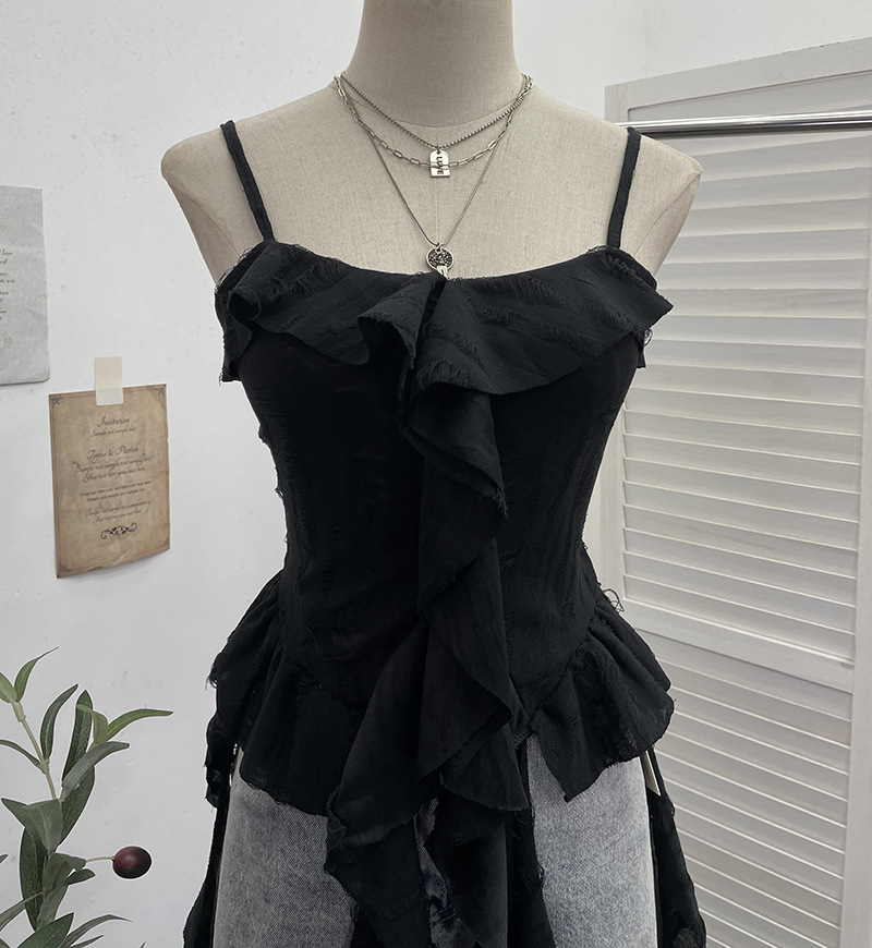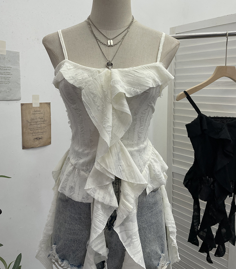 진짜 샷 어두운 폐기물 토양 오래된 구멍 캐미솔 불규칙한 러플 스 트리머 짧은 민소매 톱 9238스토어 가기
