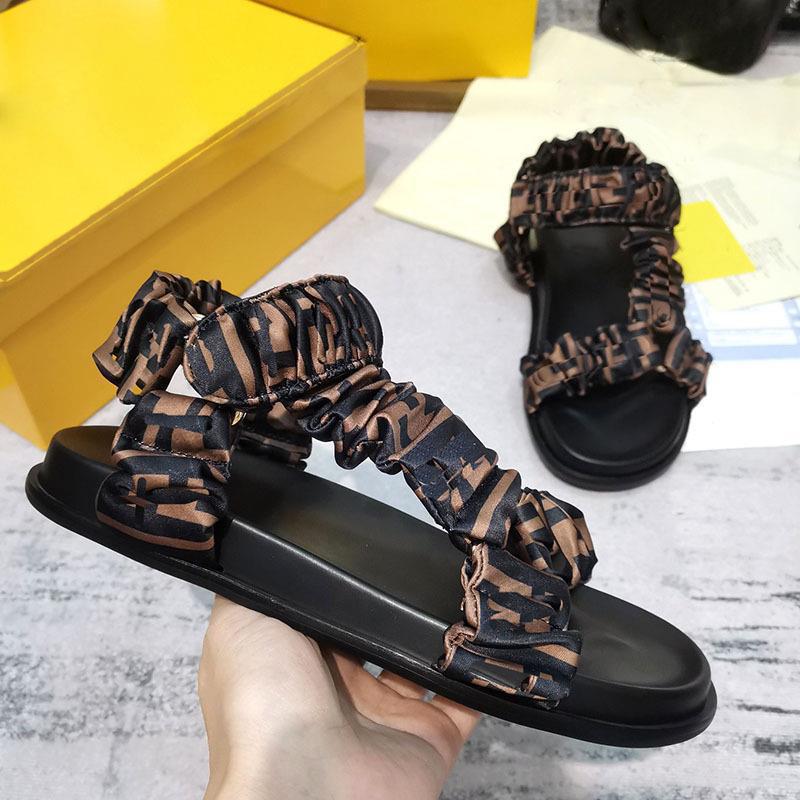 2025 새로운 두꺼운 밑창 샌들 편지 Satin drawstring Flat Outer Beach 신발 주름진 오래된 꽃 여성 신발