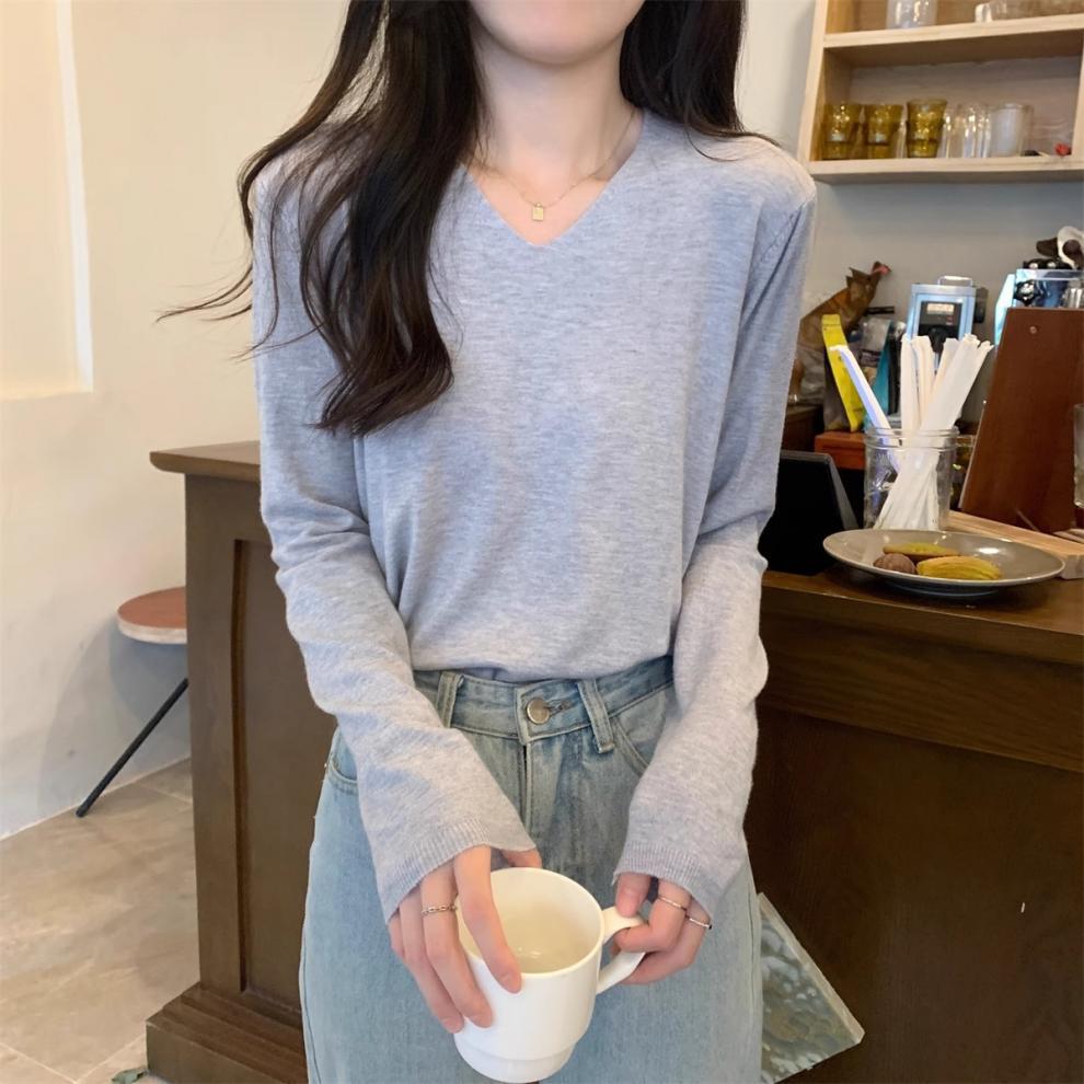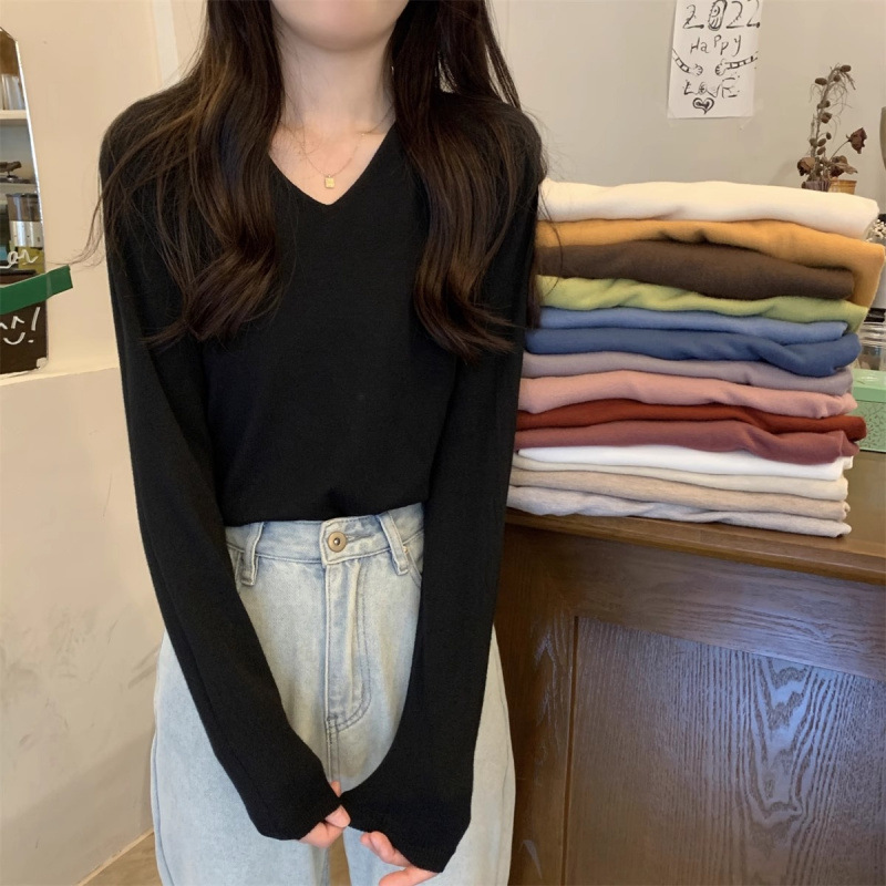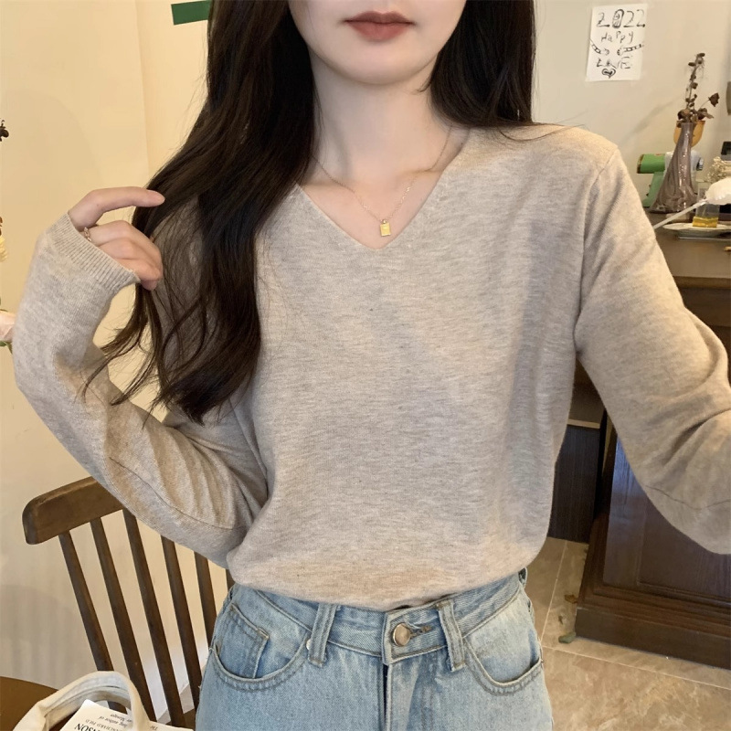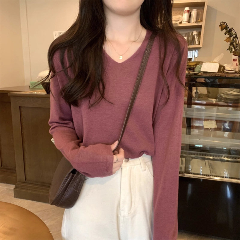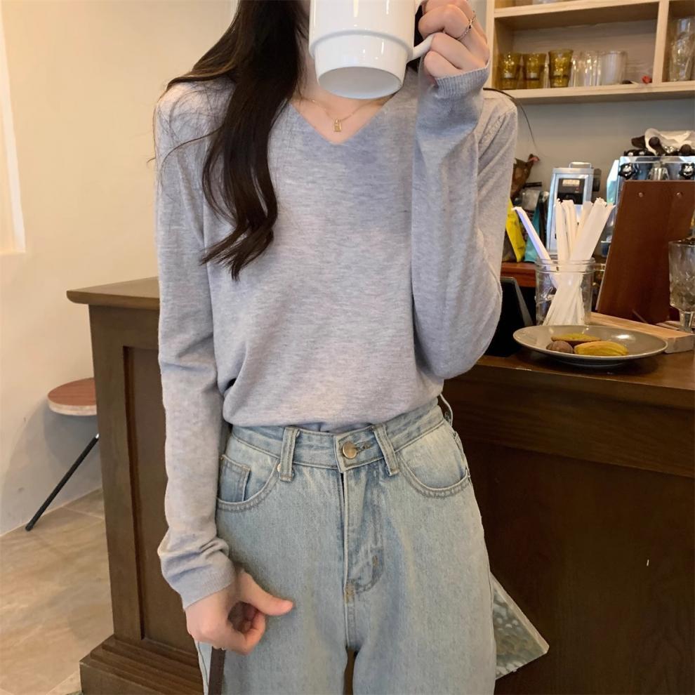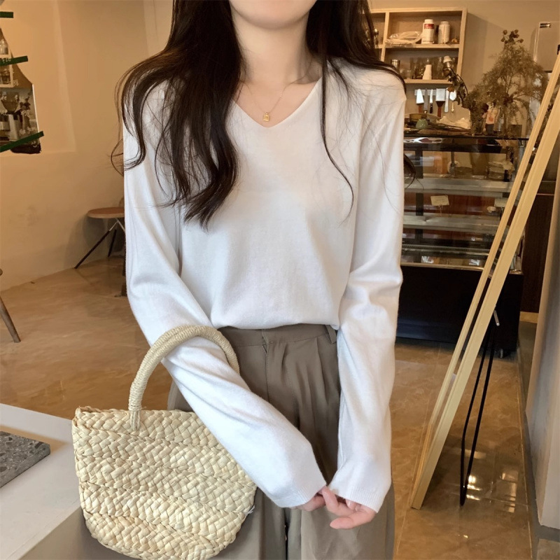 봄 가을과 겨울 2024 새로운 한국 긴 소매 V-넥 풀오버 내베이스 니트 여성용 느슨한 스웨터 탑