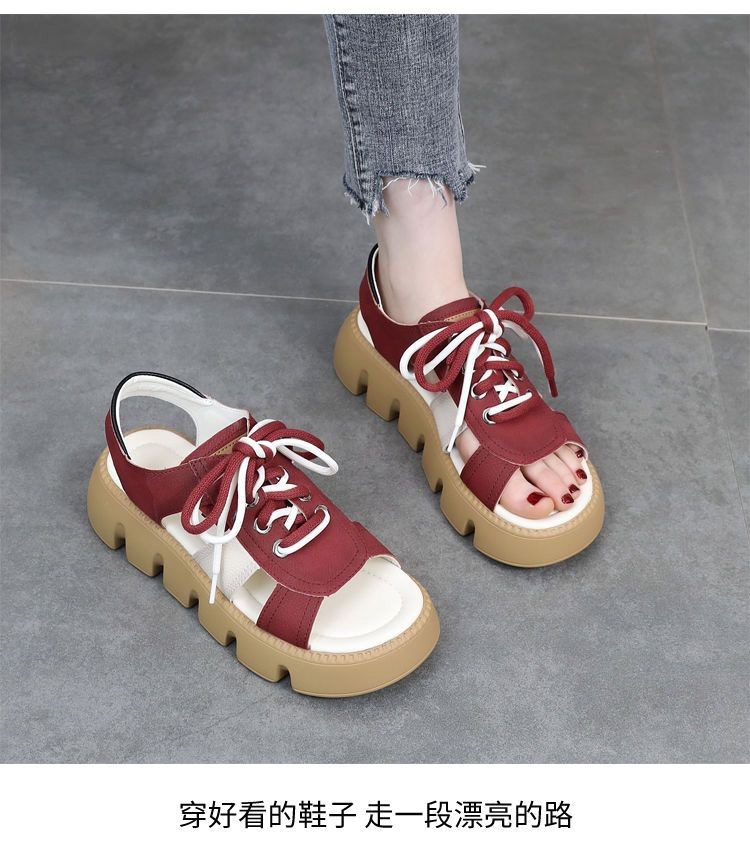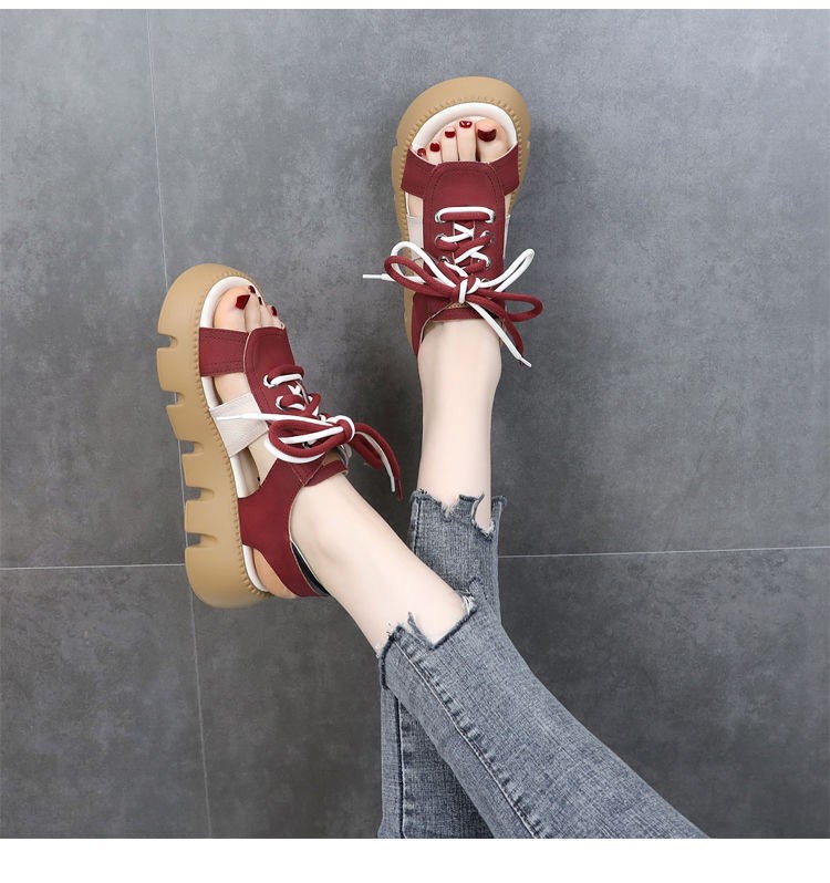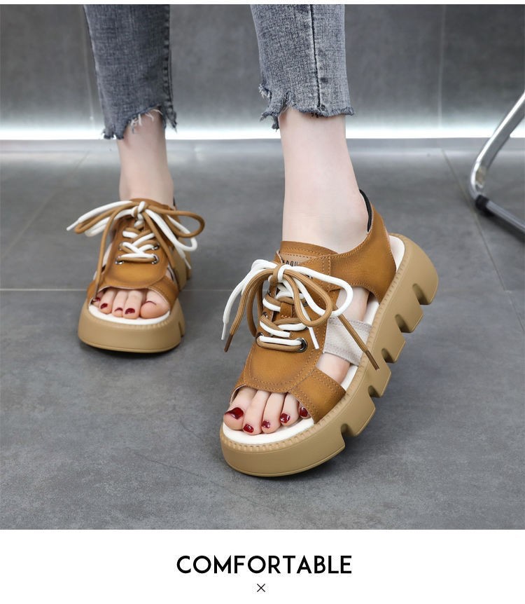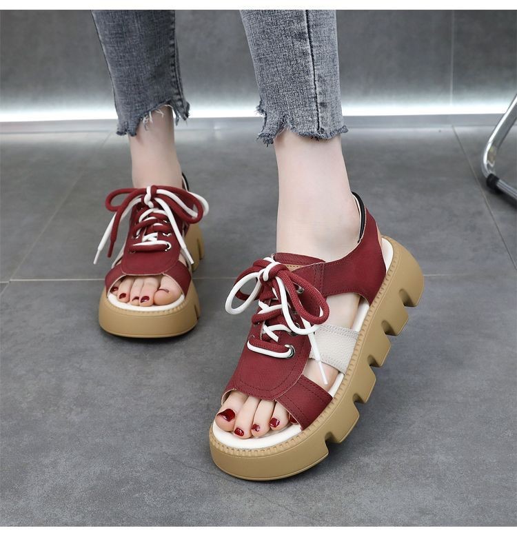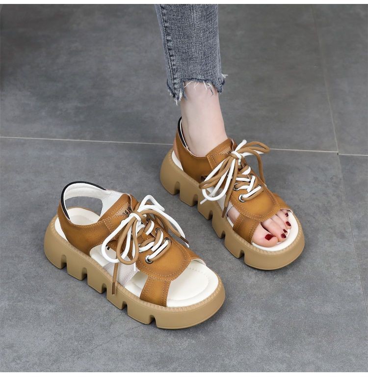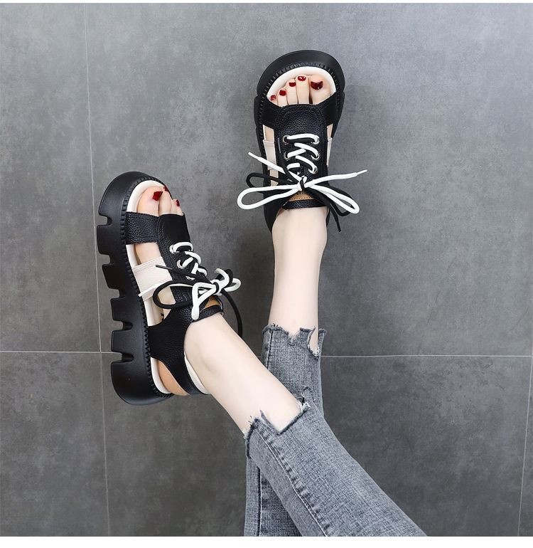 여성 부드러운 가죽 샌들 봄과 여름 패션 컬러 블록 플랫폼 하단 두꺼운 의상 플랫 레이스 업 비치 로마 샌들