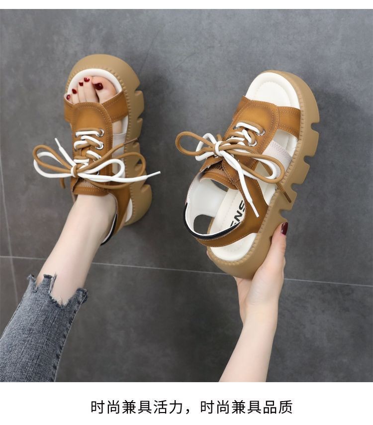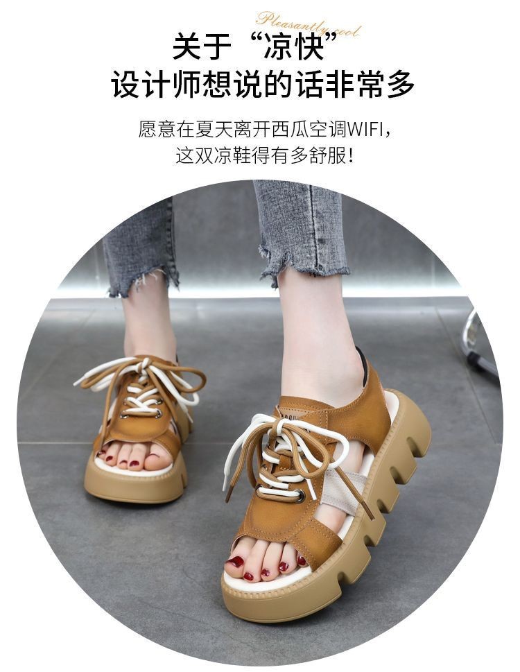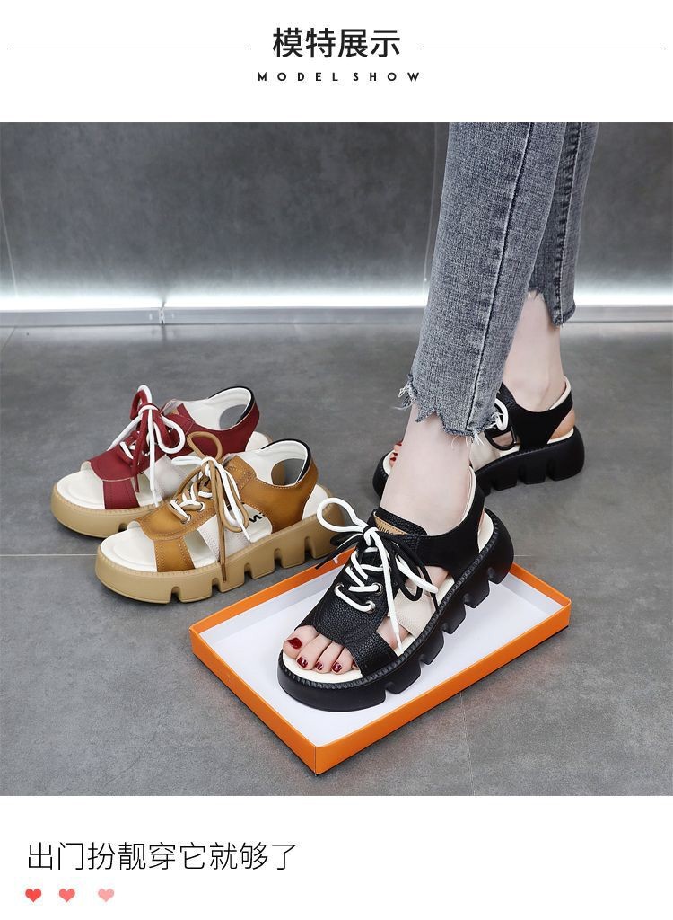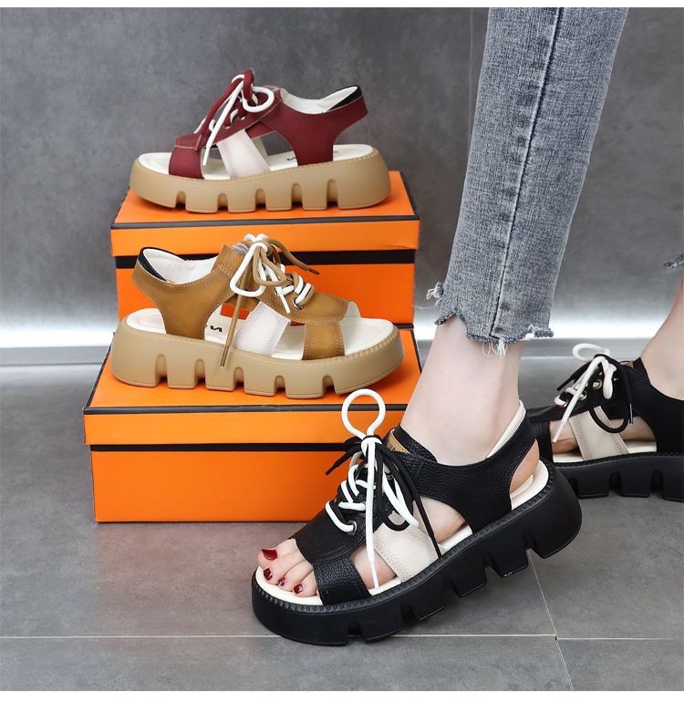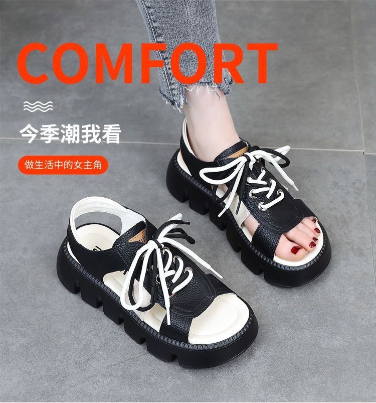 여성 부드러운 가죽 샌들 봄과 여름 패션 컬러 블록 플랫폼 하단 두꺼운 의상 플랫 레이스 업 비치 로마 샌들스토어 가기