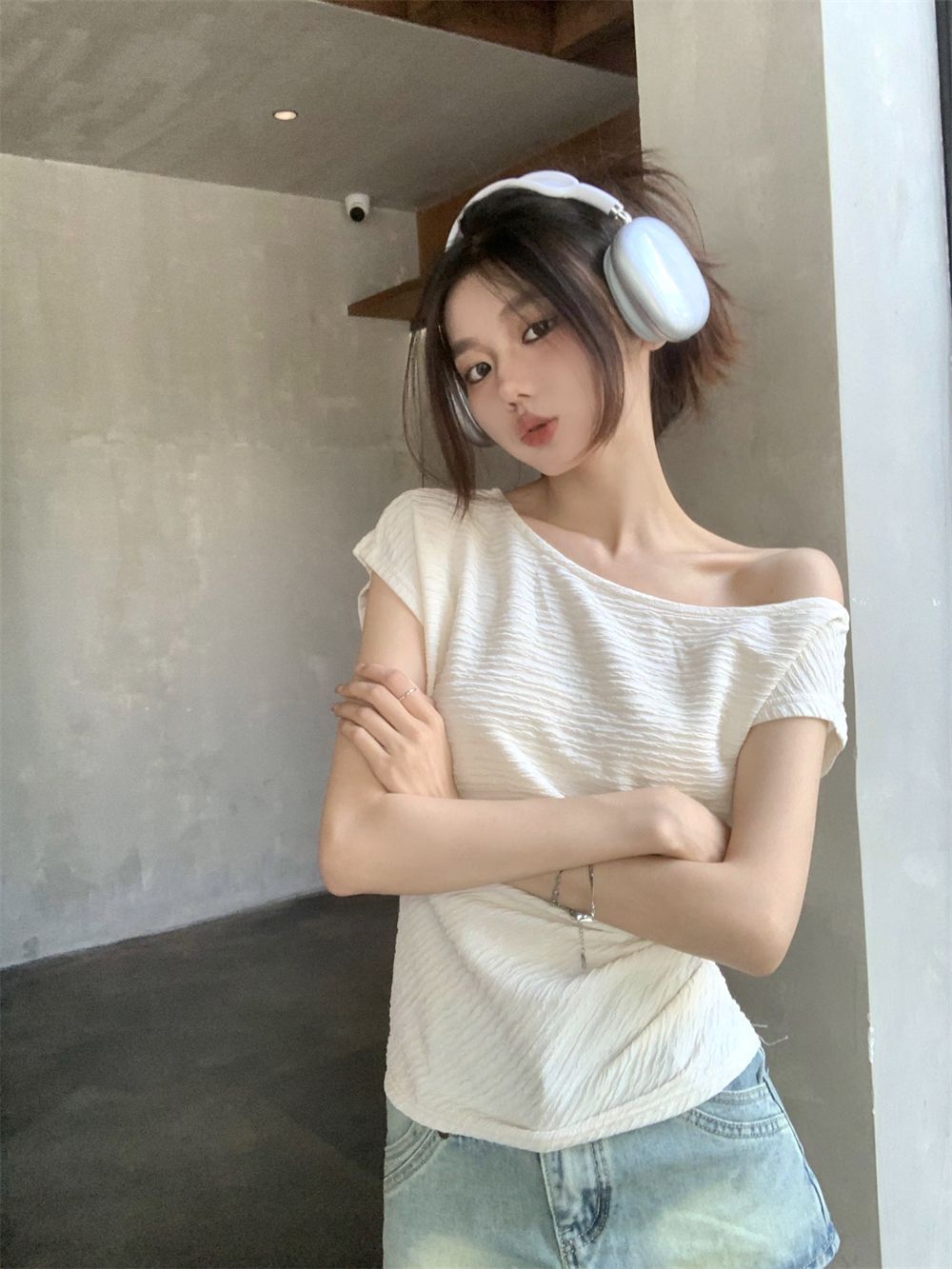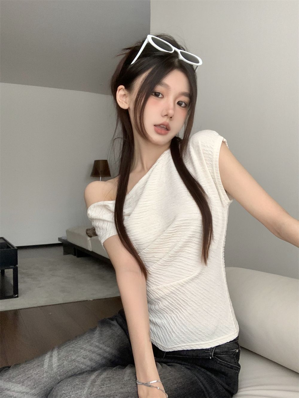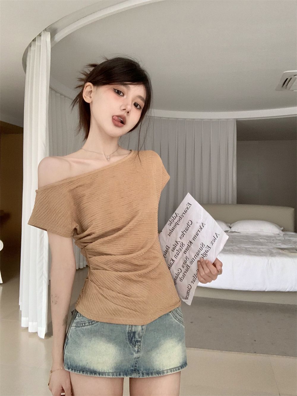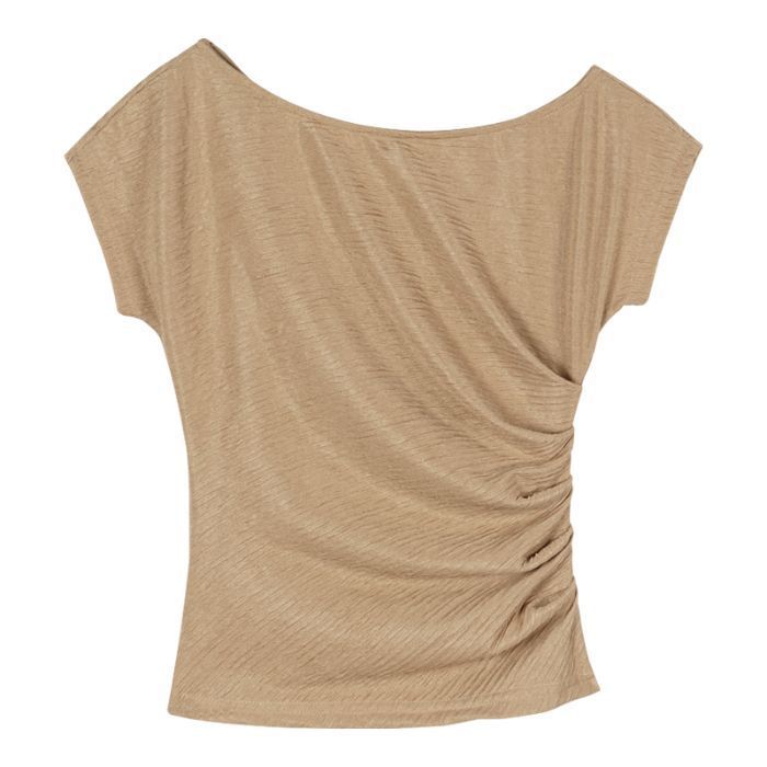 한국식 여성 반팔 주름 어깨 모양의 쇄골 티셔츠 새로운 여름 디자인 센스 니쉬 디자인 센스 쇼트 탑