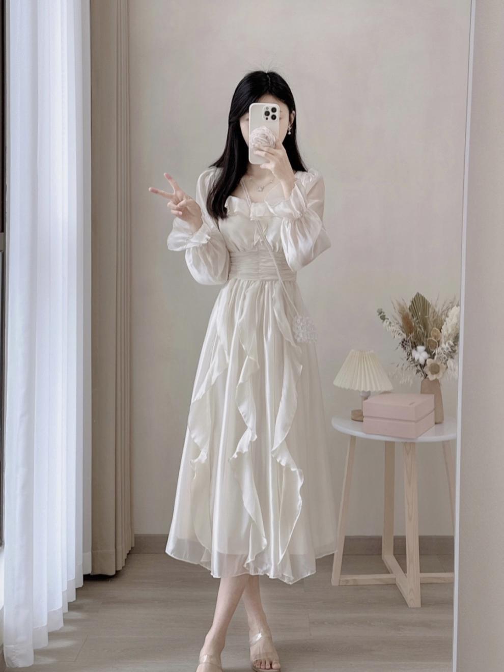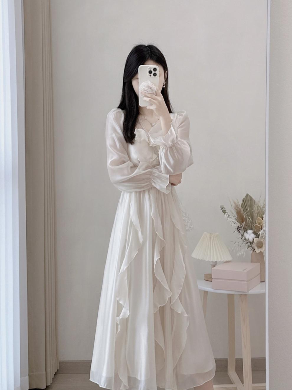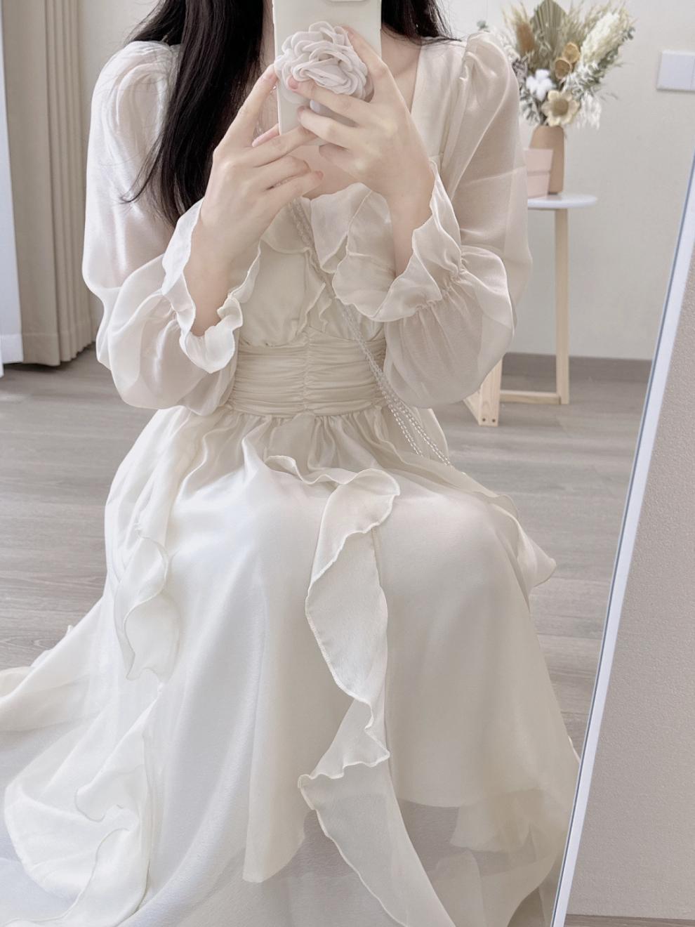 프랑스 러플 화이트 원피스 여성 가을 우아한 첫 사랑 공주 원피스 허리 작은 긴 원피스스토어 가기