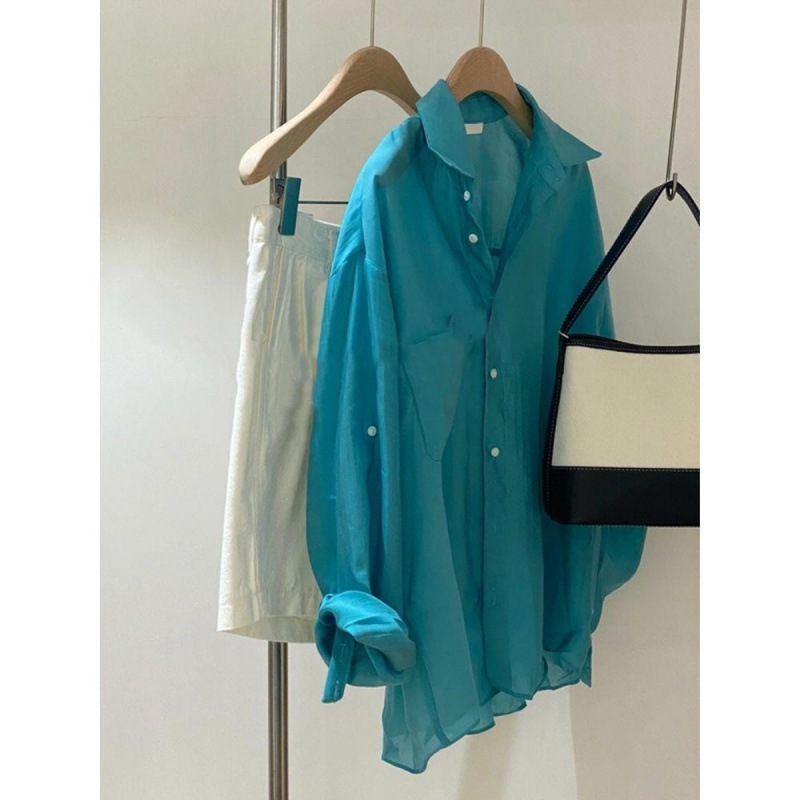 텐셀 프렌치 심플 하이 엔드 블루 우아한 셔츠 여자 프렌치 레트로 루즈 캐주얼 올 매치 탑스토어 가기