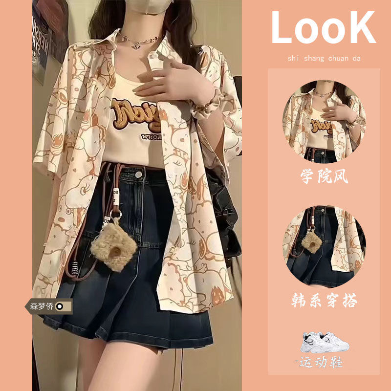 여름 새로운 미국 스타일 만화 낙서 반팔 셔츠 여성의 느슨한 올 매치 작은 얇은 셔츠 짧은 치마 세트