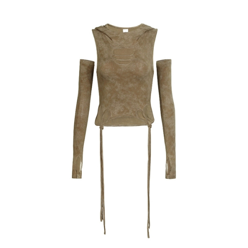 카키 폐기물 토양 스타일 후드 티셔츠 여성용 봄웨어 아메리칸 스타일 퓨어 핫 핫 걸 슬림핏 짧은 소매 탑