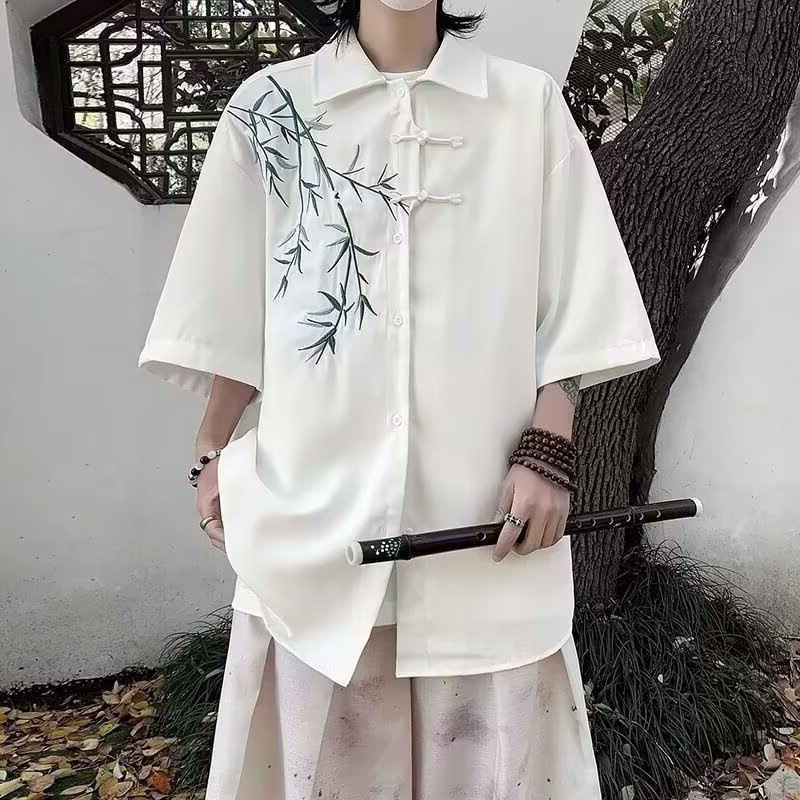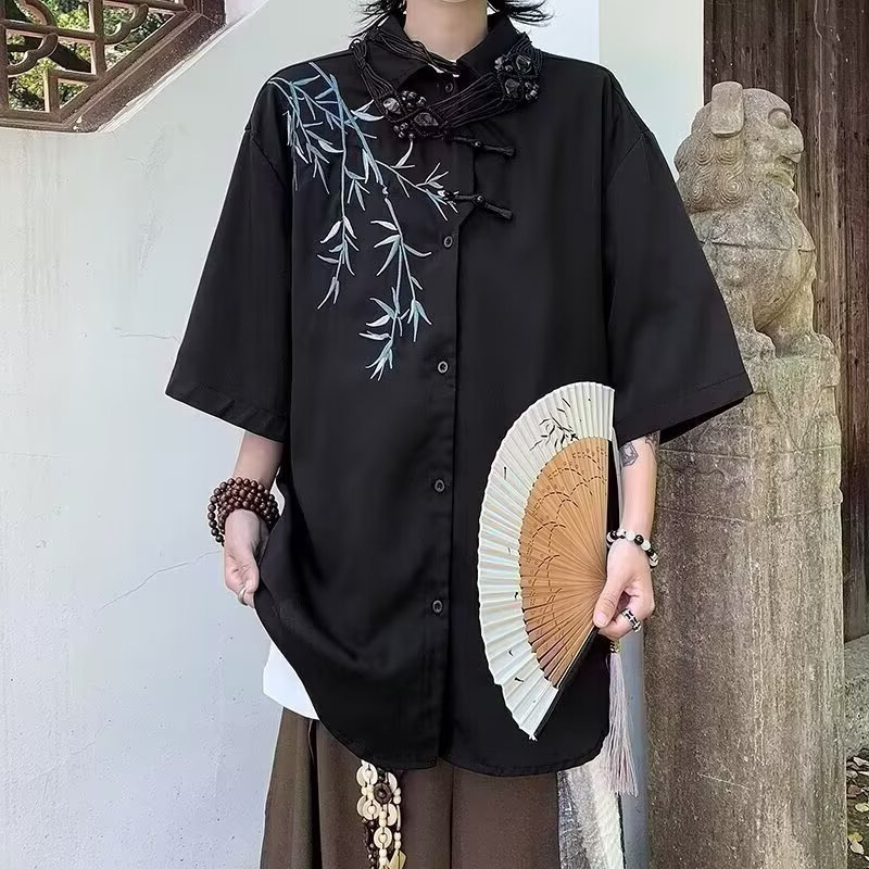 2025 새로운 중국 스타일 대나무 자수 버튼 셔츠 여성의 느슨한 여름 짧은 소매 국가 스타일 트렌디 한 탕 스타일 셔츠
