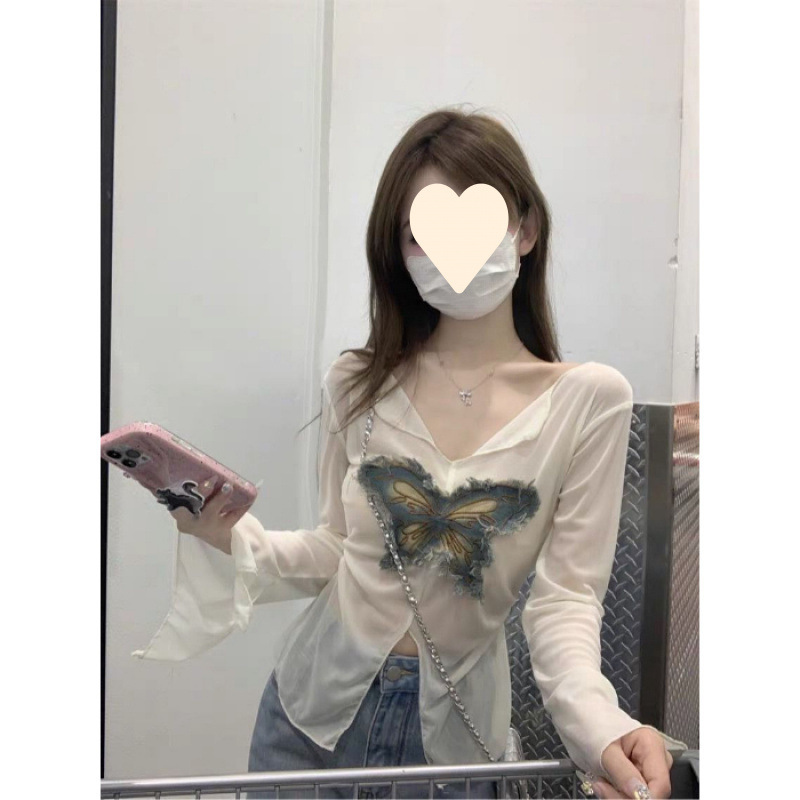 프랑스 나비 뜨거운 소녀 분할 선 스크린 긴팔 티셔츠 여성의 봄 2025 새로운 허리 슬리밍 블라우스 탑 Ins스토어 가기