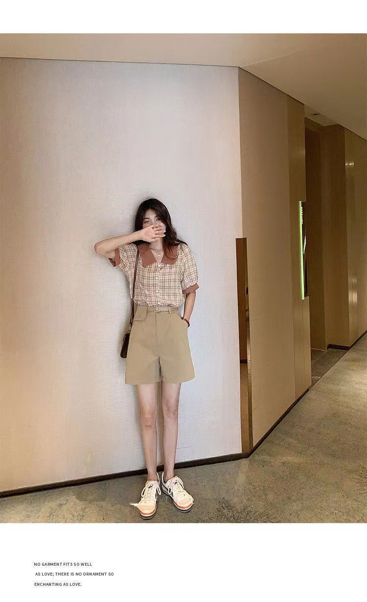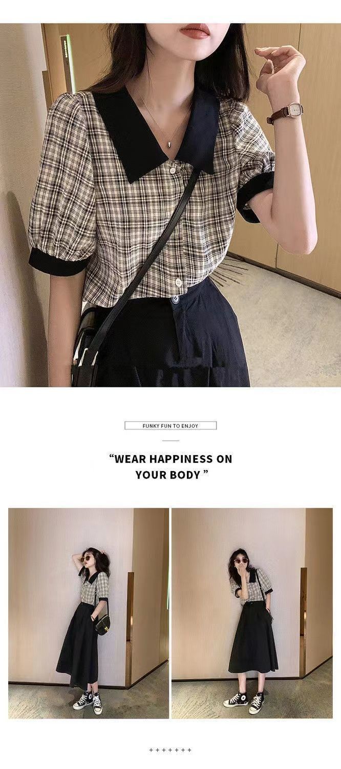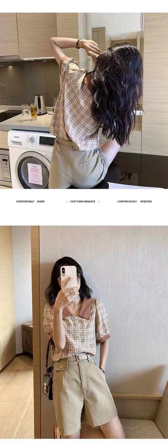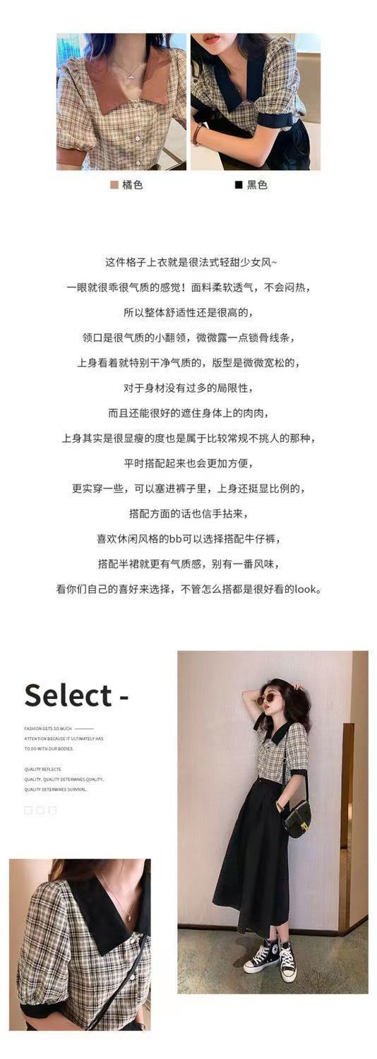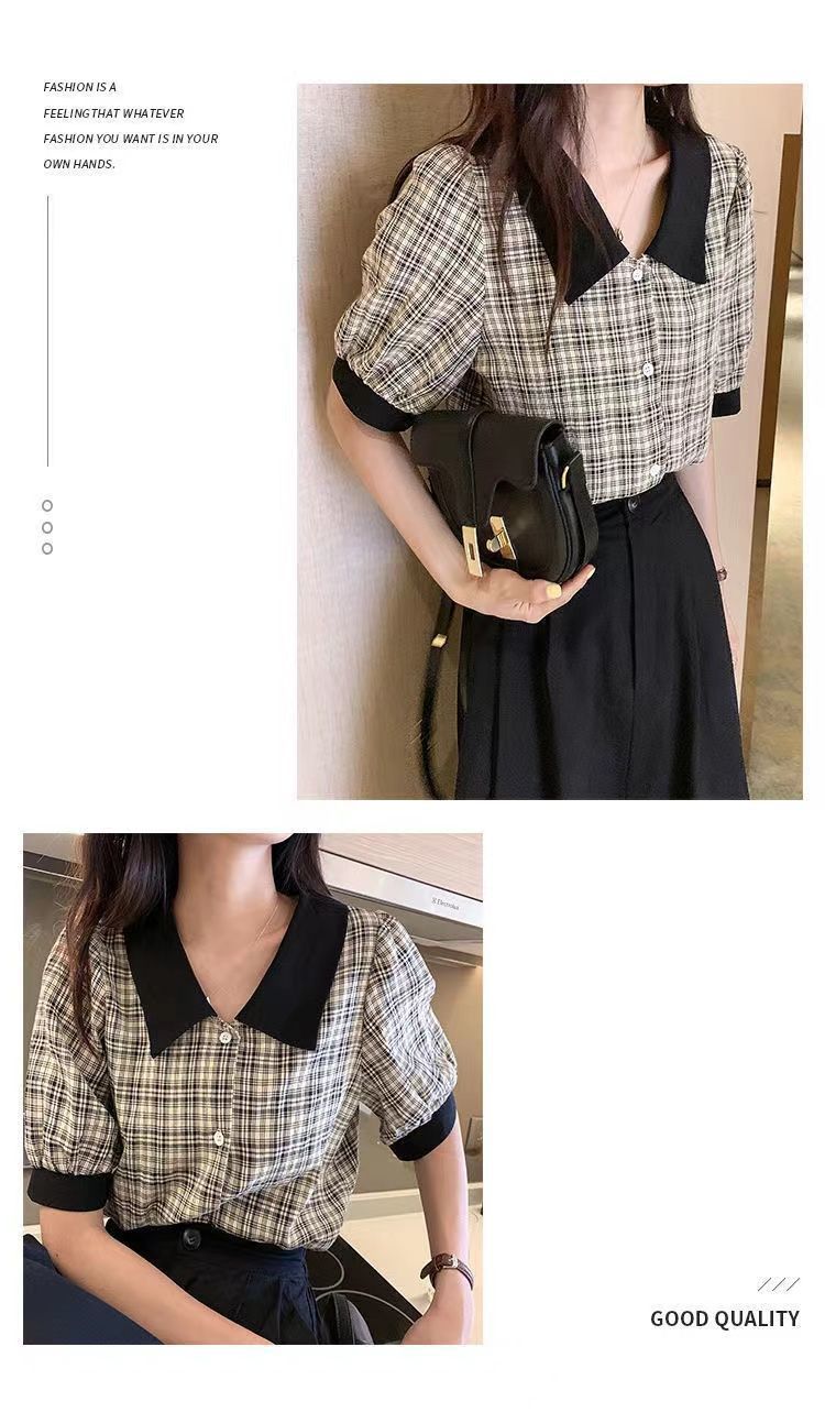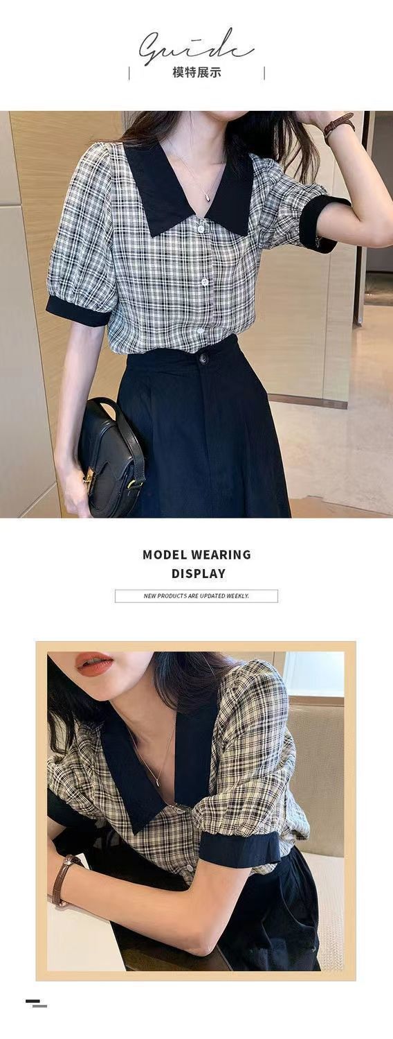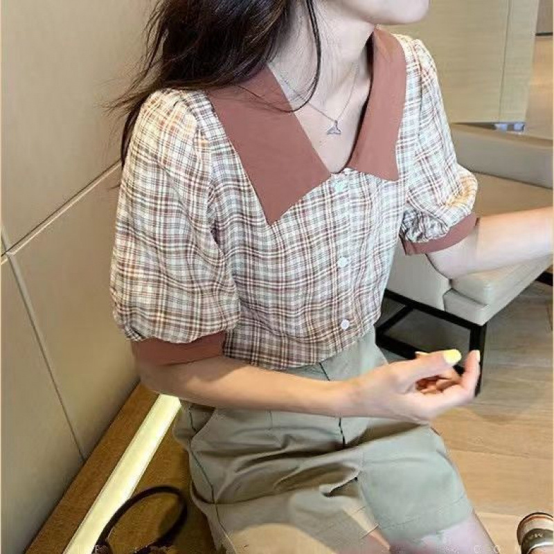 인형 칼라 격자 무늬 쉬폰 작은 셔츠 여성의 2025 여름 새로운 반소매 탑 레트로 우아한 프랑스 디자인 슬리밍스토어 가기