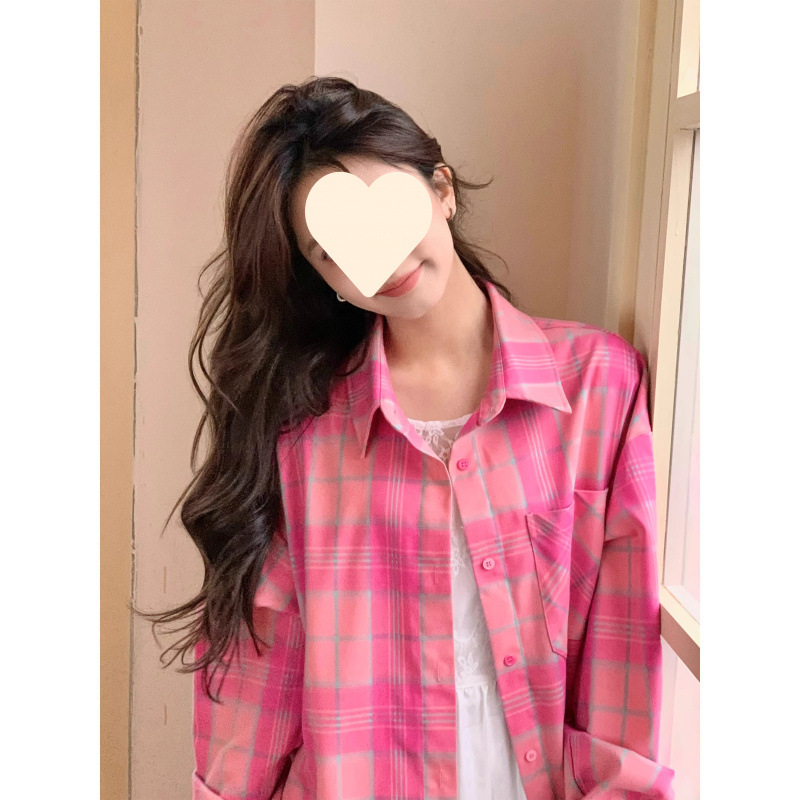 모리 스타일 달콤한 핑크 격자 무늬 셔츠 여성의 이른 가을 중간 두께 느슨한 캐주얼 슬리밍 중간 길이 셔츠 외부 착용 카디건스토어 가기