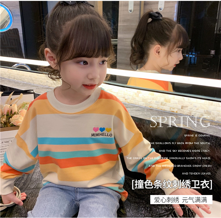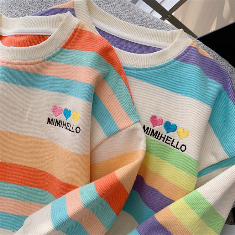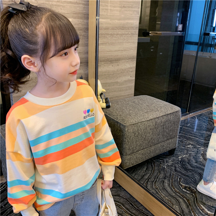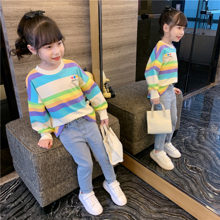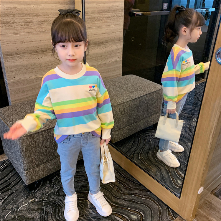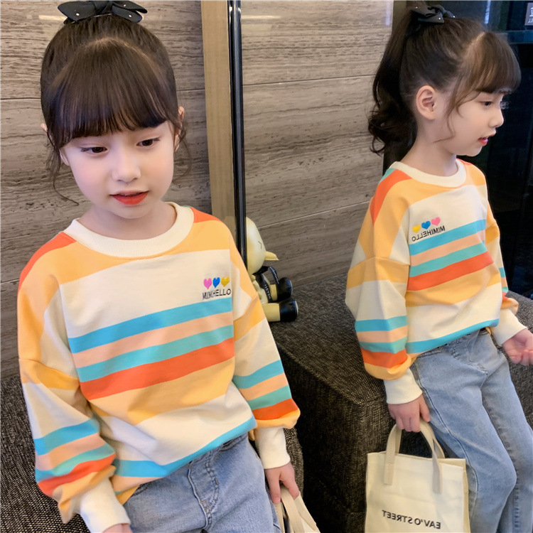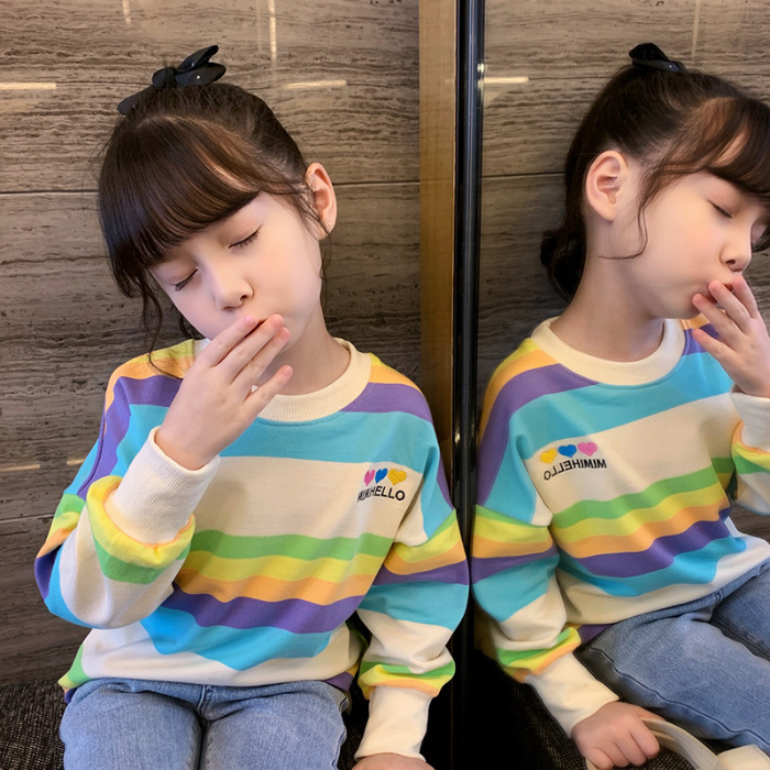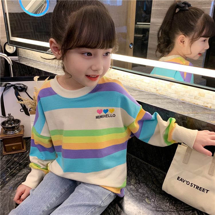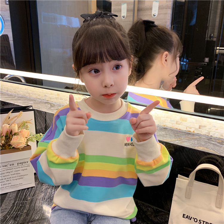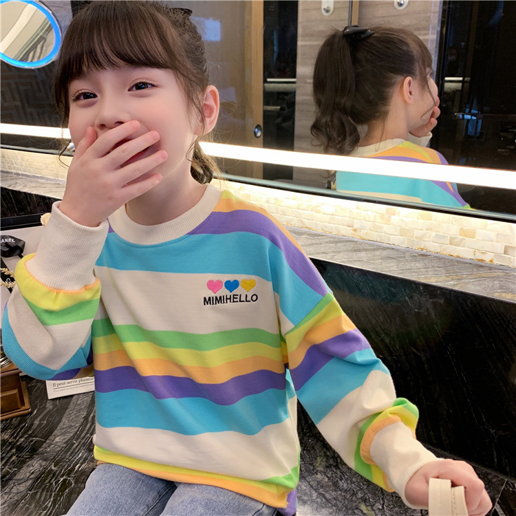 소녀 레인보우 티셔츠 서양식 어린이 긴 소매 줄무늬 스웨트 셔츠 2025 년 봄과 가을 새로운 소녀 한국 스타일 인터넷 축하 탑