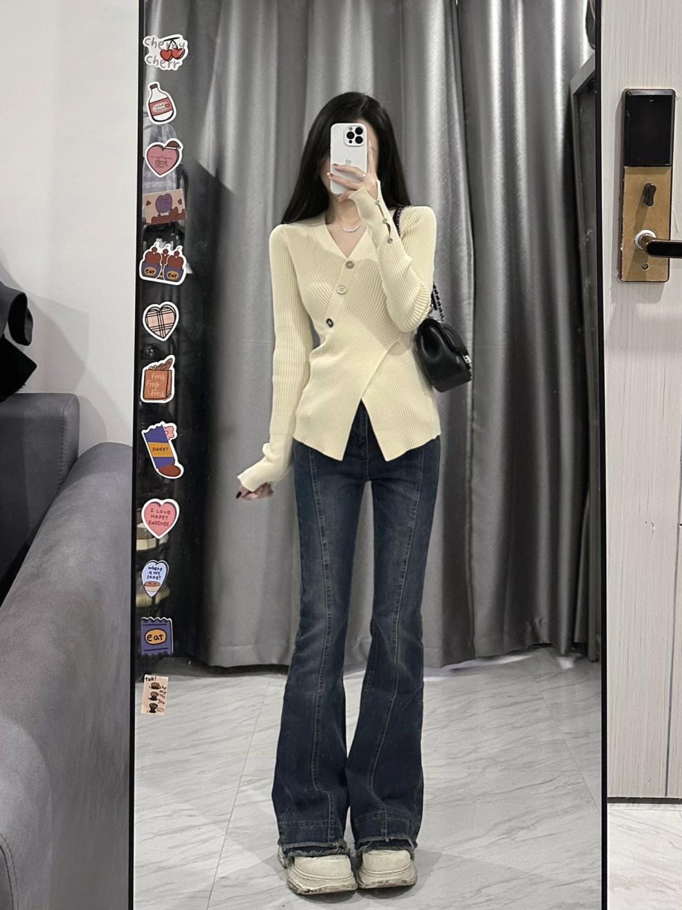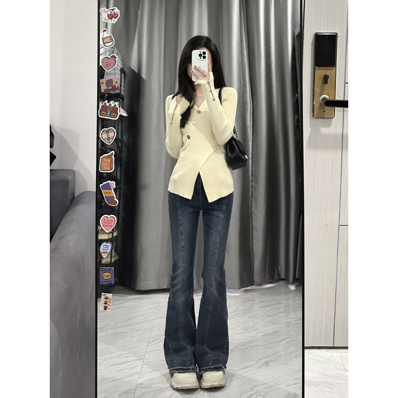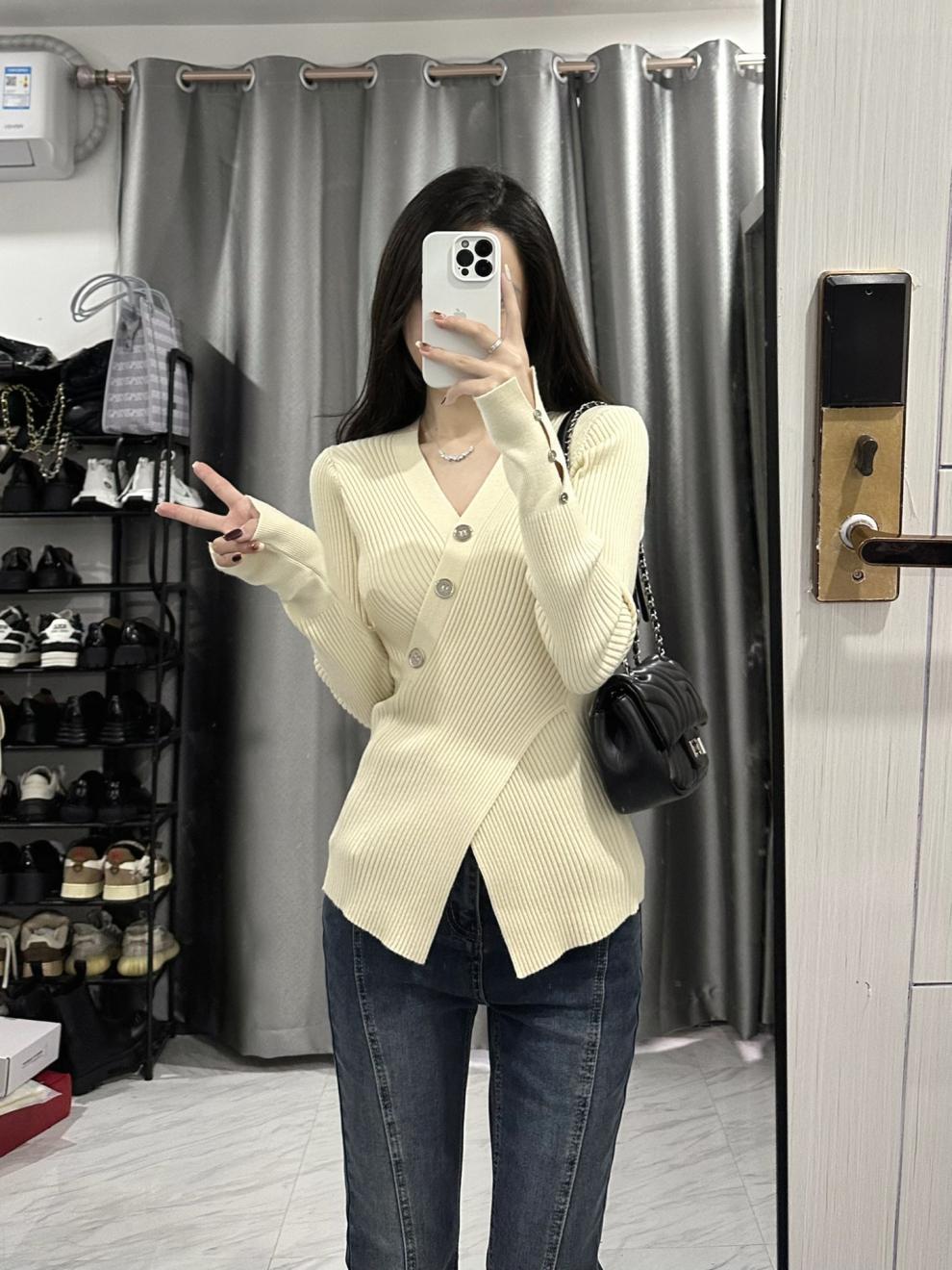 불규칙한 순수하고 슬리밍 V-넥 스웨터 크로스 A4 허리 슬림 핏 스플릿 풀오버 니트 긴팔 내부 탑스토어 가기