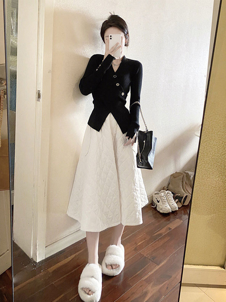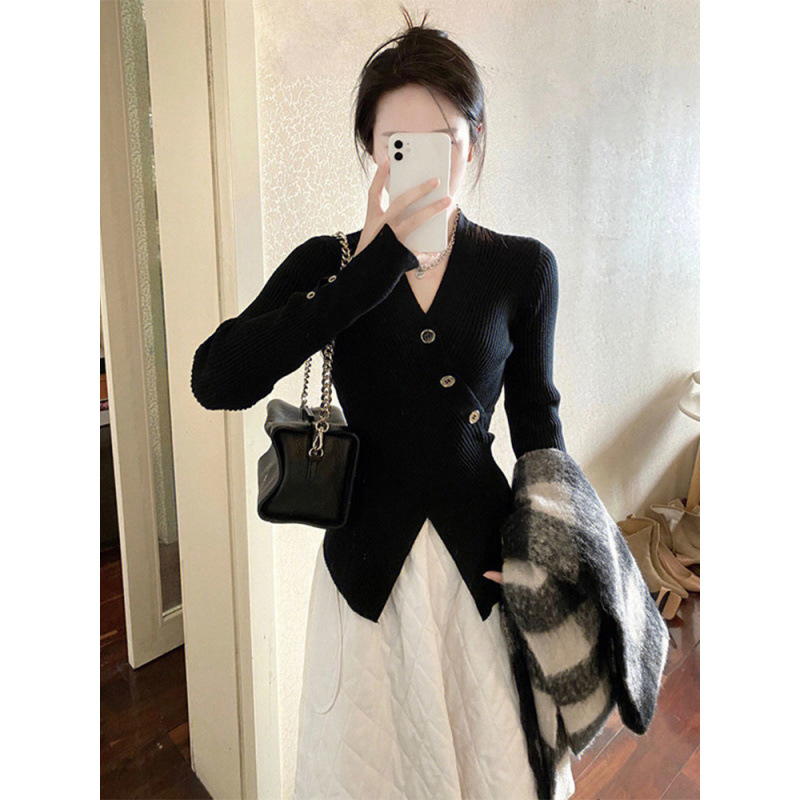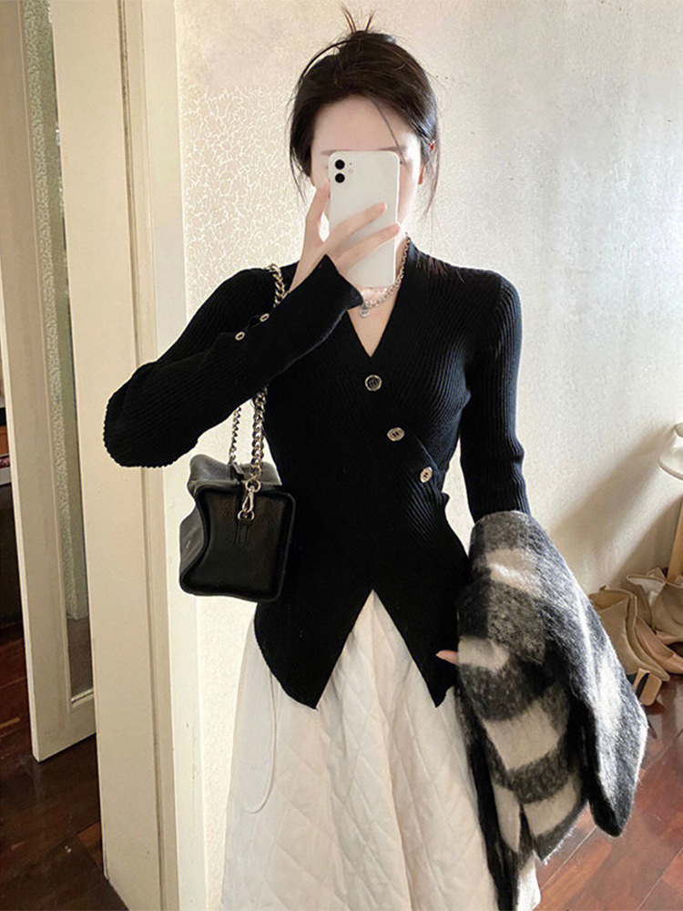 불규칙한 순수하고 슬리밍 V-넥 스웨터 크로스 A4 허리 슬림 핏 스플릿 풀오버 니트 긴팔 내부 탑