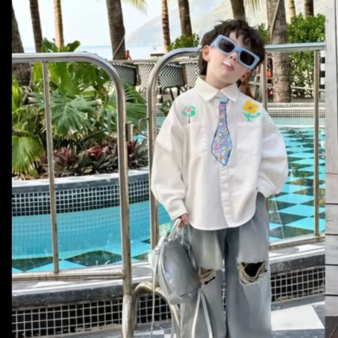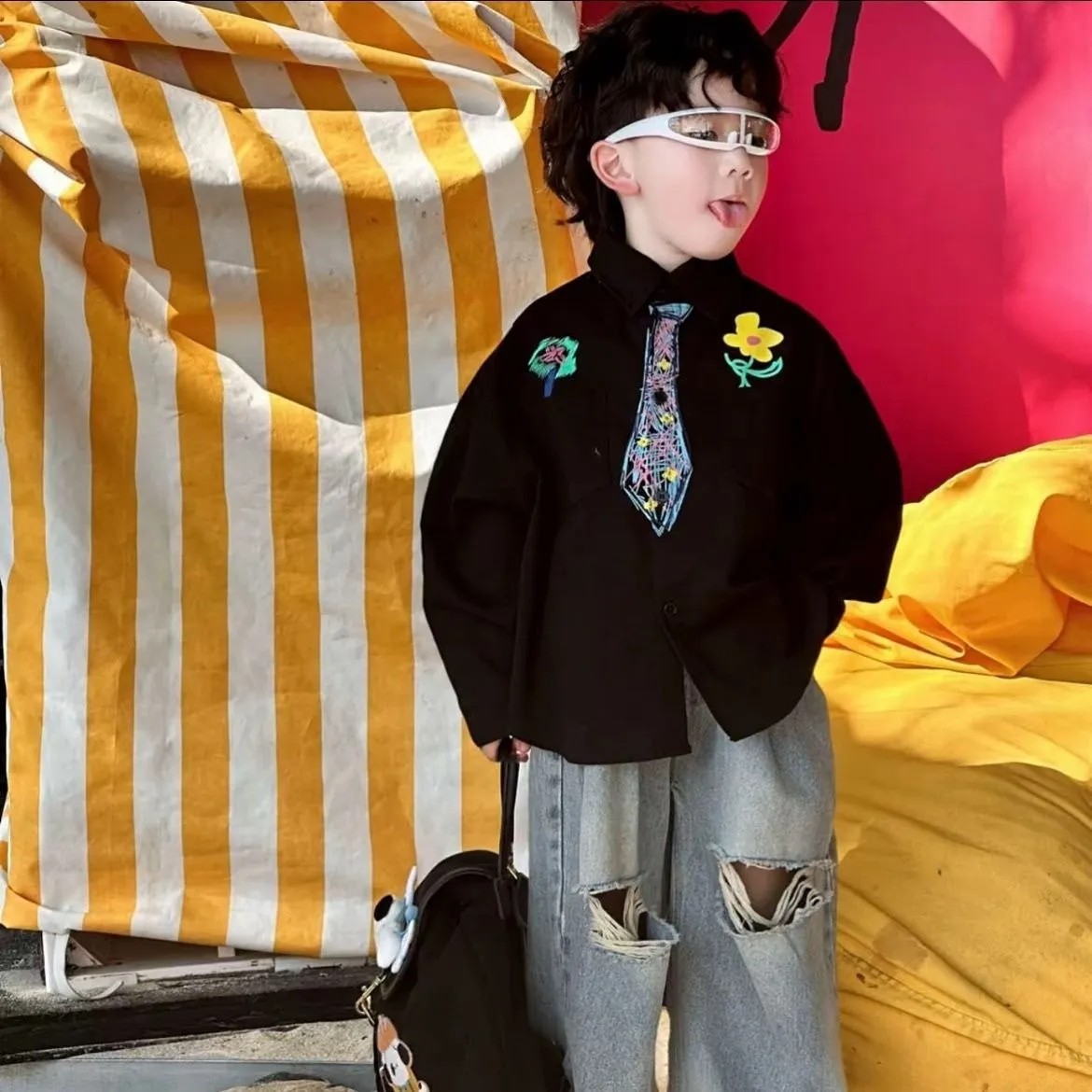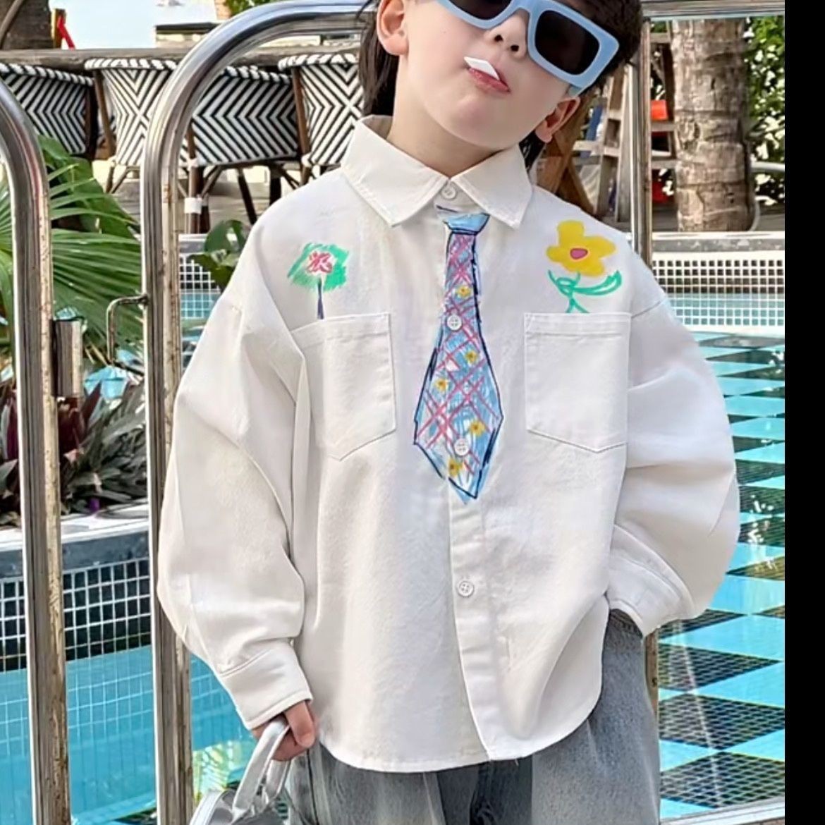남자들의 새 세트 2025 봄 어린이 한국 스타일 독특한 컬러 프린트 긴 소매 셔츠스토어 가기