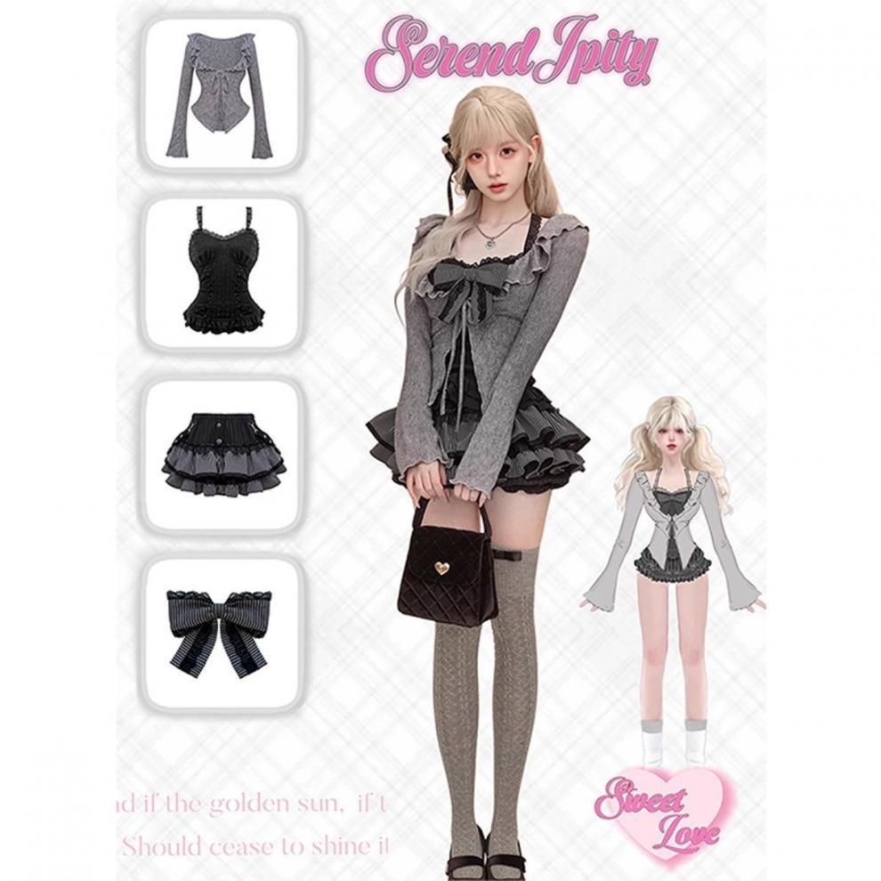 소녀 코코넛 황혼 노래 세트 봄 세트 블랙 레이스 슬링 그레이 니트 카디건 케이크 스커트스토어 가기