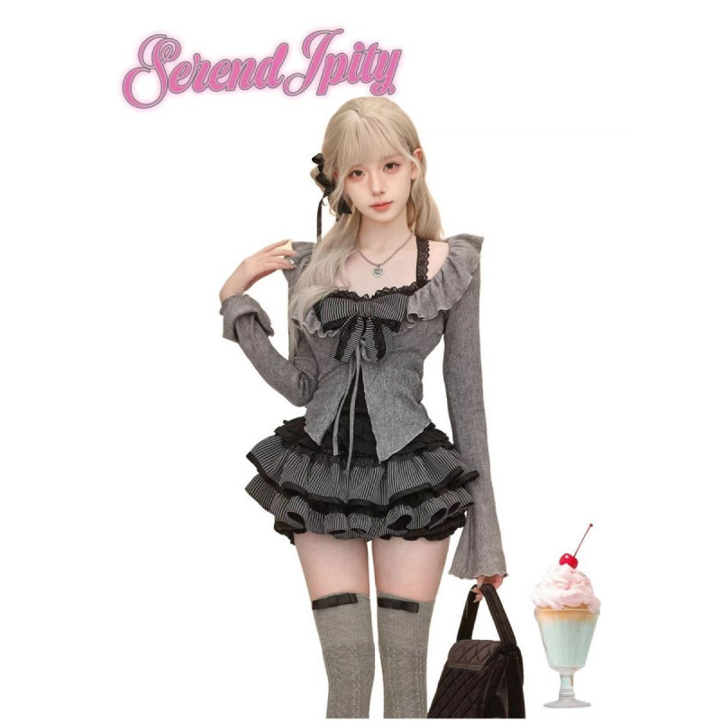 • 멜빵 + 그레이 니트 가디건 + 케이크 스커트 3종 세트