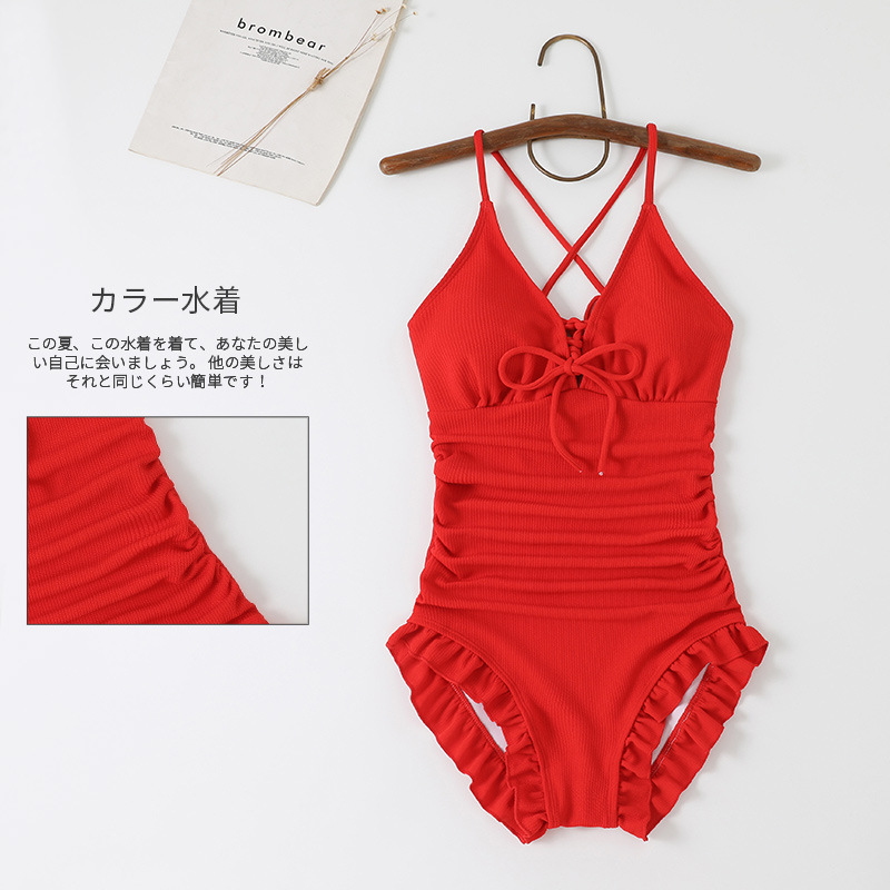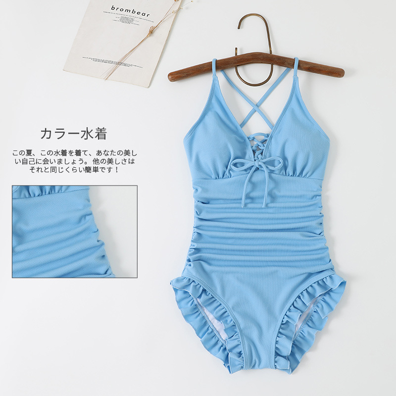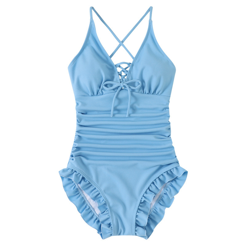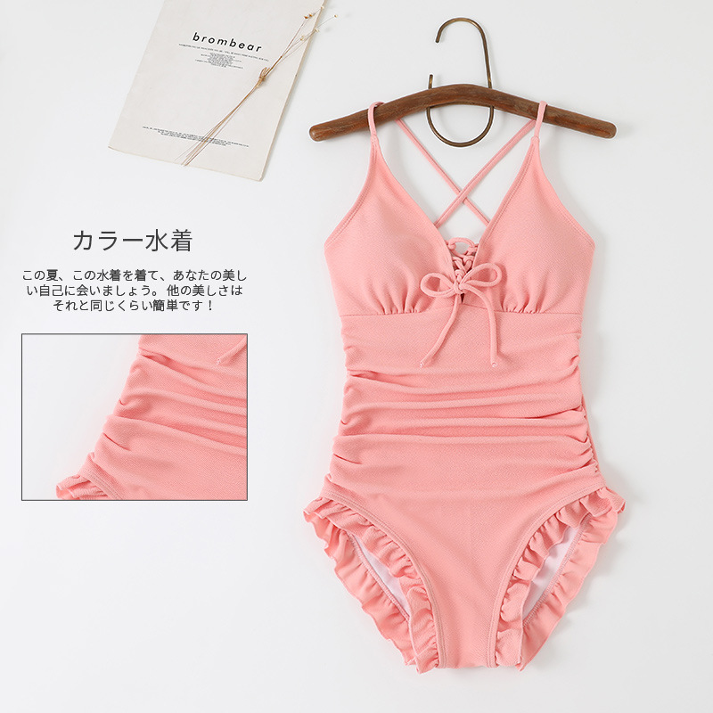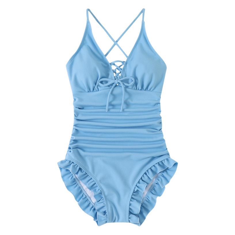 2025 순색 소녀용 원피스 러플 수영복 여학생 삼각형 온천 휴가 수영복 고탄력