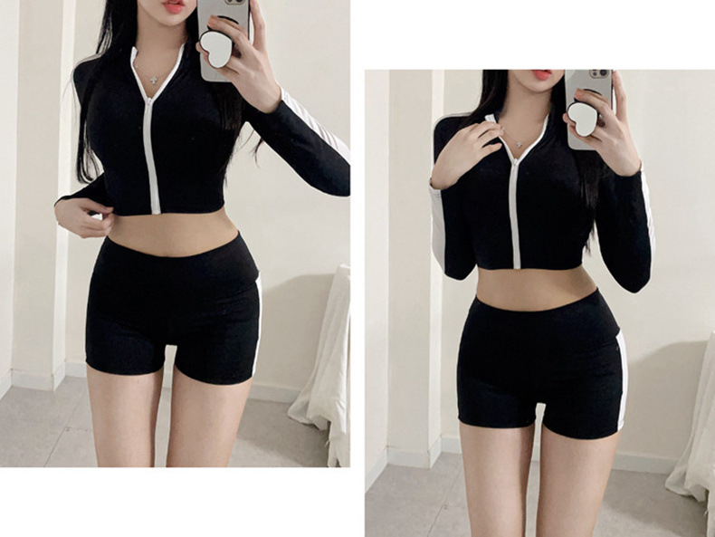 2025 새로운 4 피스 한국식 슬림 핏 슬림 핏 흑백 컬러 블록 수영복 보수적 인 선 스크린 분할 수영복 여성스토어 가기