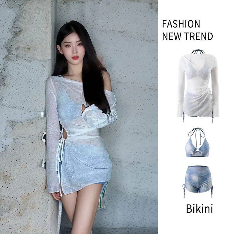 온천 수영복 여성 홀리데이 아메리칸 타이 다이 블루 3 점 스포츠 스플릿 플랫 앵글 비키니 블라우스 3 피스 세트