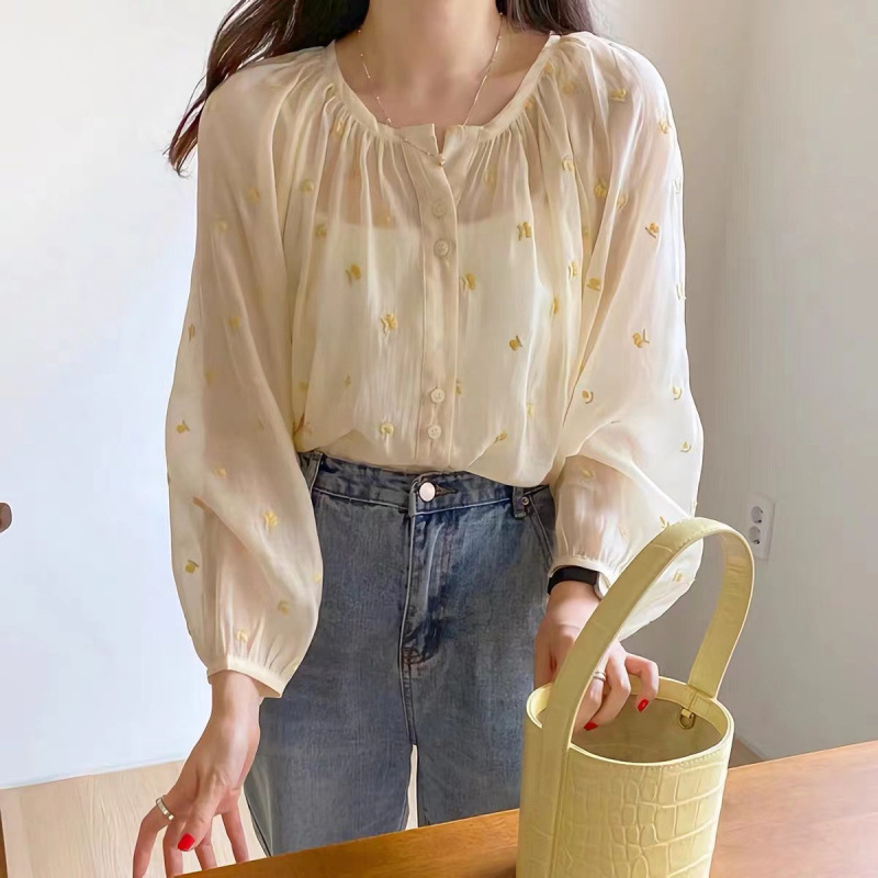 한국식 세련된 수제 수제 긴 소매 셔츠 여성용 여름 얇은 셔츠 라운드 넥 슬림 핏 느슨한 선 스크린 탑