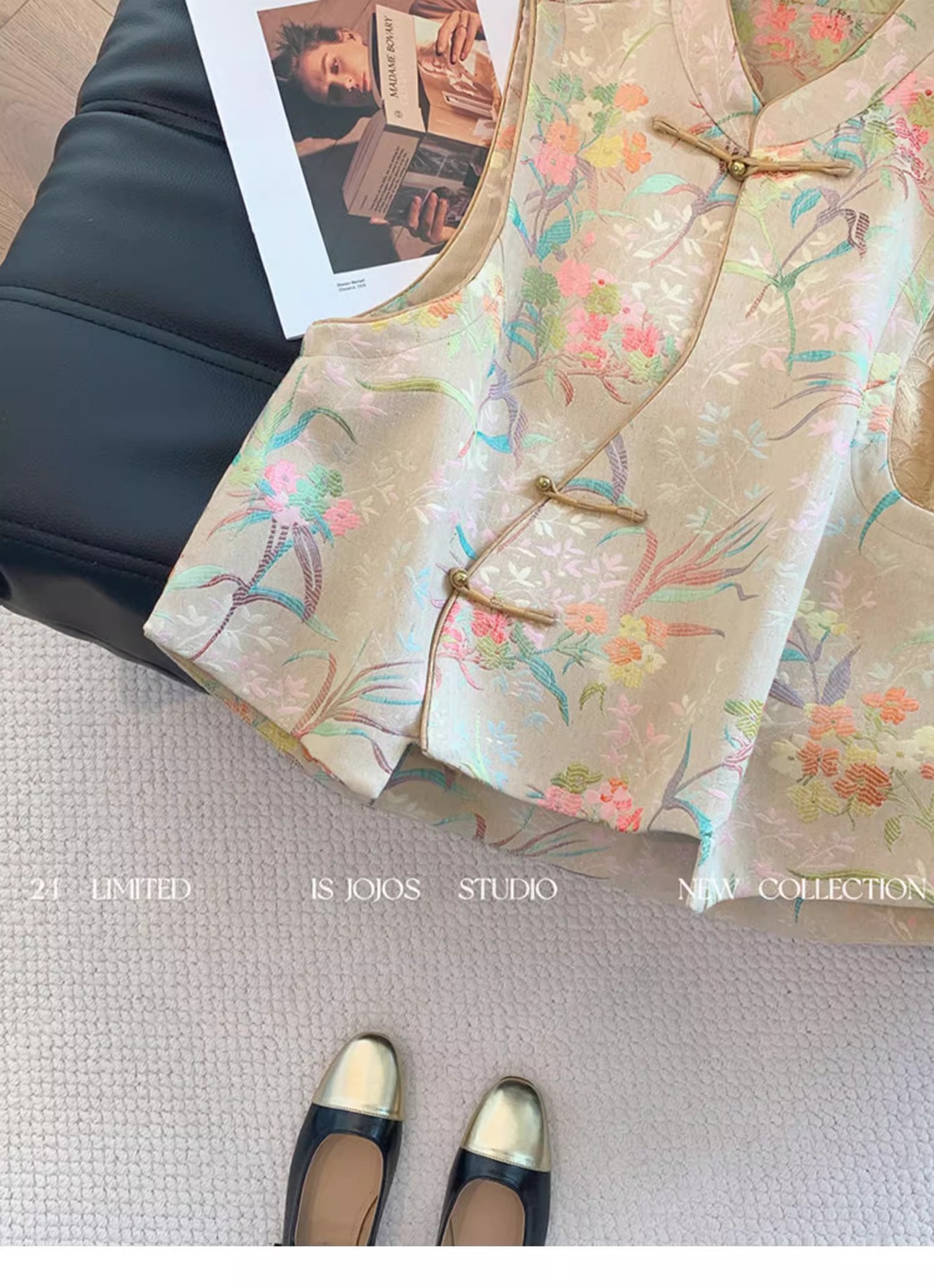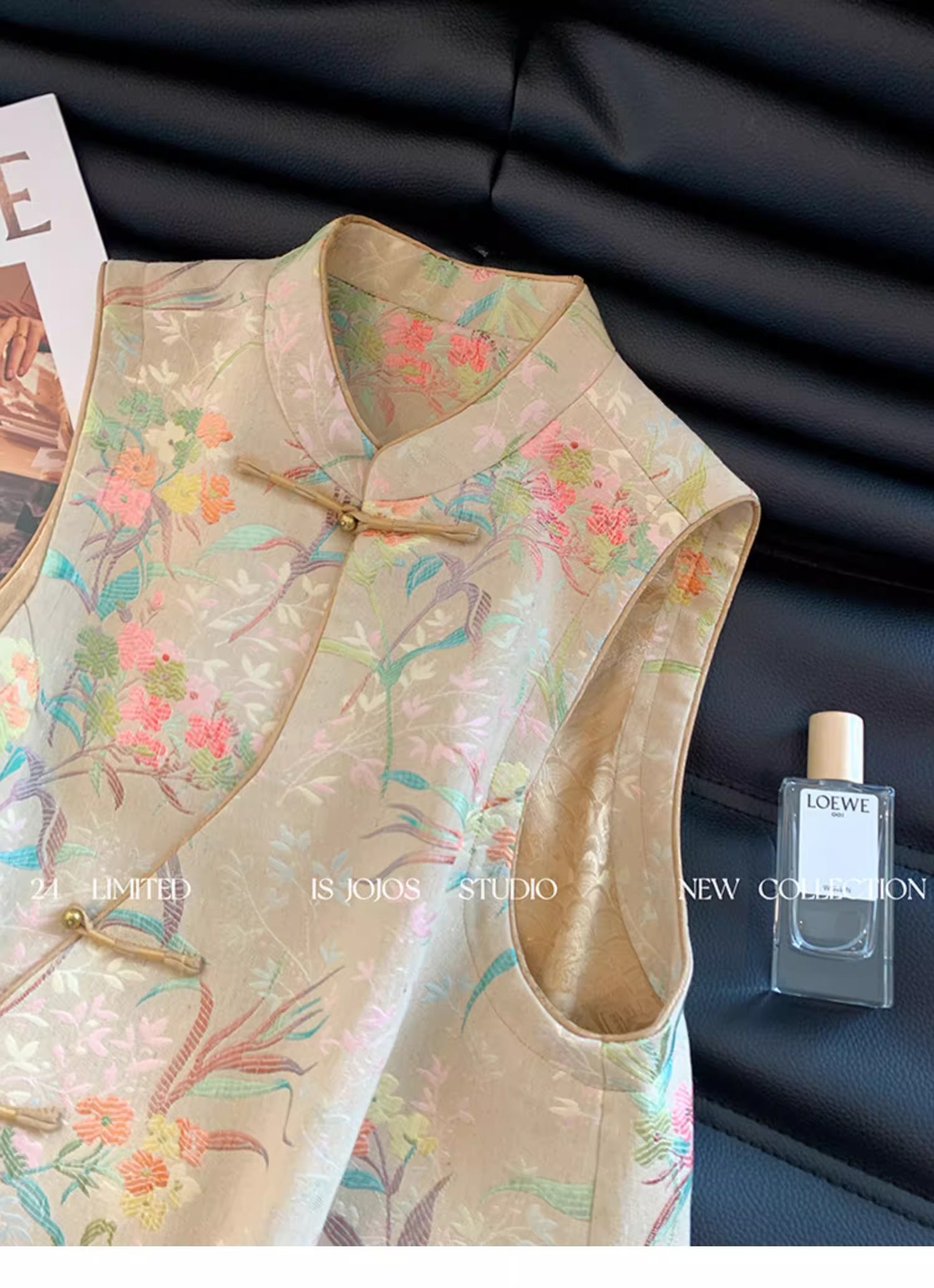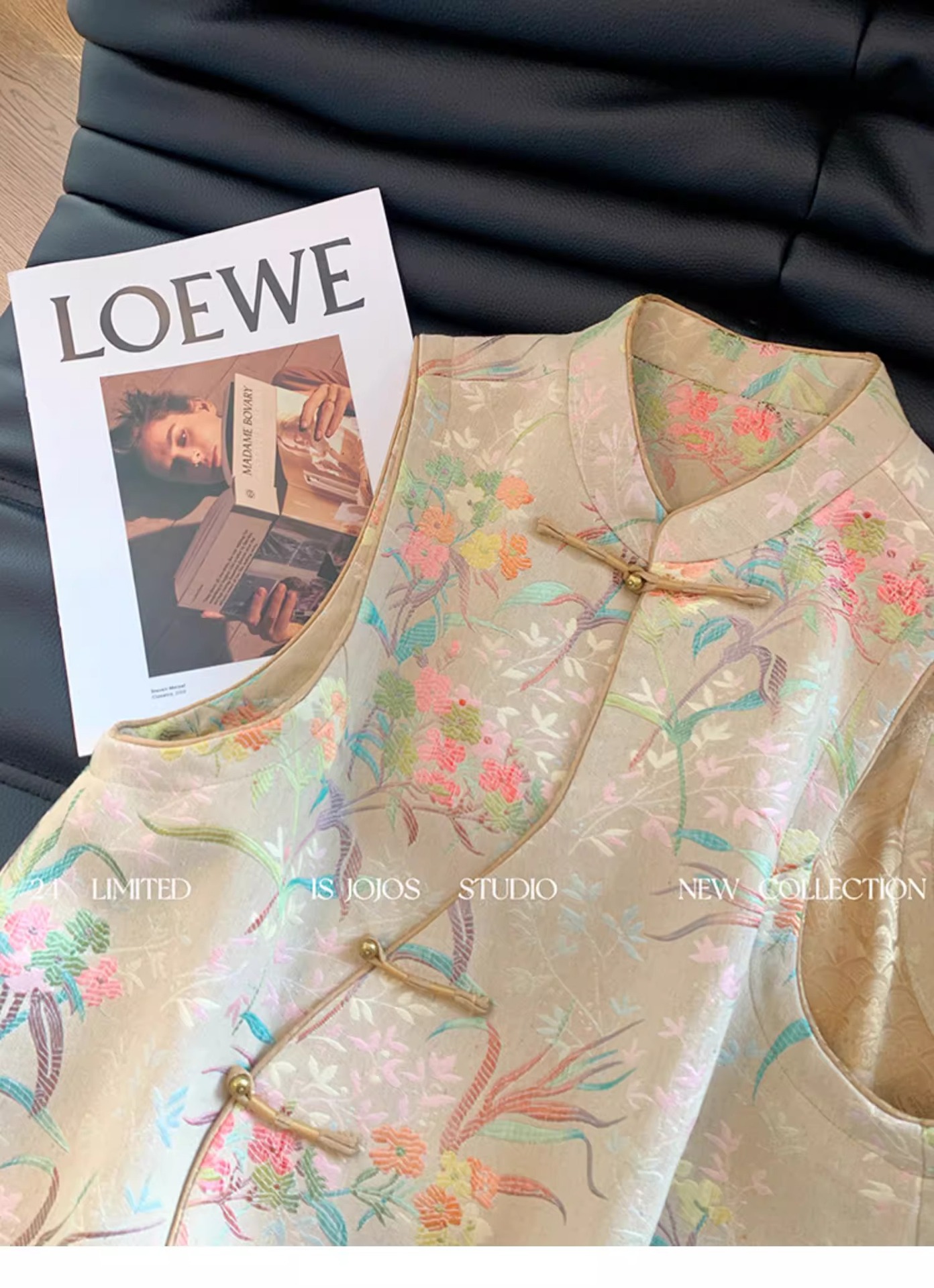 새로운 중국 자카드 조끼 여성의 봄 무형 문화 유산 송 버클 웨이스트 코트 조끼 국가 스타일 조끼