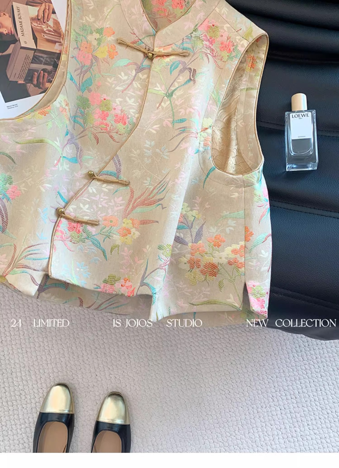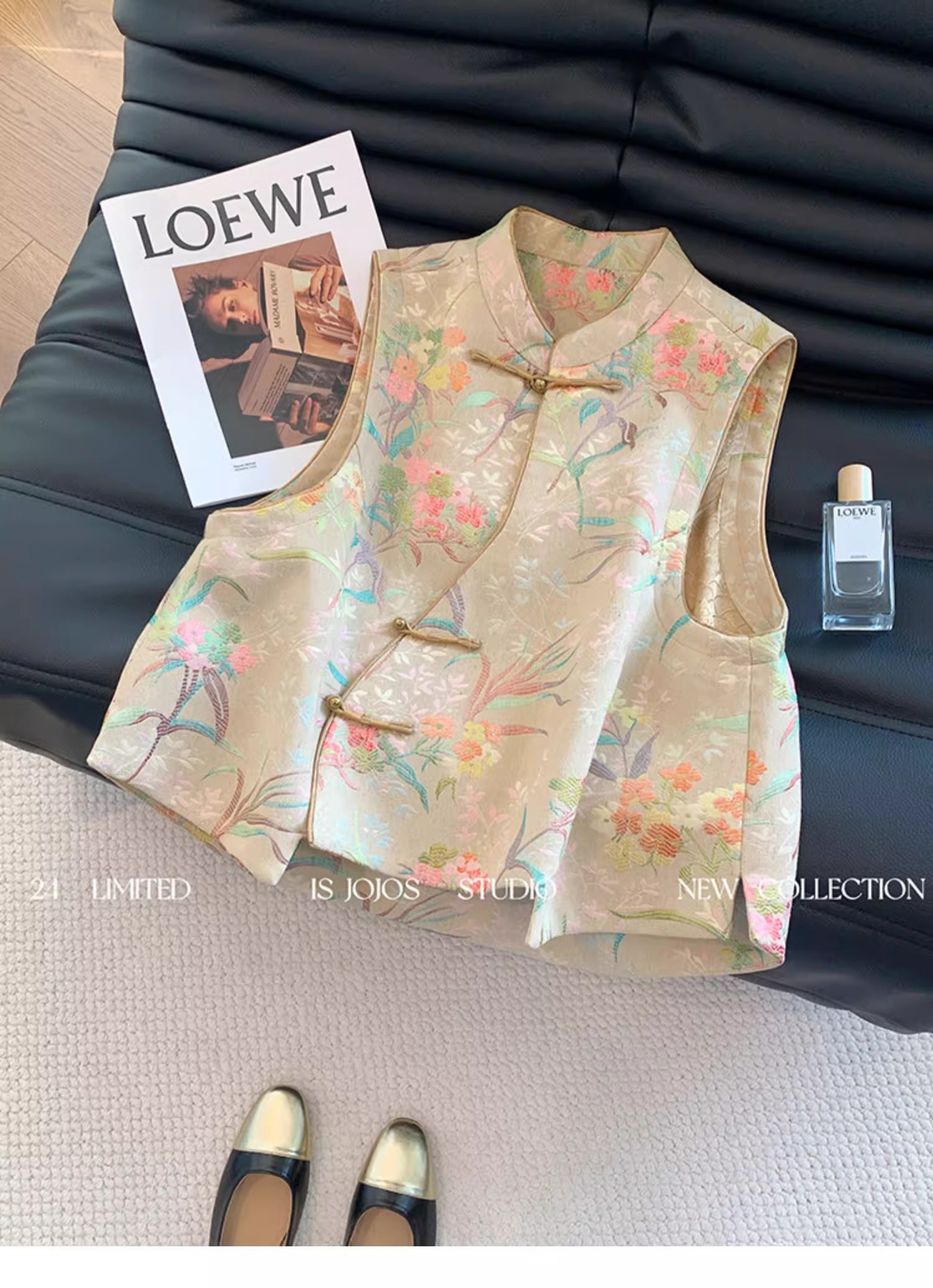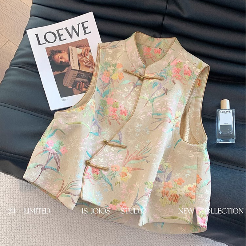 새로운 중국 자카드 조끼 여성의 봄 무형 문화 유산 송 버클 웨이스트 코트 조끼 국가 스타일 조끼스토어 가기