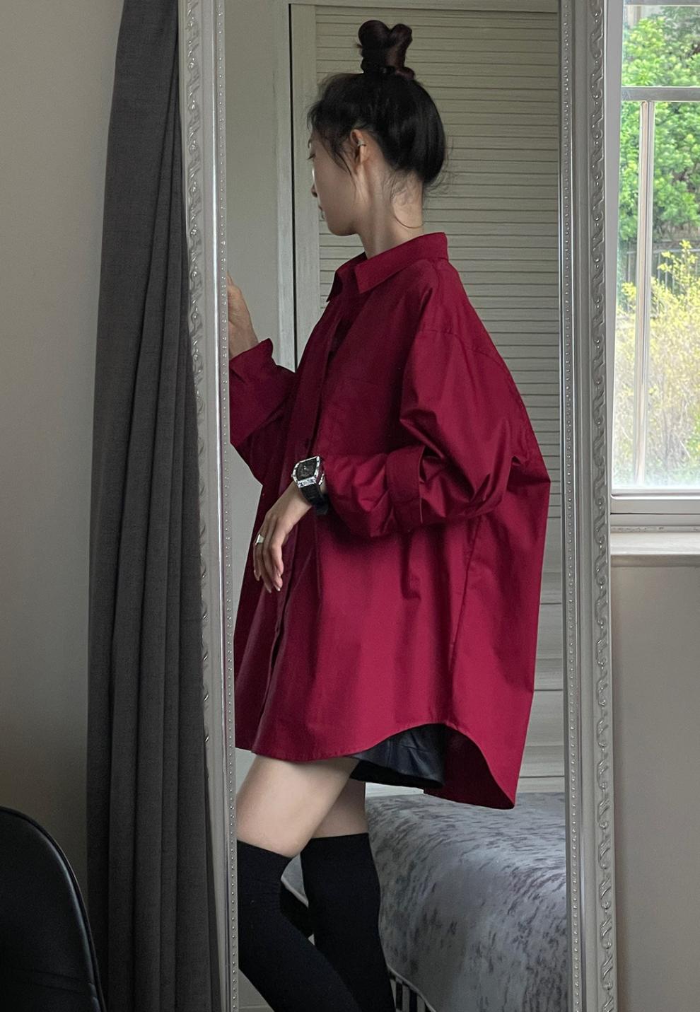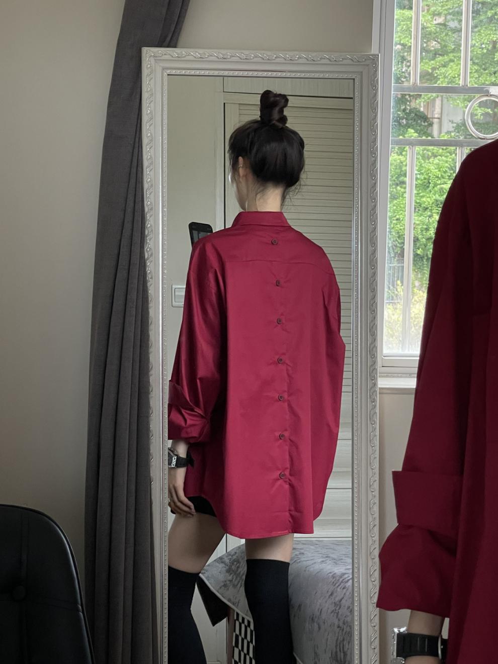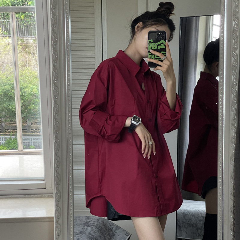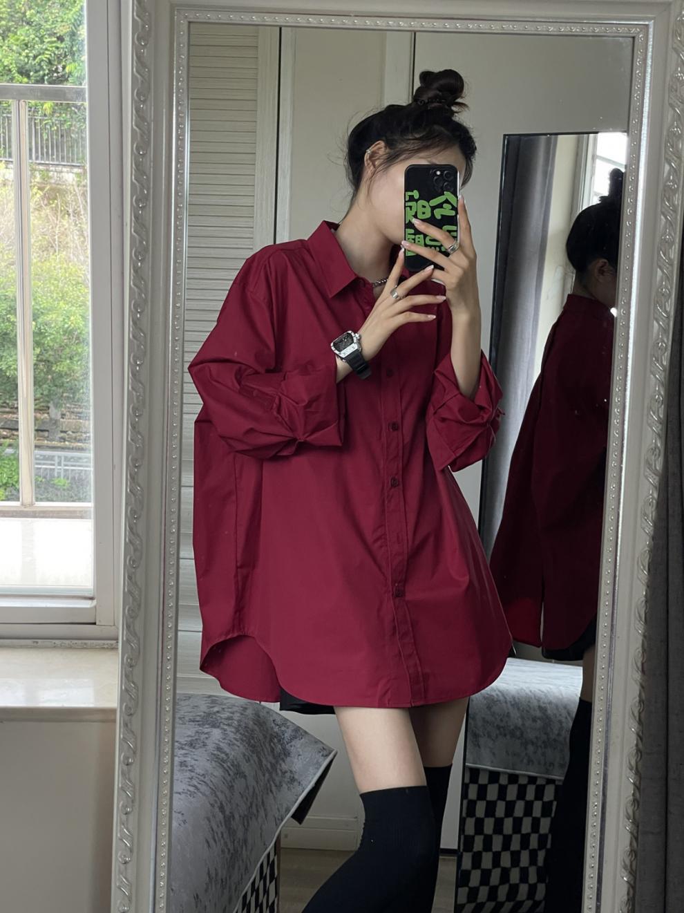 2024 버건디 중간 길이 셔츠 최고 여성의 등 장식 버클 디자인 센스 느슨한 긴 소매 캐주얼 코트스토어 가기