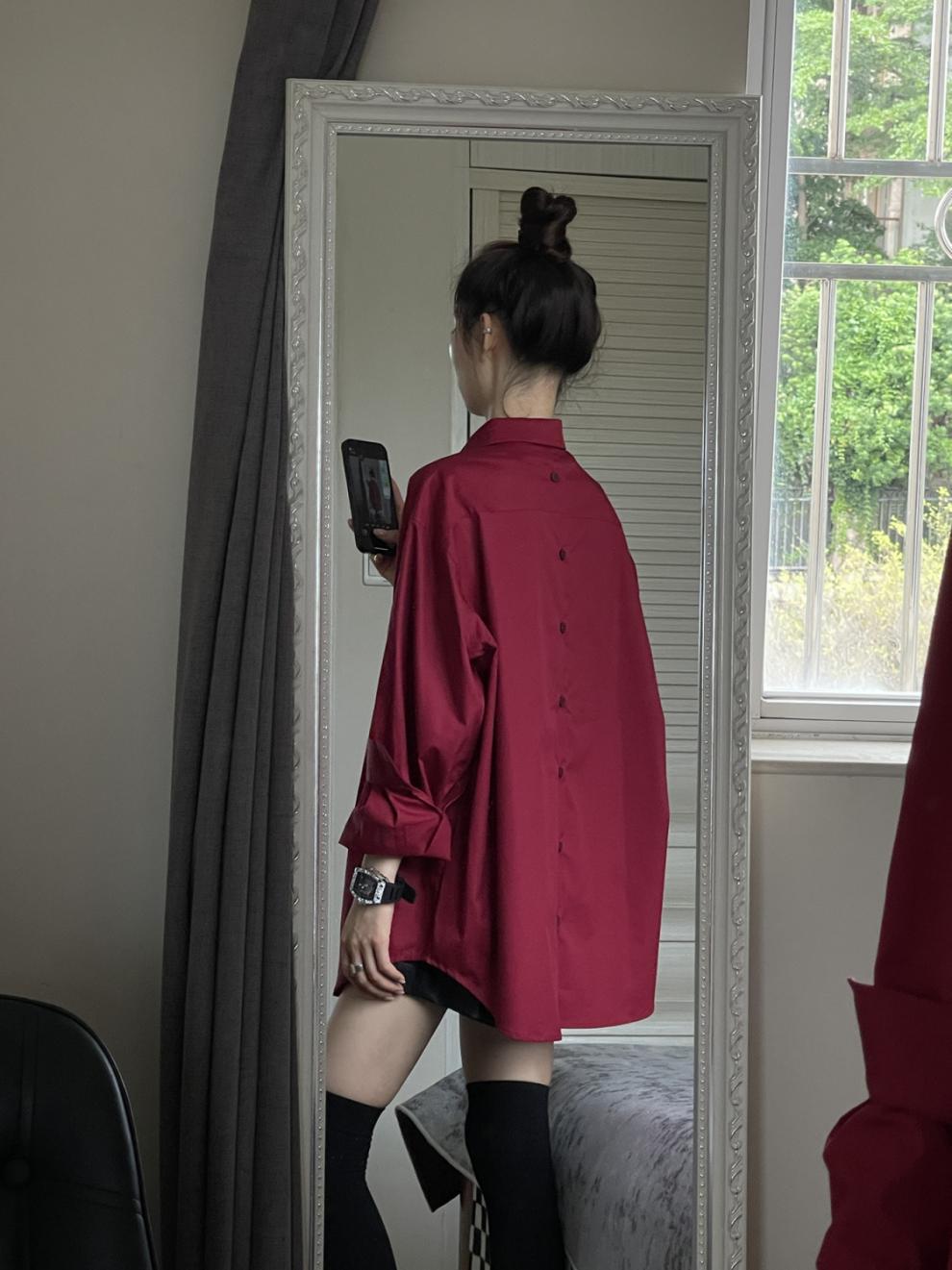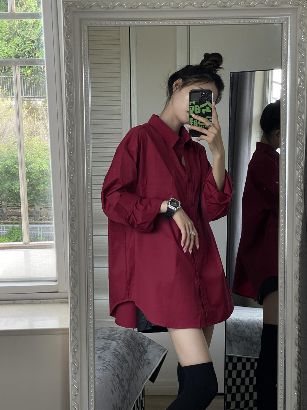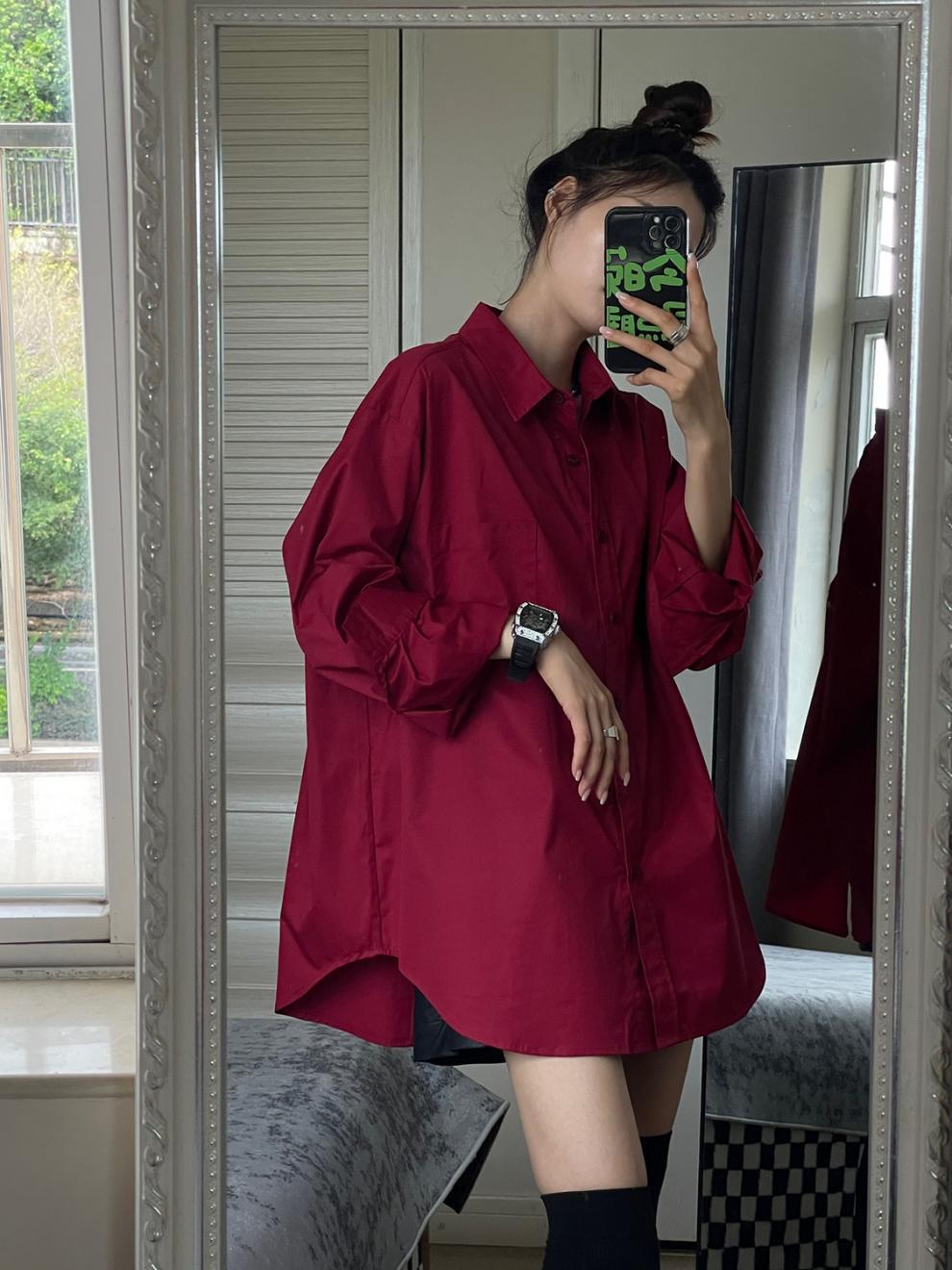 2024 버건디 중간 길이 셔츠 최고 여성의 등 장식 버클 디자인 센스 느슨한 긴 소매 캐주얼 코트스토어 가기