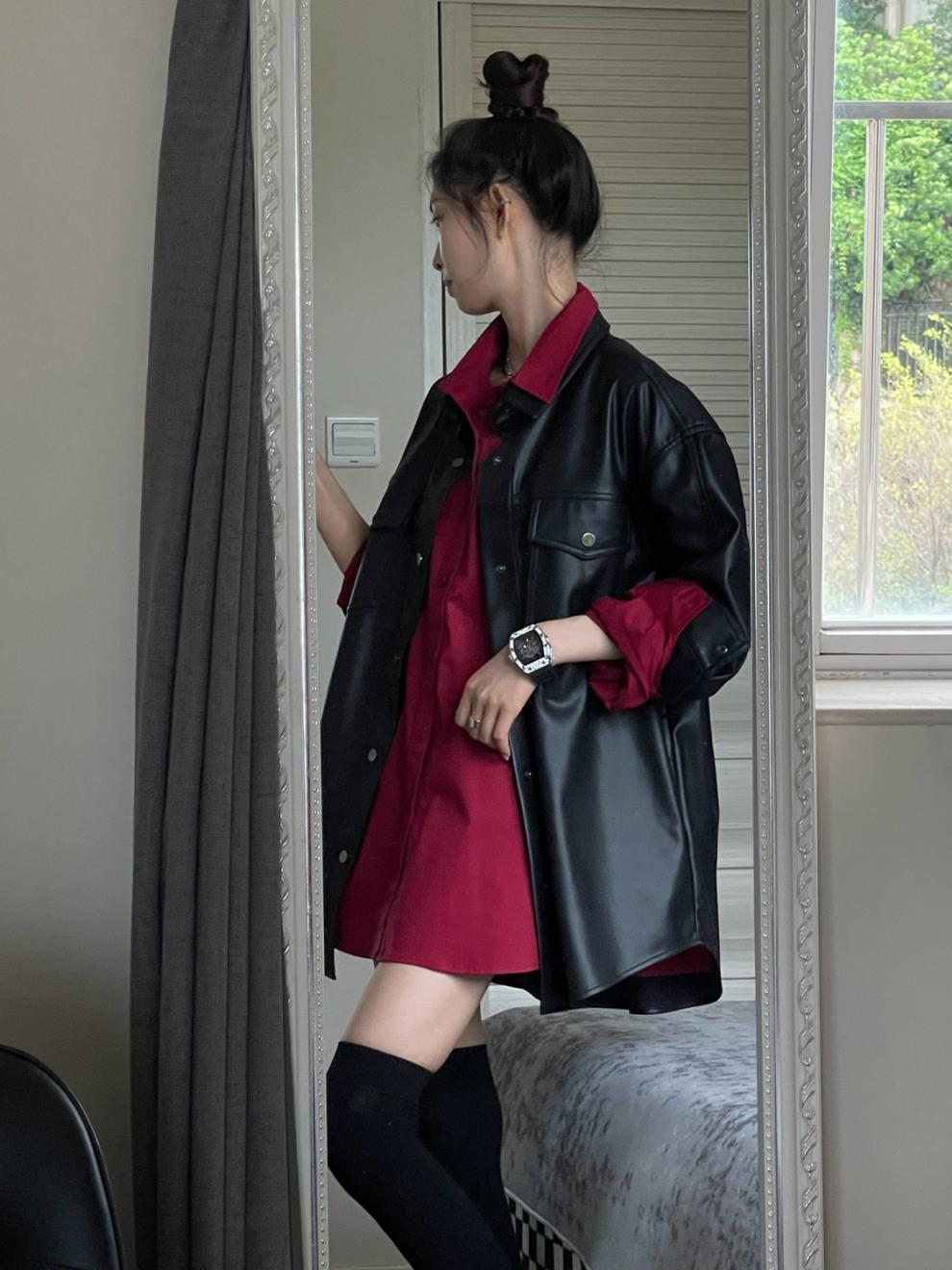 2024 버건디 중간 길이 셔츠 최고 여성의 등 장식 버클 디자인 센스 느슨한 긴 소매 캐주얼 코트