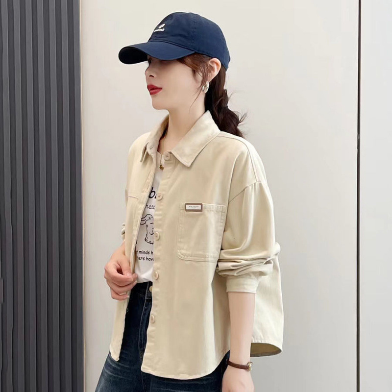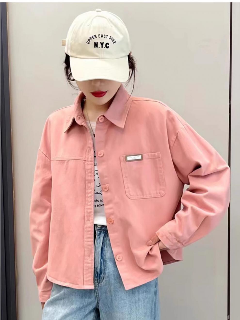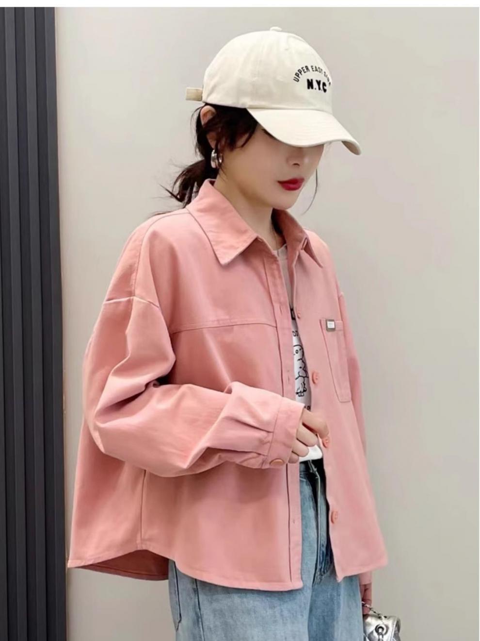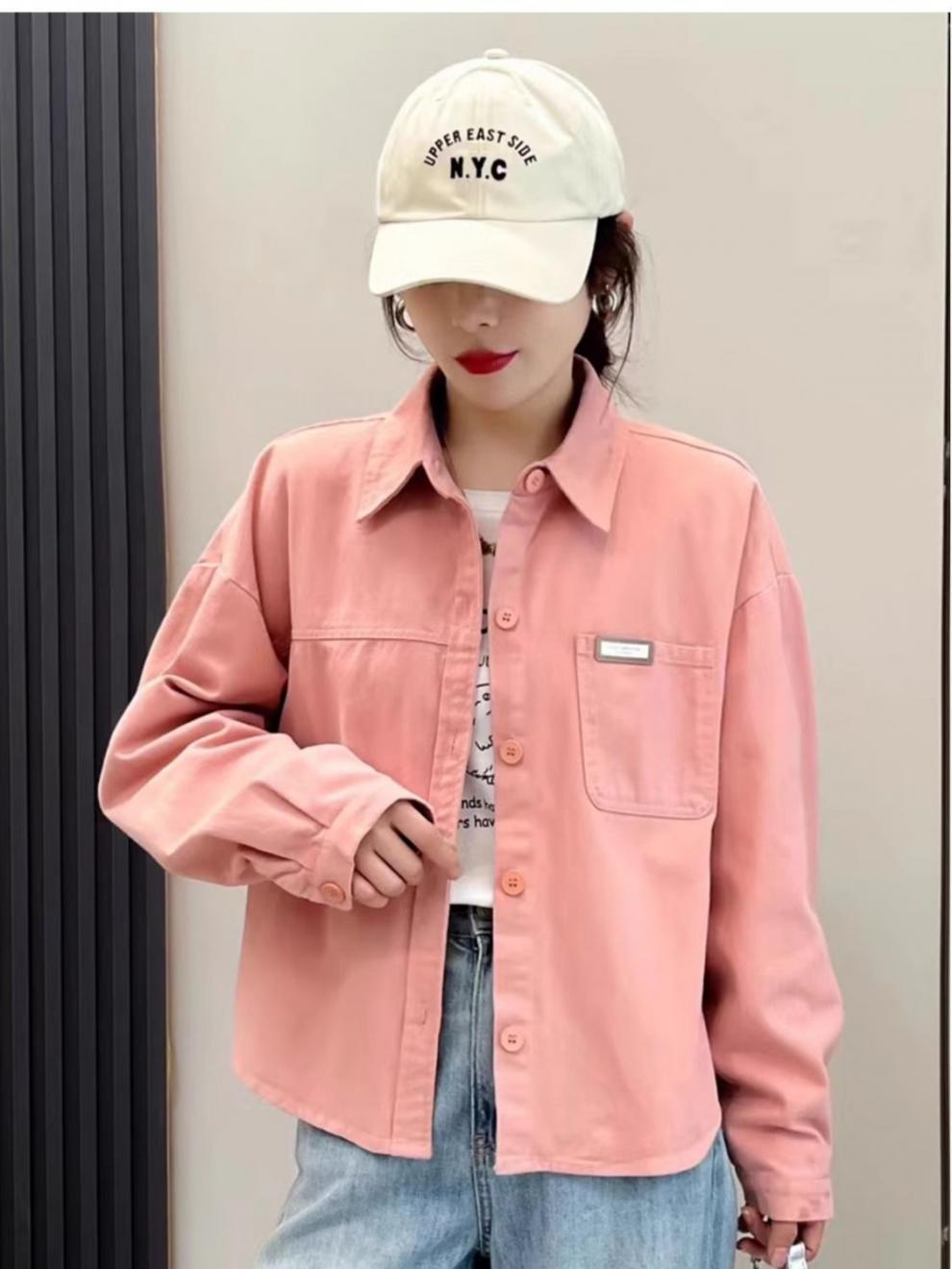 핑크 데님 코튼 쇼트 코트 여자 2024 가을 새로운 느슨한 캐주얼 올 매치 디자인 틈새 트렌디 셔츠스토어 가기