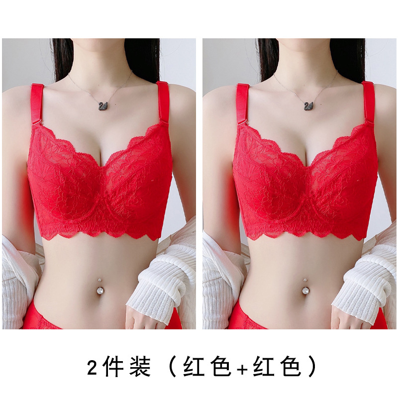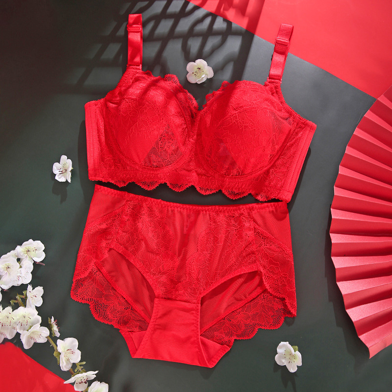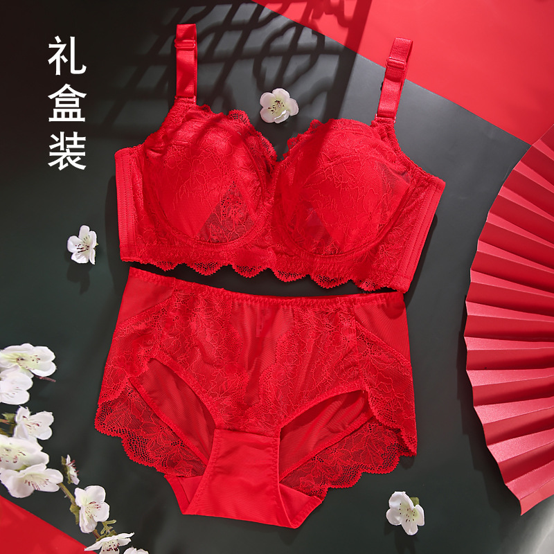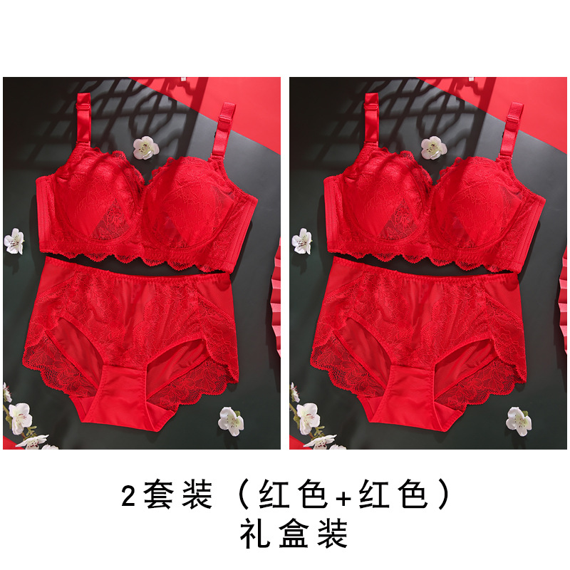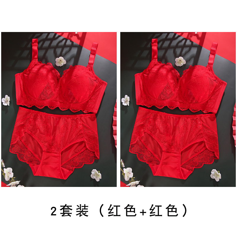토끼 귀 연탄 빨간 속옷 여성 세트 큰 가슴 작은 얇은 결혼식 신부 레이스 울트라 얇은 브래지어스토어 가기