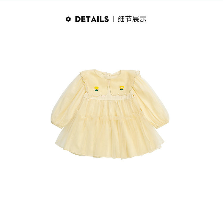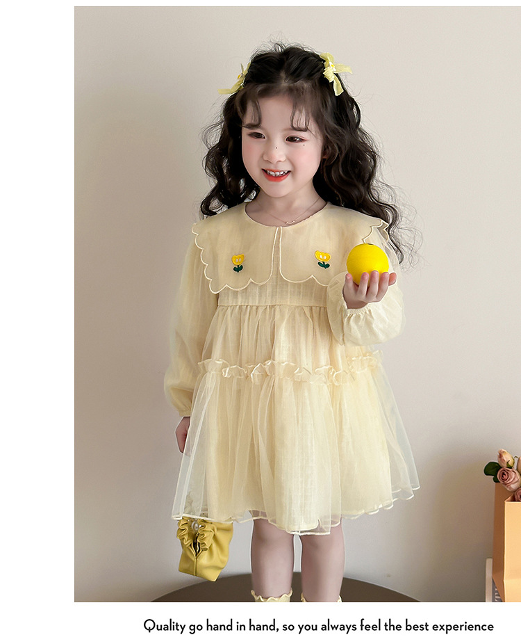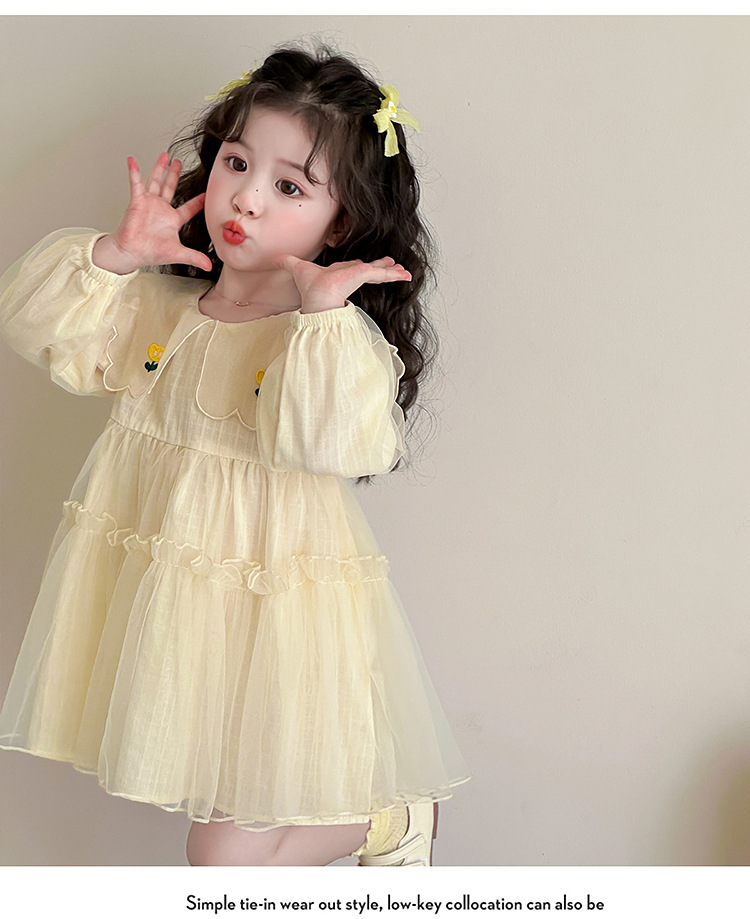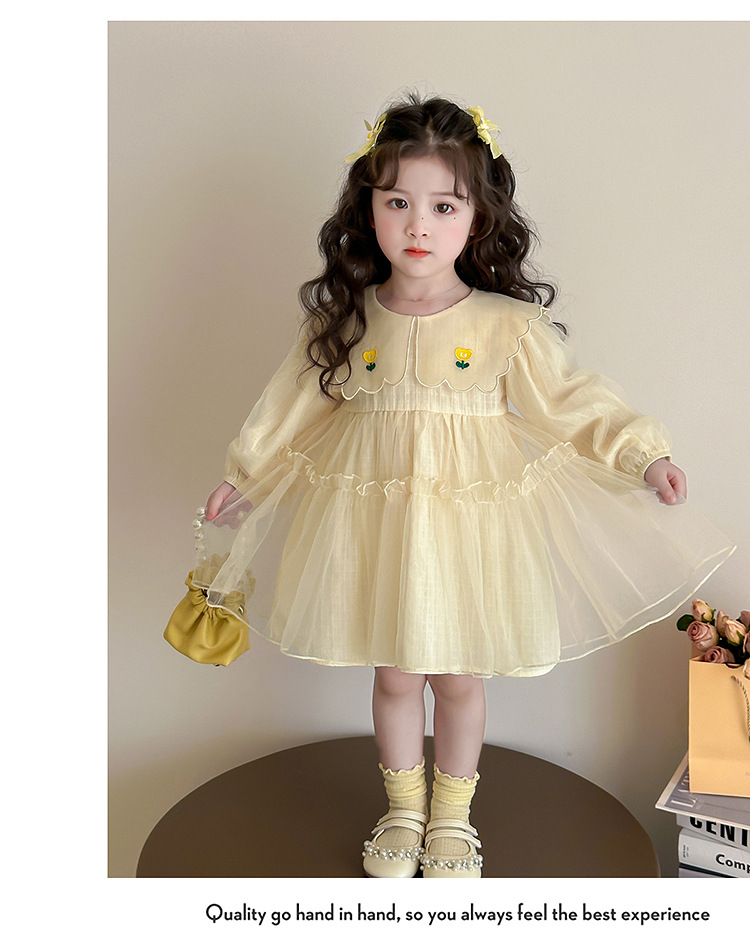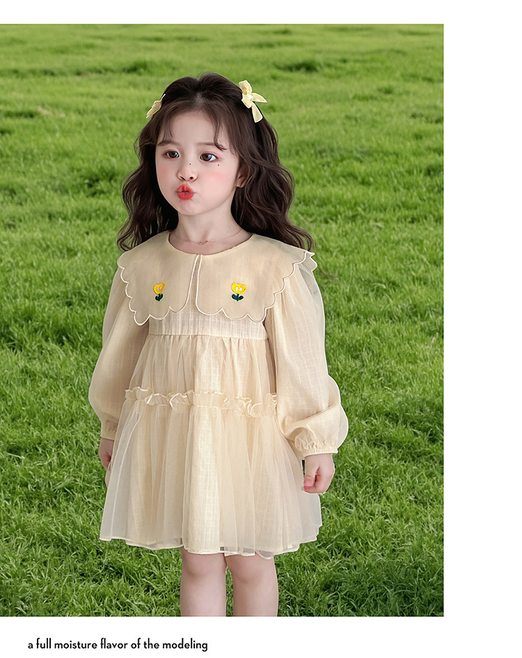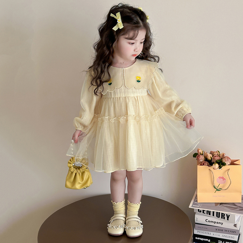 봄 2025 봄 새로운 여성 아동복 수 놓은 인형 칼라 메쉬 원피스 어린이 공주 원피스 봄과 가을스토어 가기