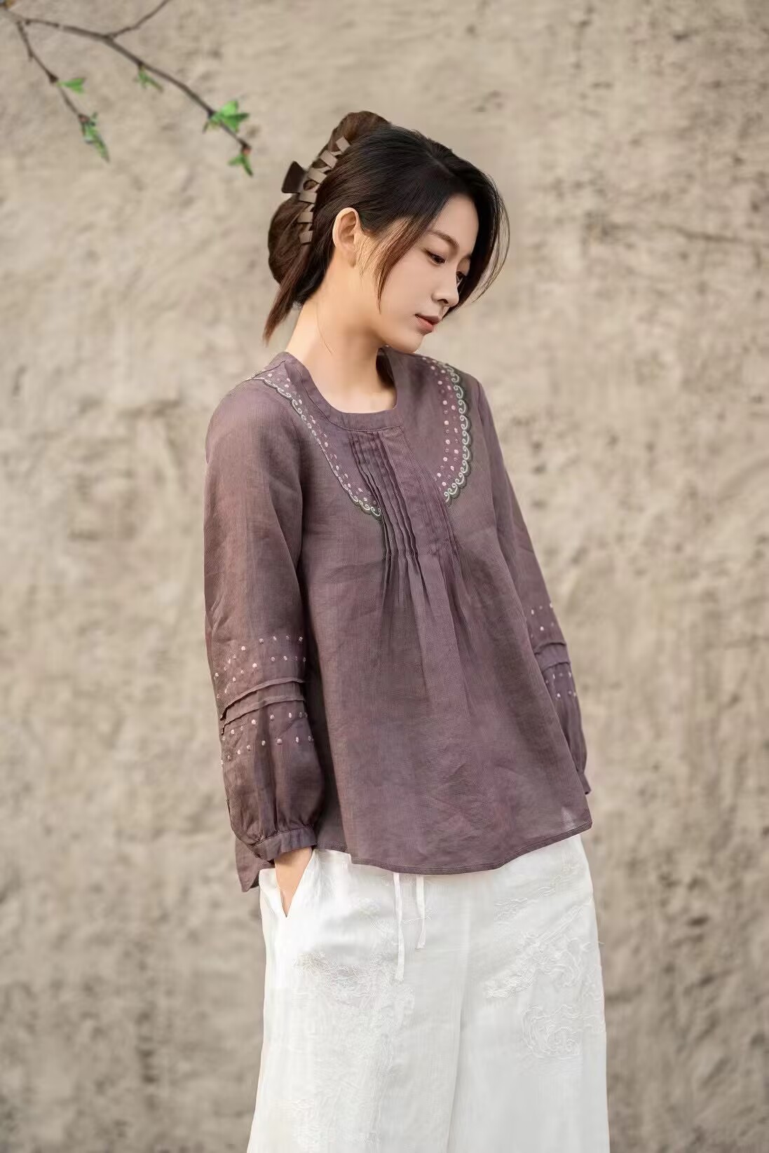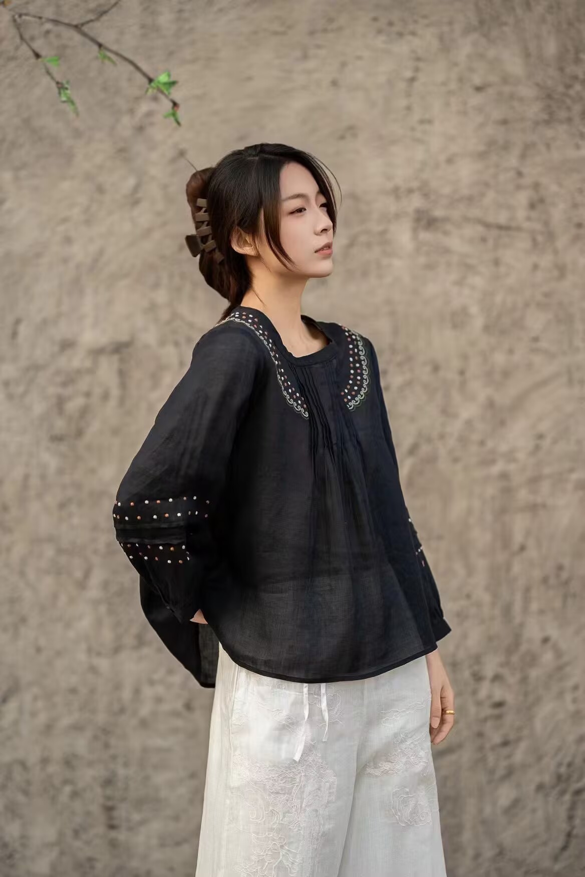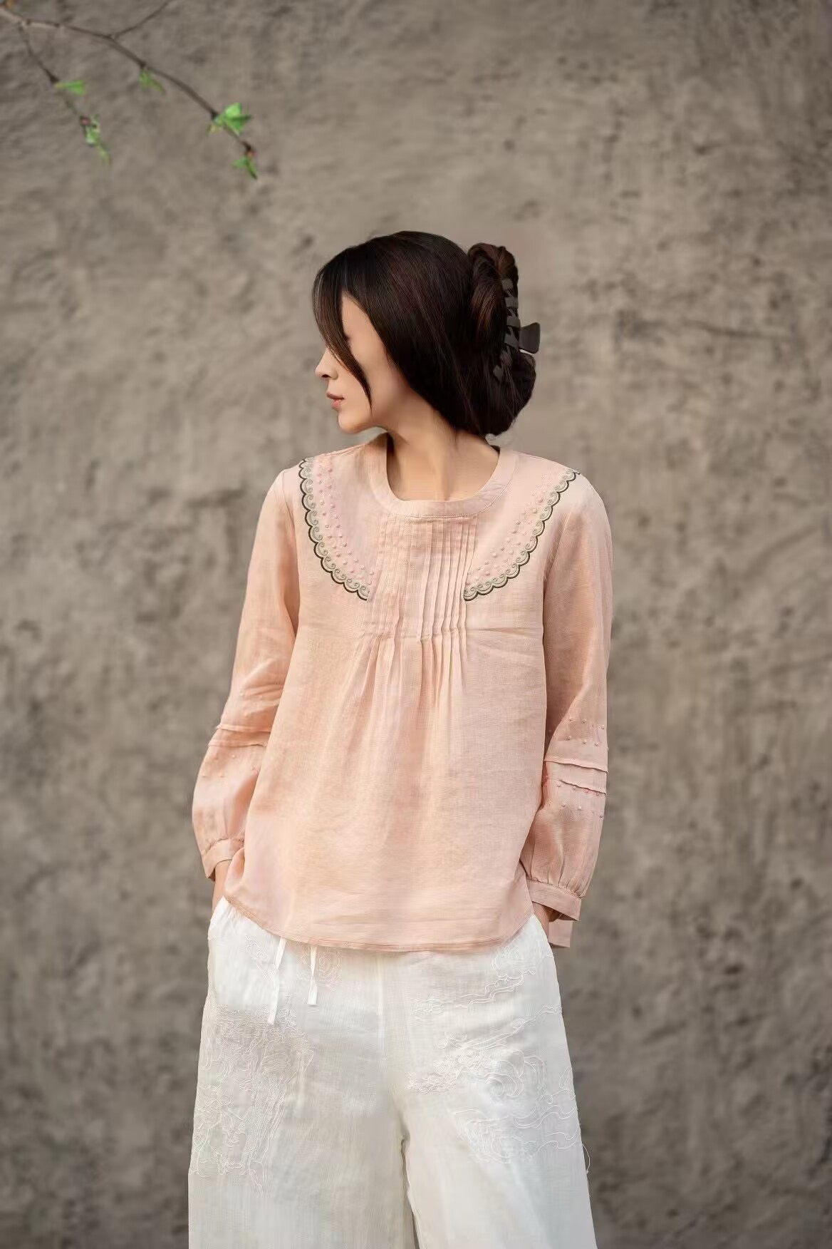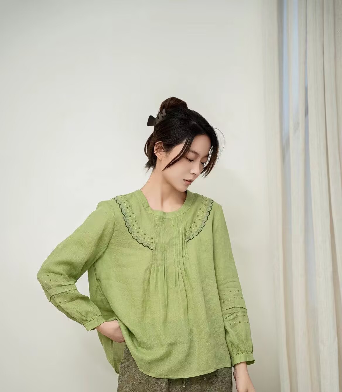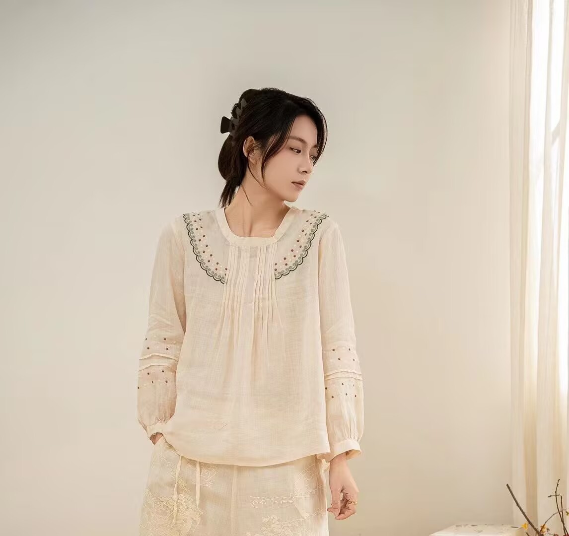 빈티지 오르간 주름 레이스 셔츠 2025 봄 새로운 올매치 예술적 느슨한 자수 긴 소매 탑스토어 가기