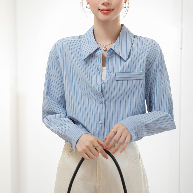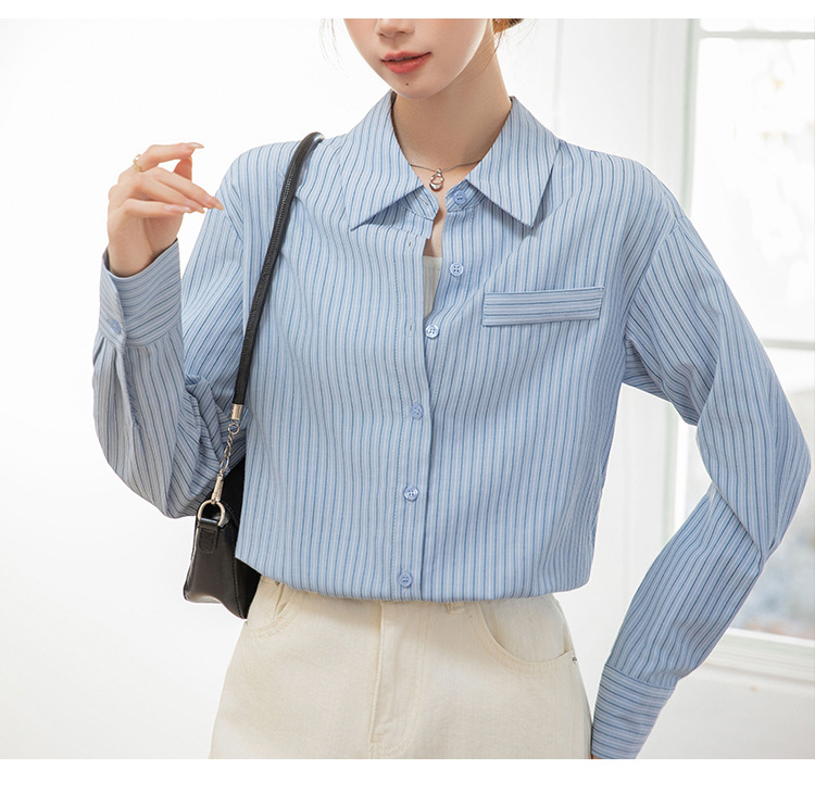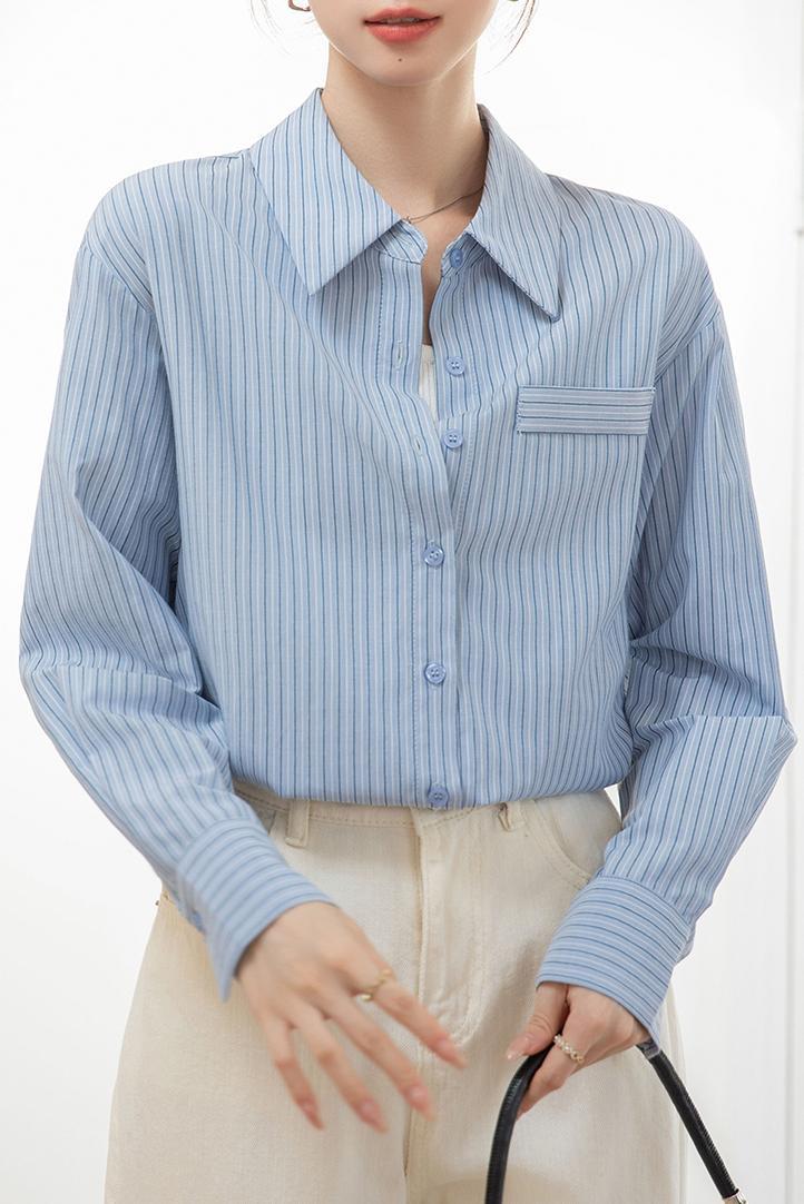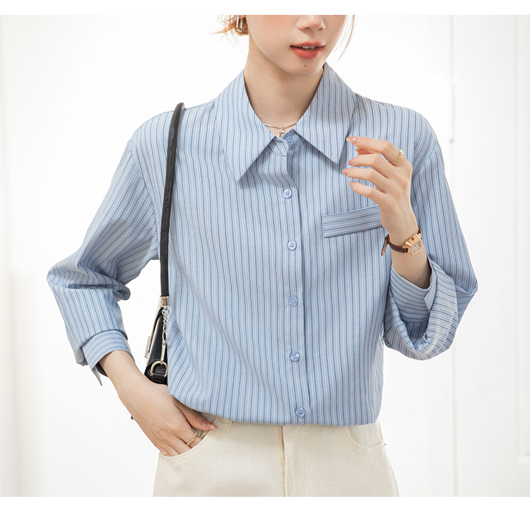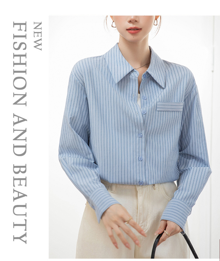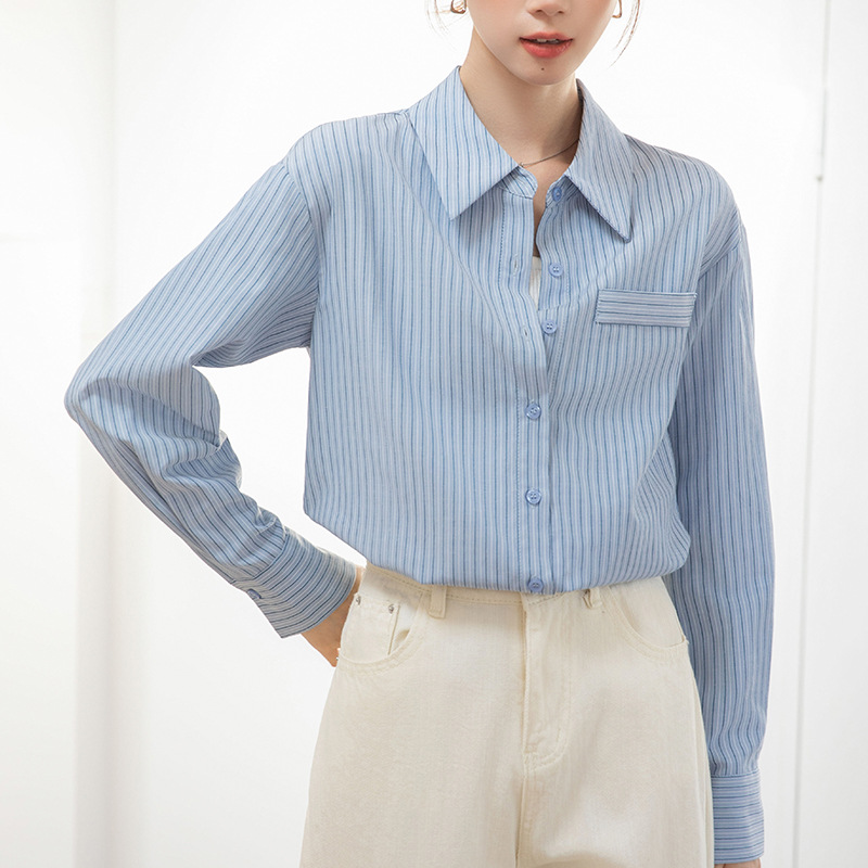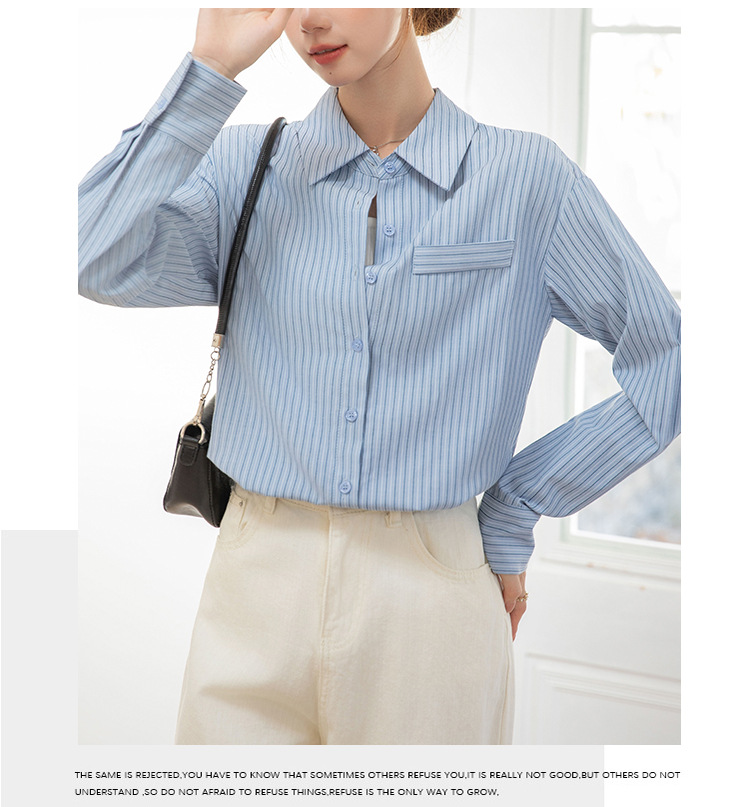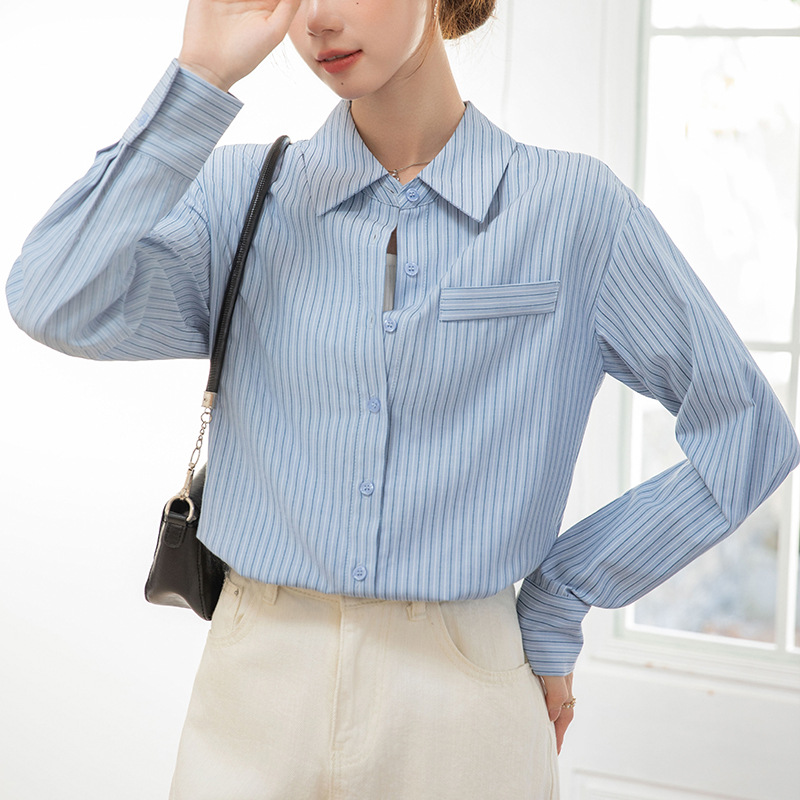 2025 리얼 샷 블루 스트라이프 셔츠 여자 봄 새로운 내부 탑 통근 올 매치 셔츠스토어 가기