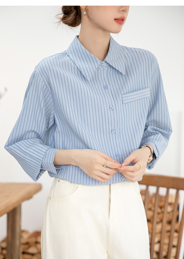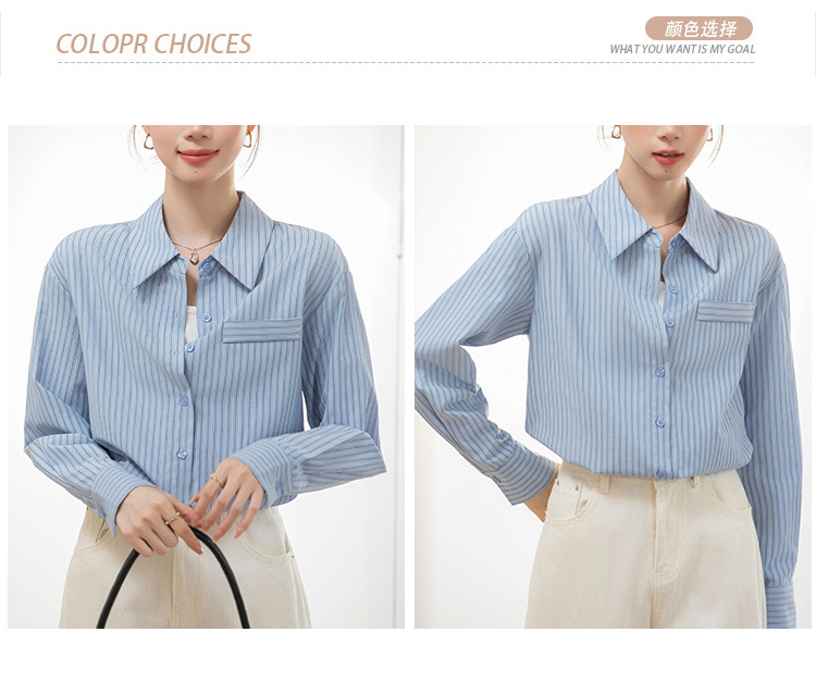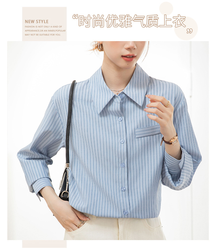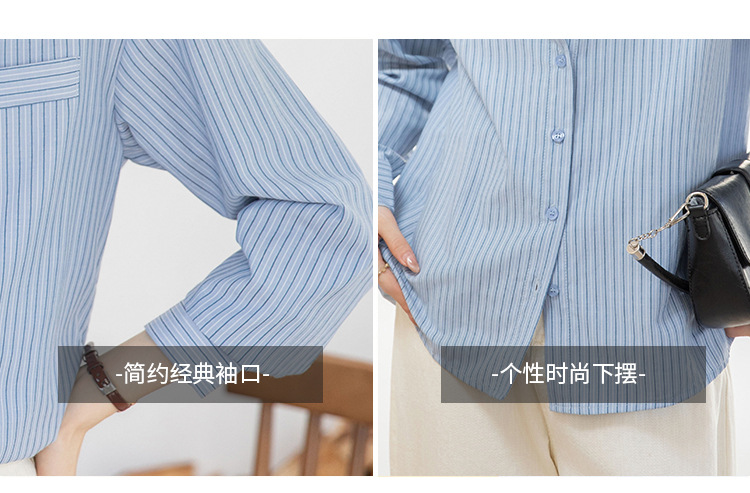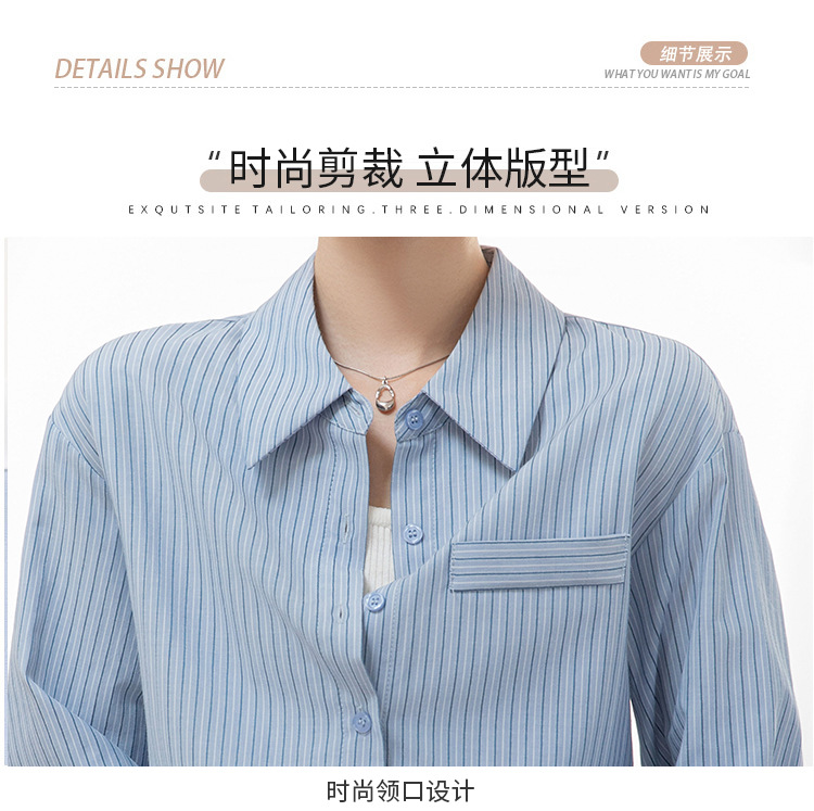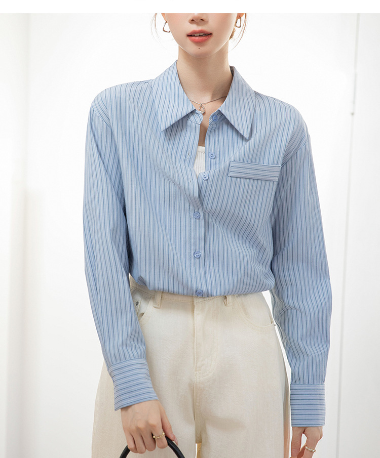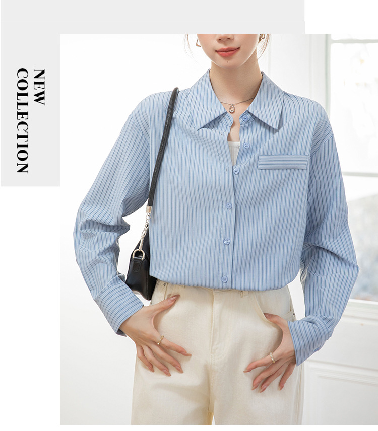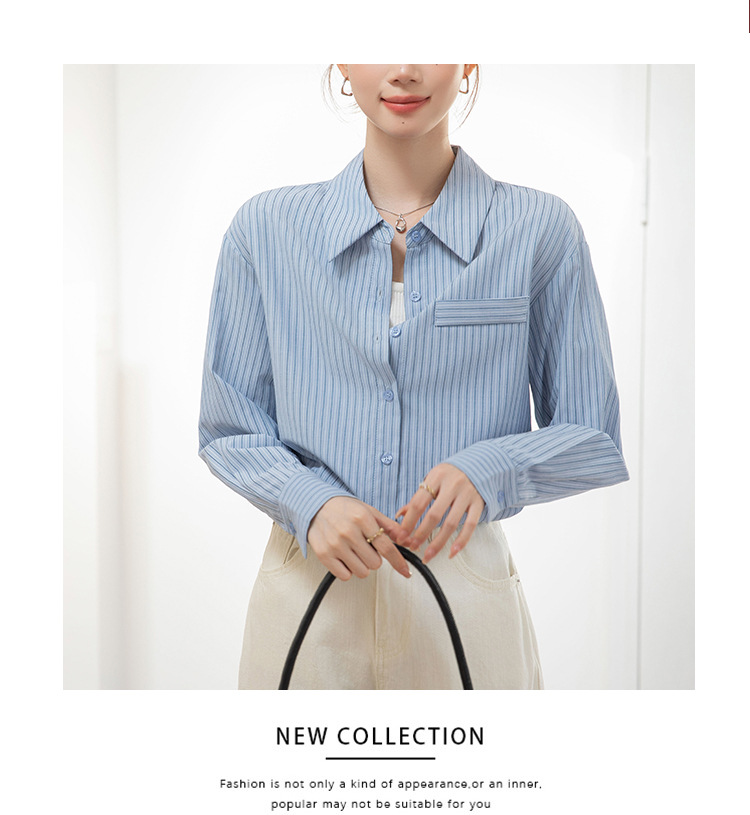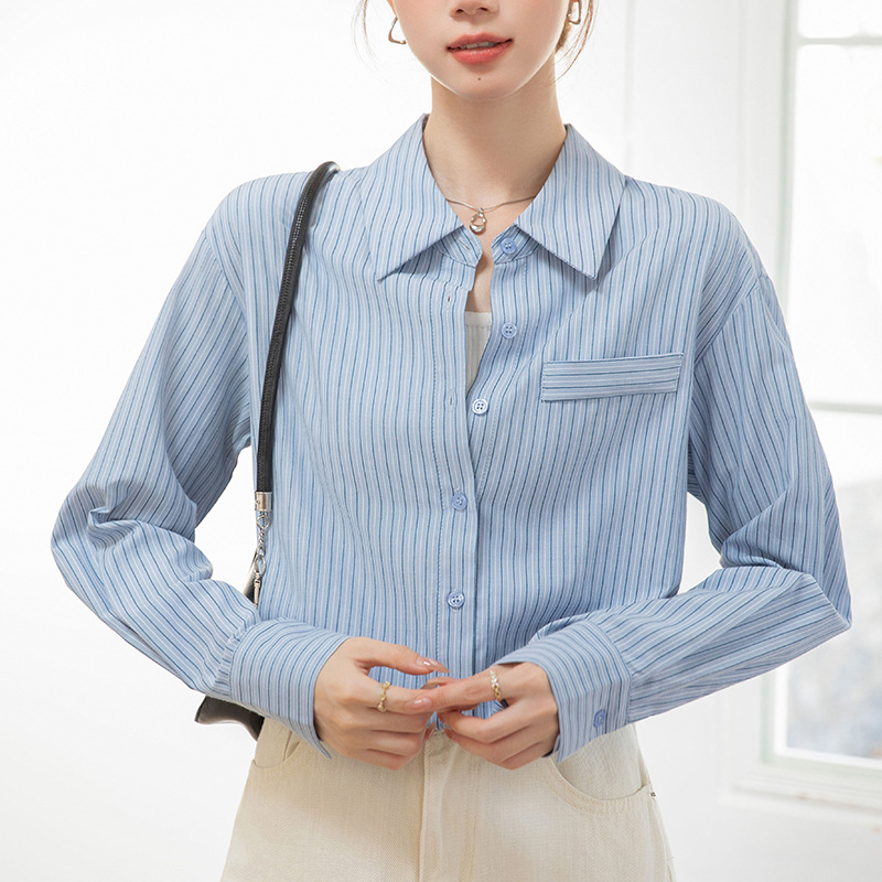 2025 리얼 샷 블루 스트라이프 셔츠 여자 봄 새로운 내부 탑 통근 올 매치 셔츠스토어 가기