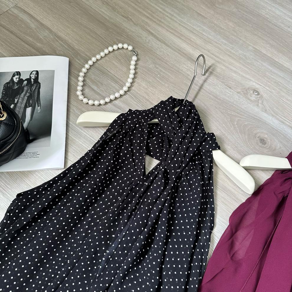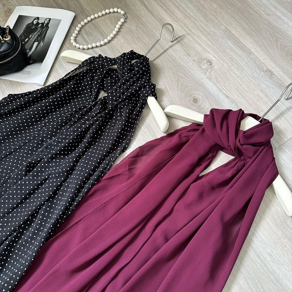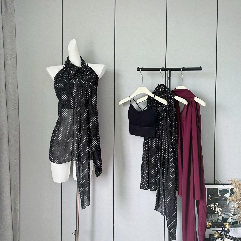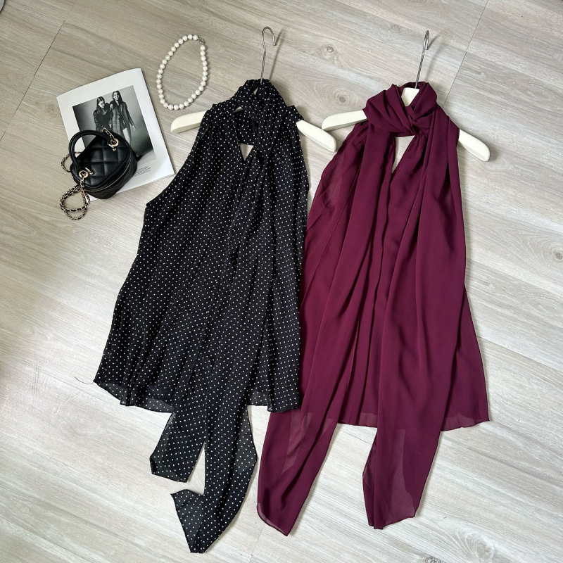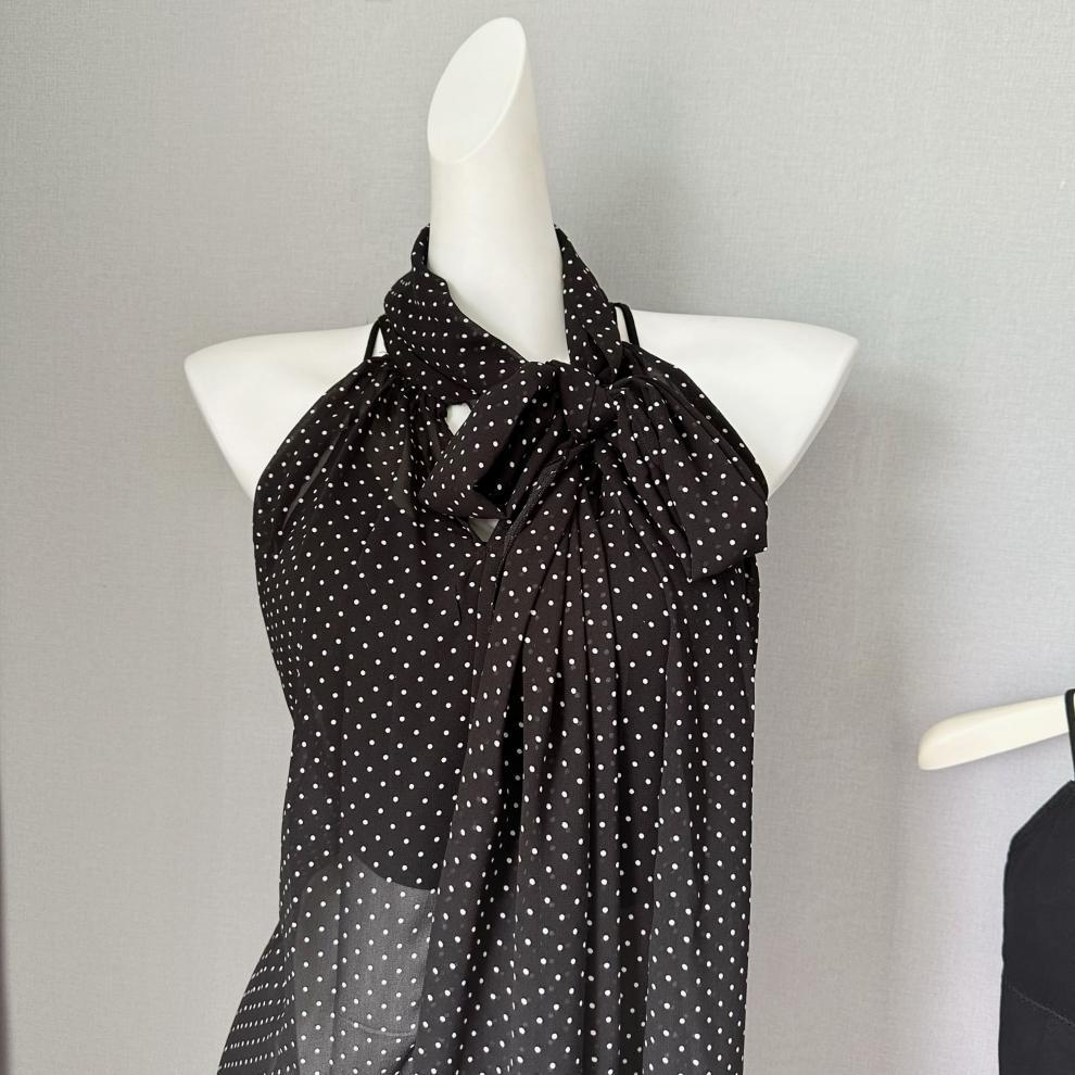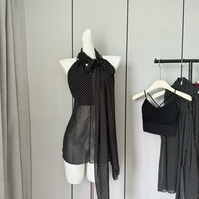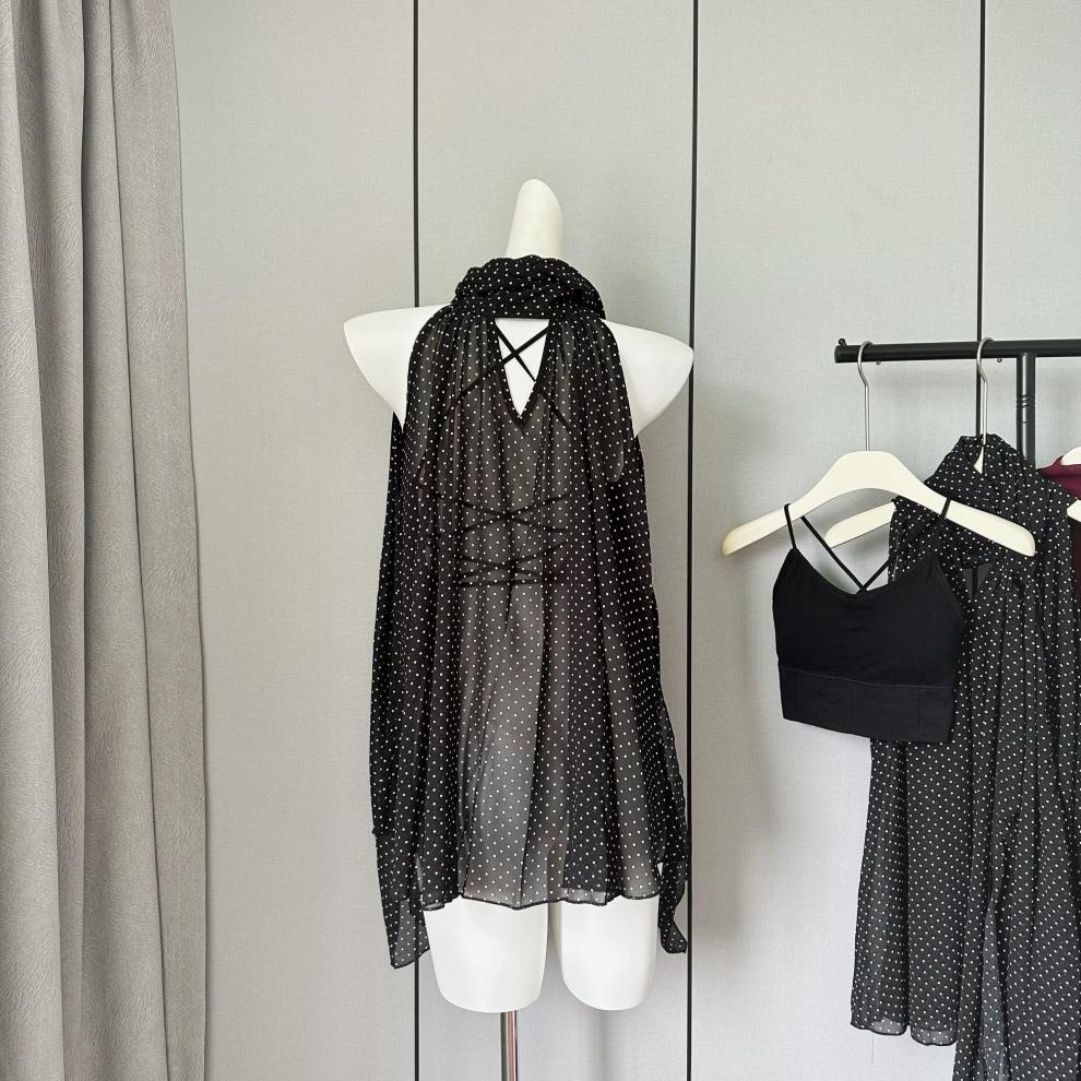 보라색 민소매 리본 쉬폰 커버 시스루 탑 여성