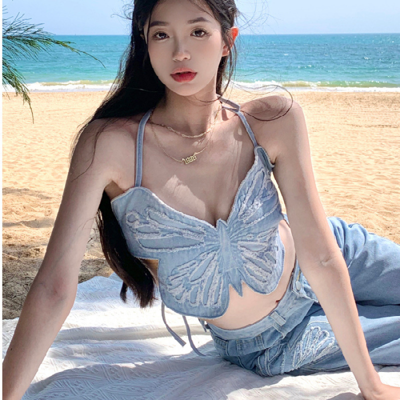 여름 나비 데님 Halter Camisole 여성의 여름 내복 외주 디자인 프랑스 스위트 탑스토어 가기