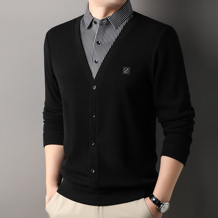 2025 봄과 가을 새로운 가짜 투피스 티셔츠 남성용 긴팔 셔츠 칼라 스트라이프 티셔츠 중년 아빠 탑 남성복
