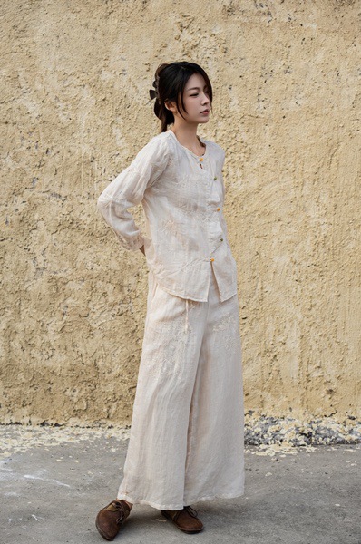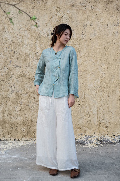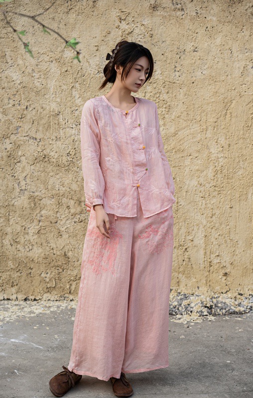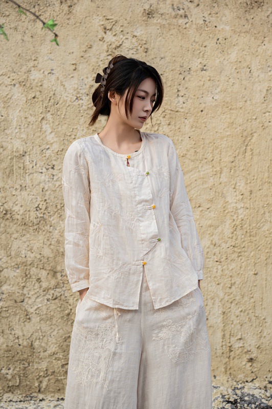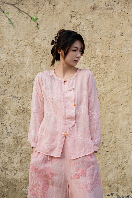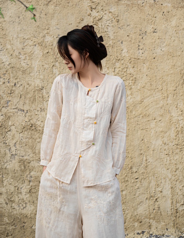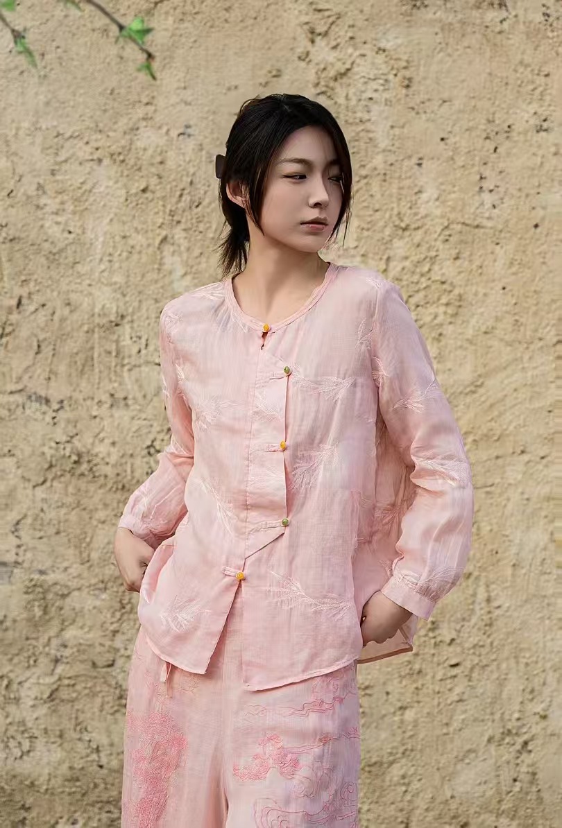 중공업 전체 자수 크루 넥 컬러 버튼 셔츠 여성의 2025 봄 예술 레트로 느슨한 슬리밍 올 매치 셔츠