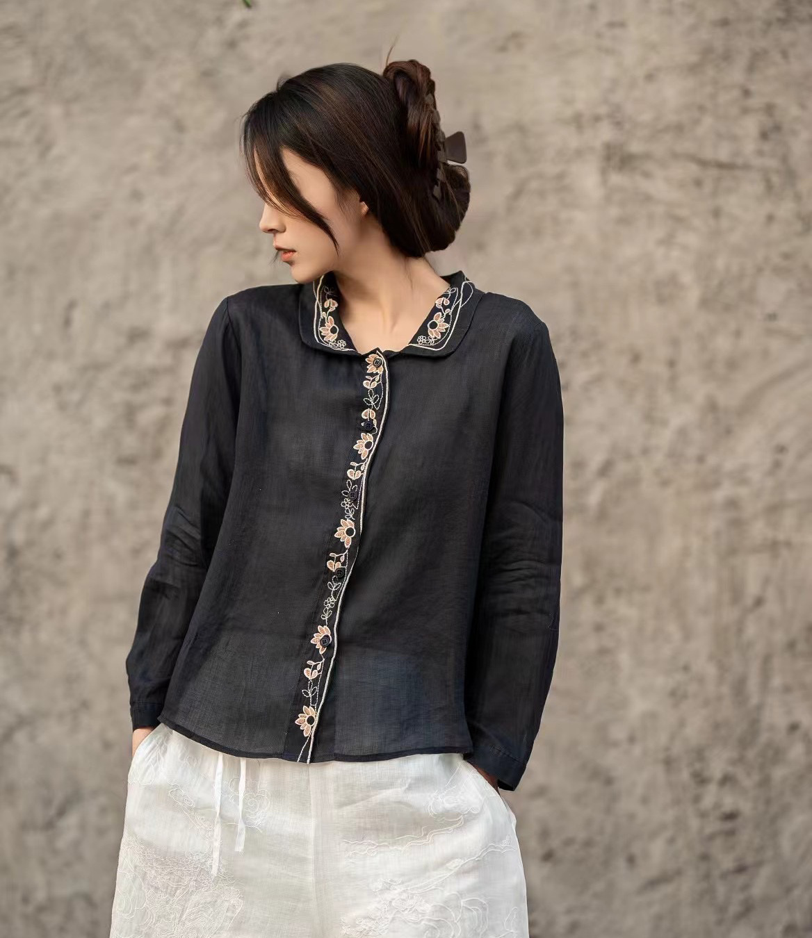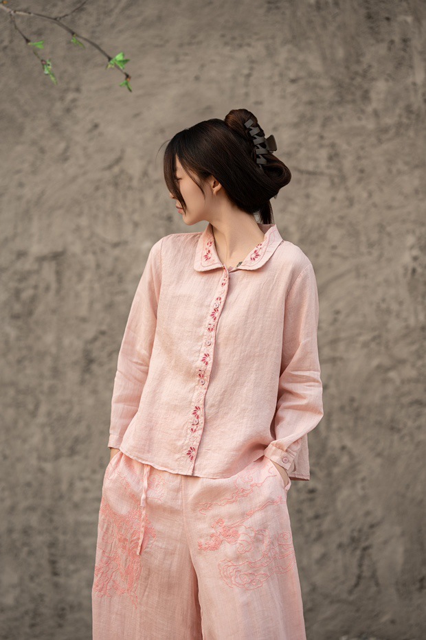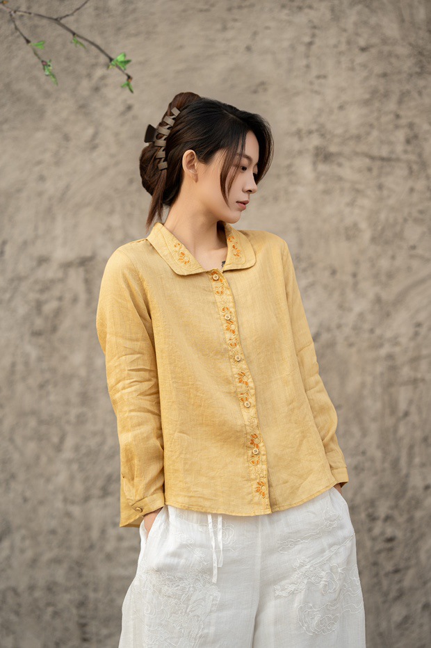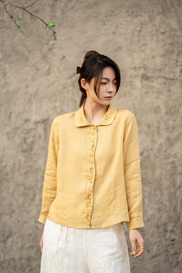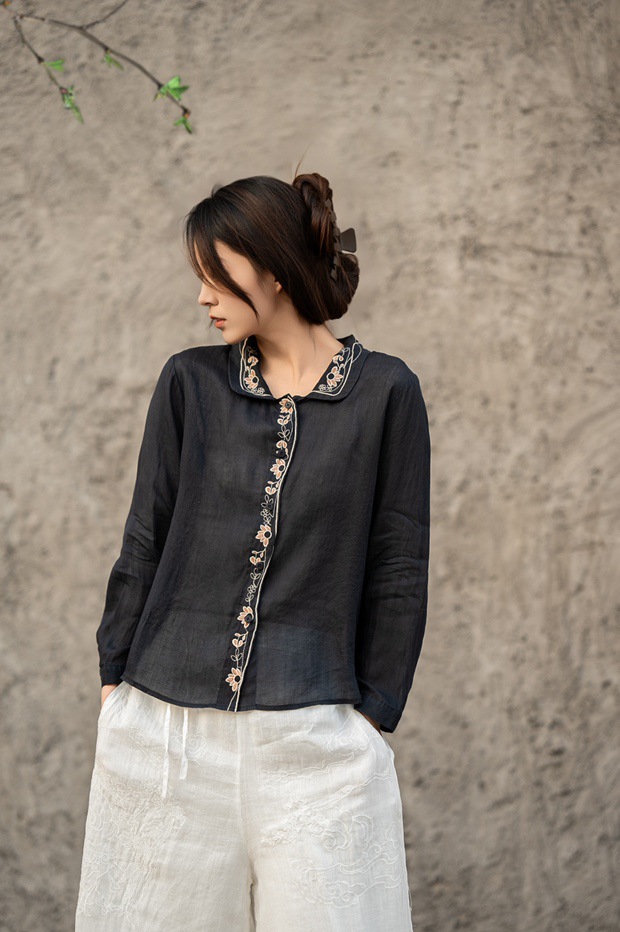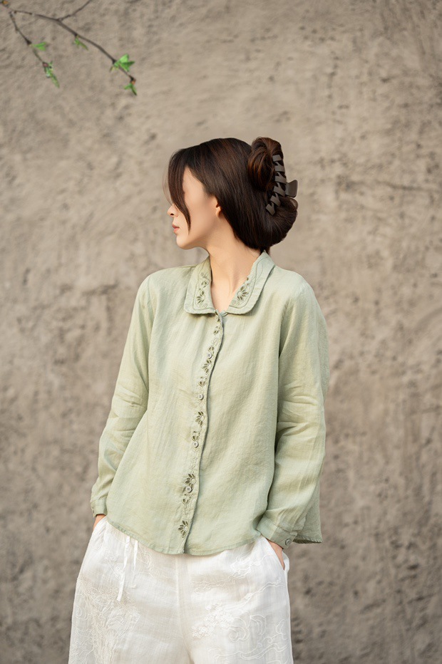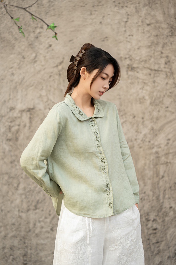 봄 2025 한국식 심플 루즈 슬림 자수 옷깃 긴팔 셔츠 여성을위한 올 매치 문학 스타일 셔츠