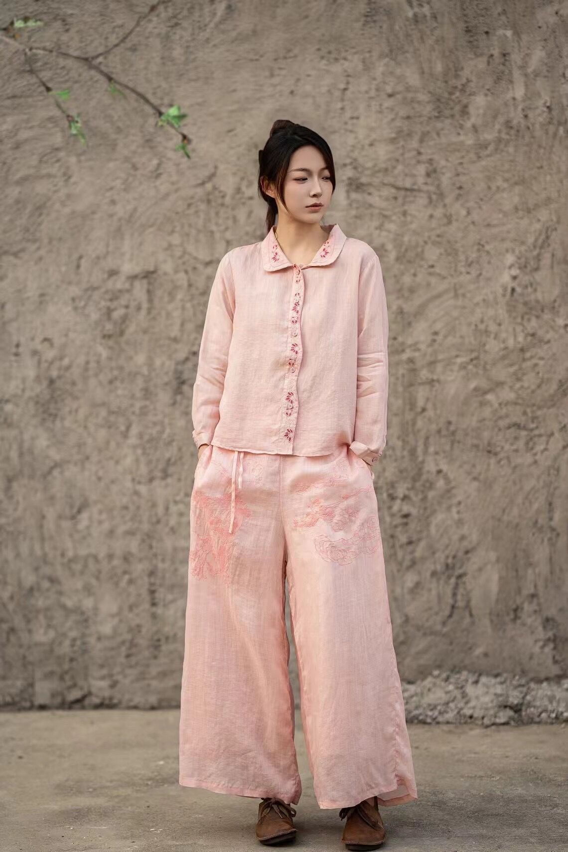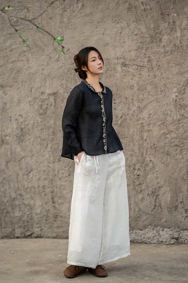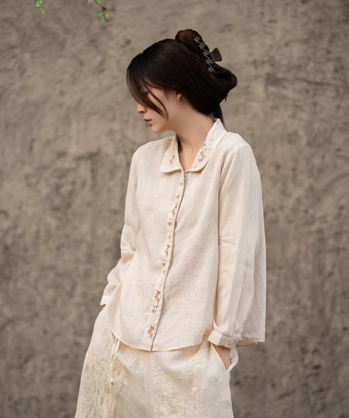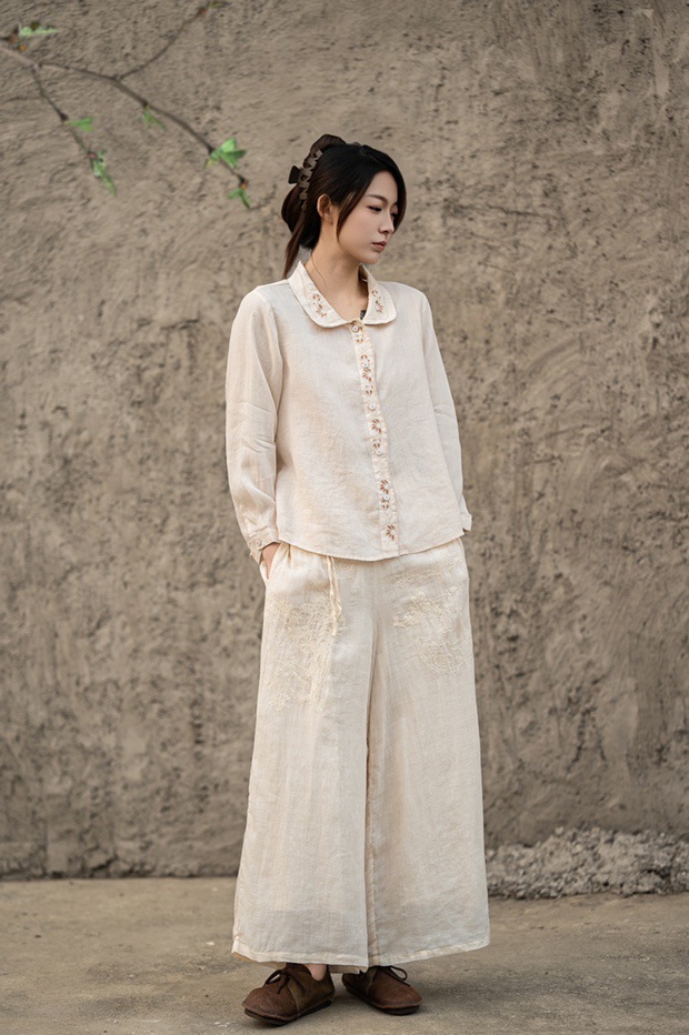 봄 2025 한국식 심플 루즈 슬림 자수 옷깃 긴팔 셔츠 여성을위한 올 매치 문학 스타일 셔츠