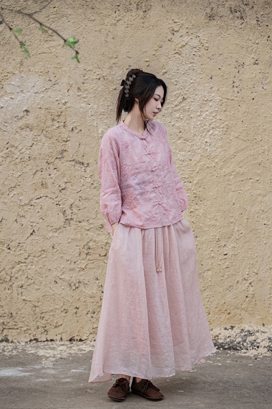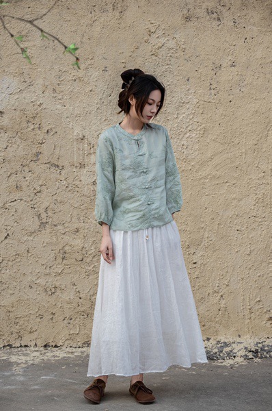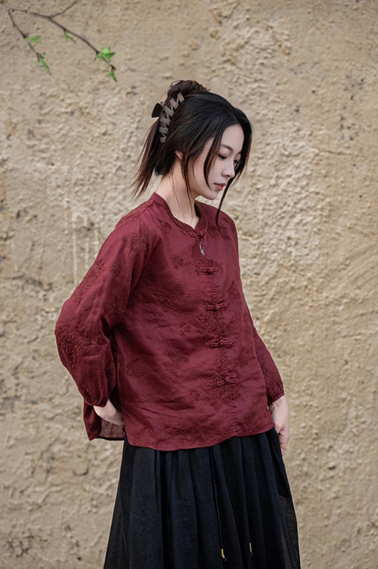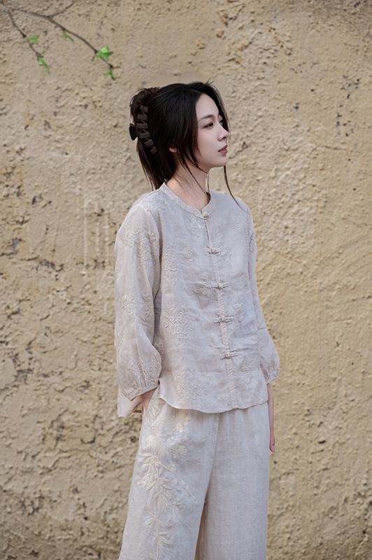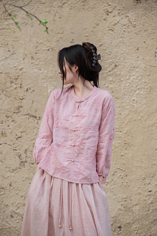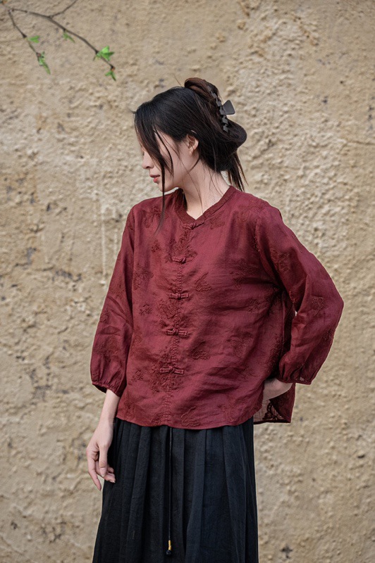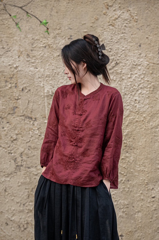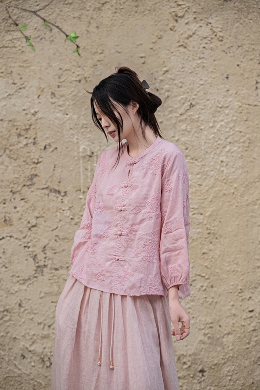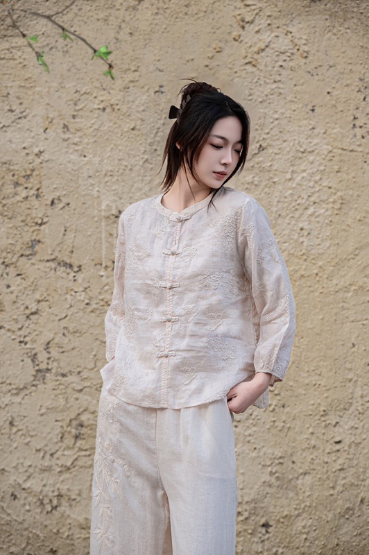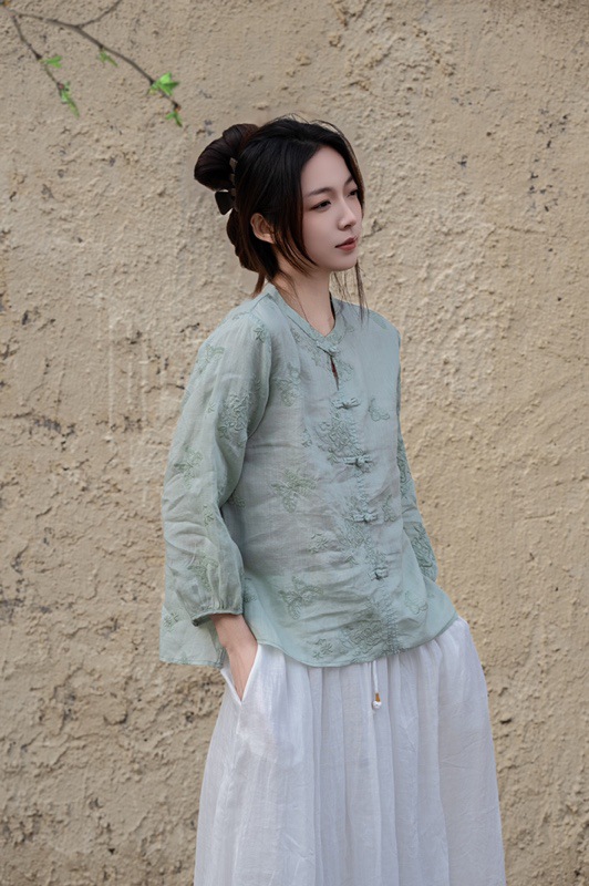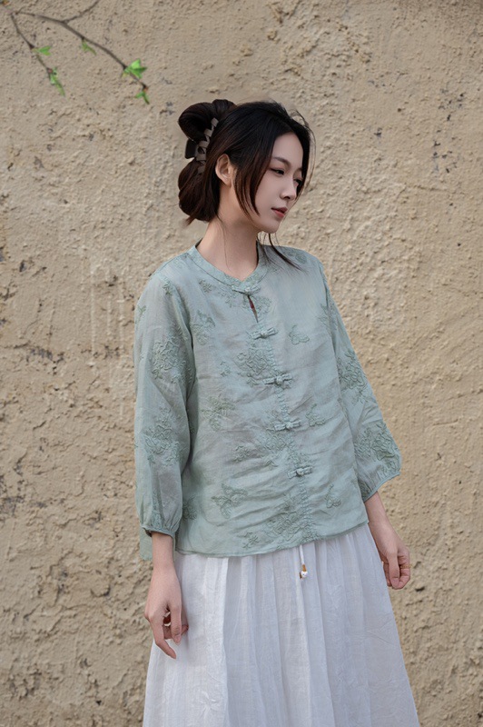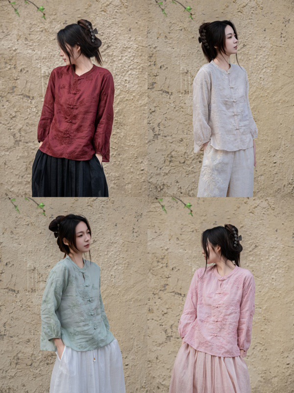 2025 봄과 여름 새로운 중국 스타일 국가 스타일 레트로 작은 셔츠 여성용 둥근 목 단색 셔츠 느슨한 버튼 업 셔츠스토어 가기