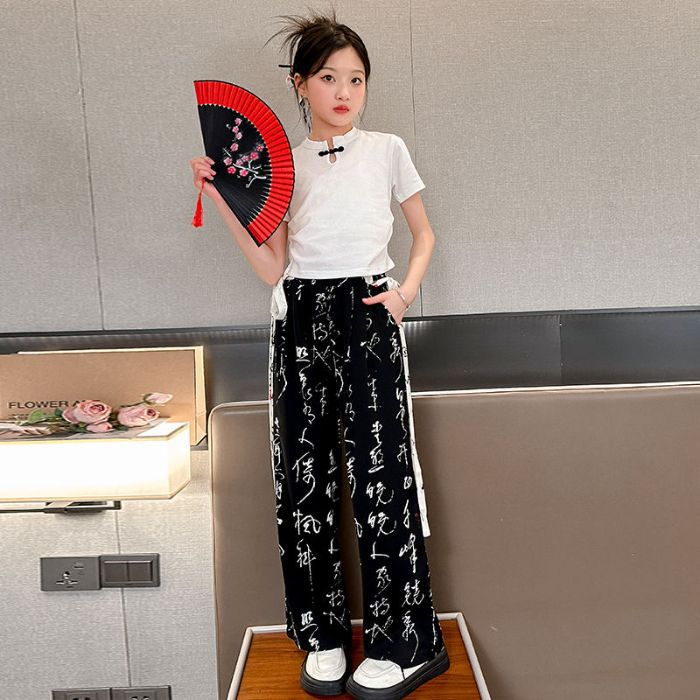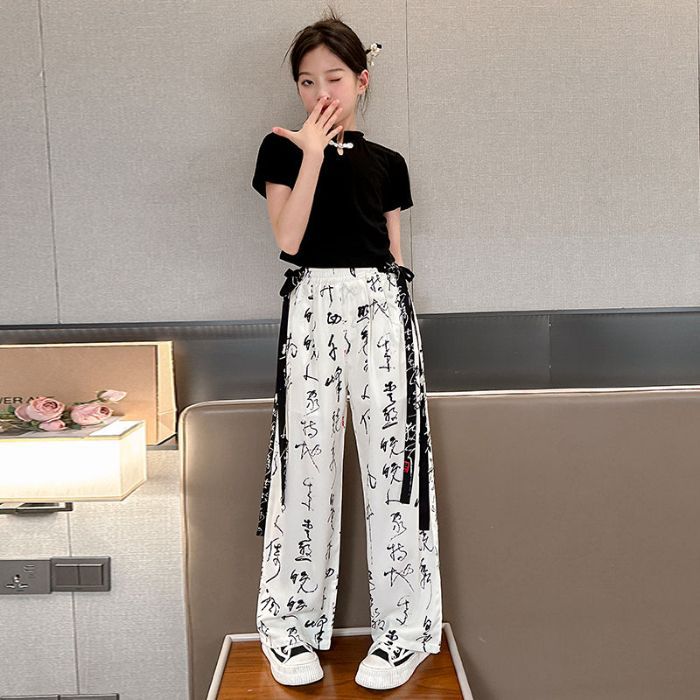 소녀 여름 쉬폰 투피스 세트 2024 새로운 스타일 여름 얇은 잉크 페인팅 세트 중 큰 어린이 캐주얼 투피스 세트