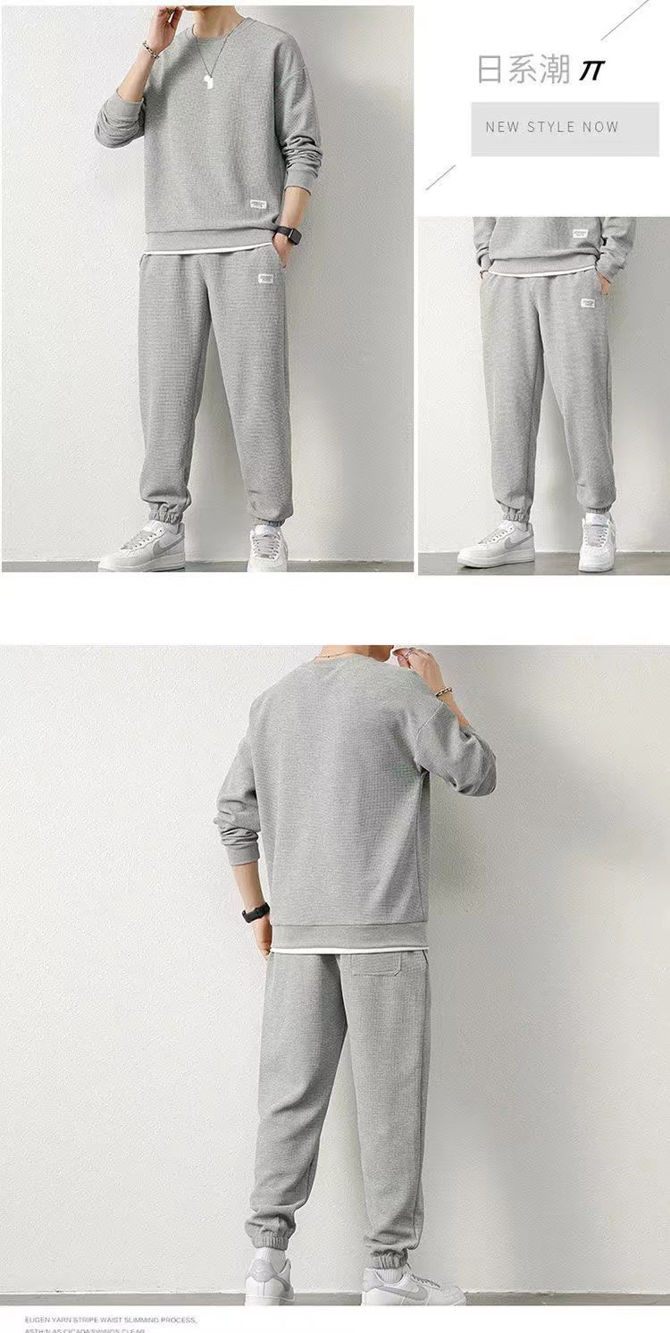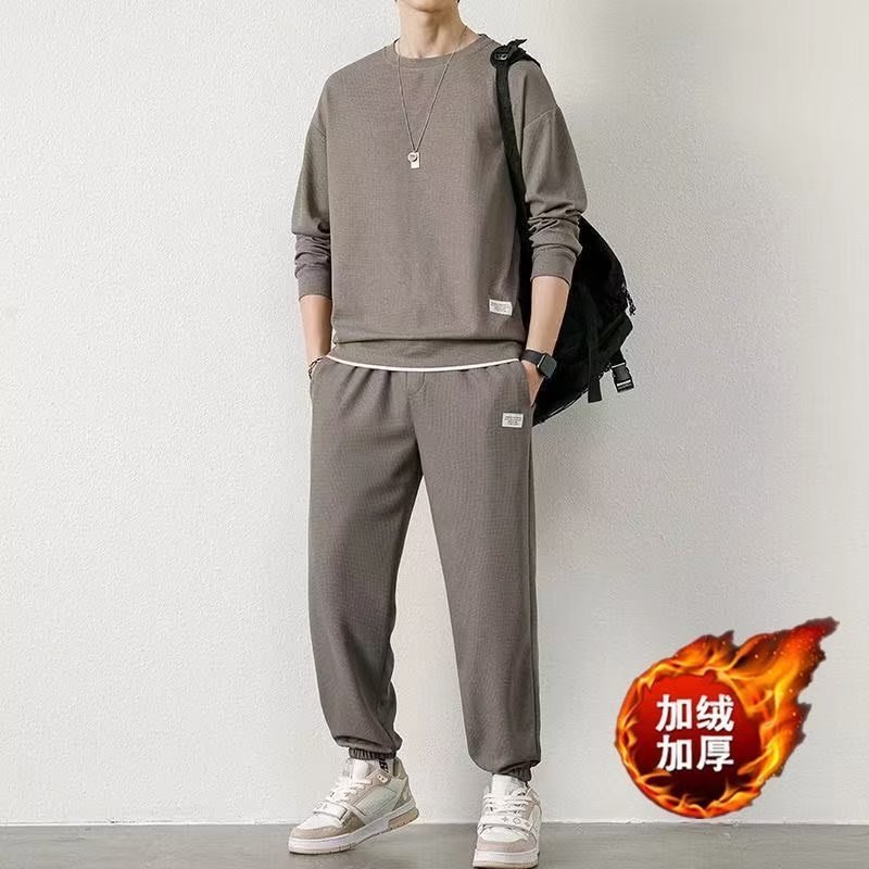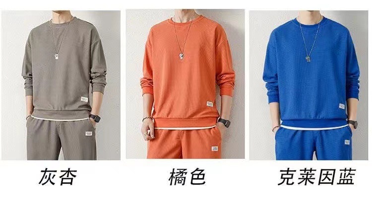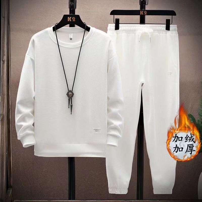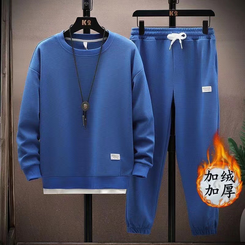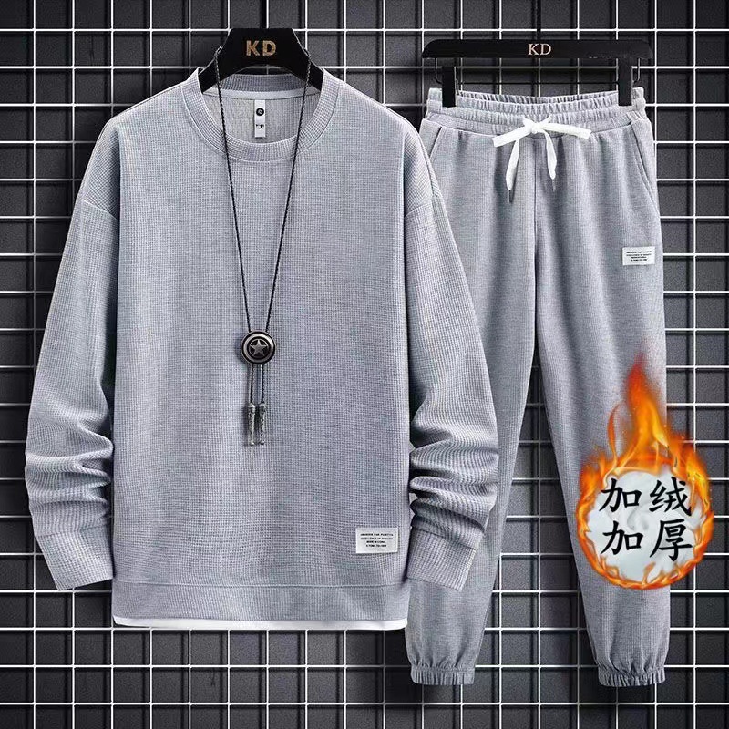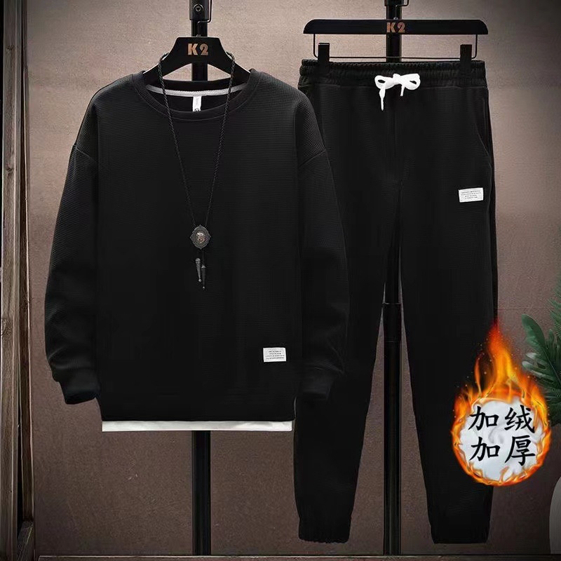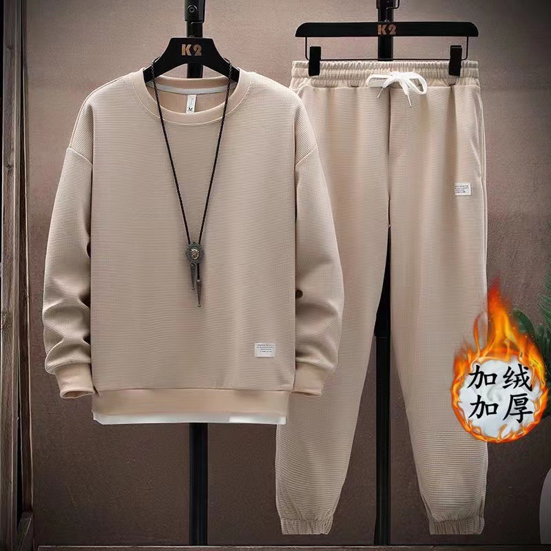 와플 기모 두꺼운 플러스 사이즈 스웨트 셔츠 남자 가을 겨울 단색 캐주얼 스포츠 남자 가짜 투피스 세트