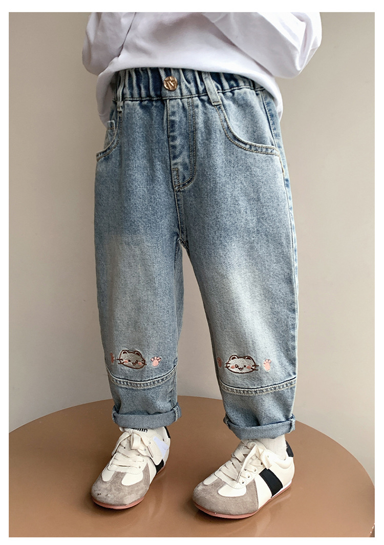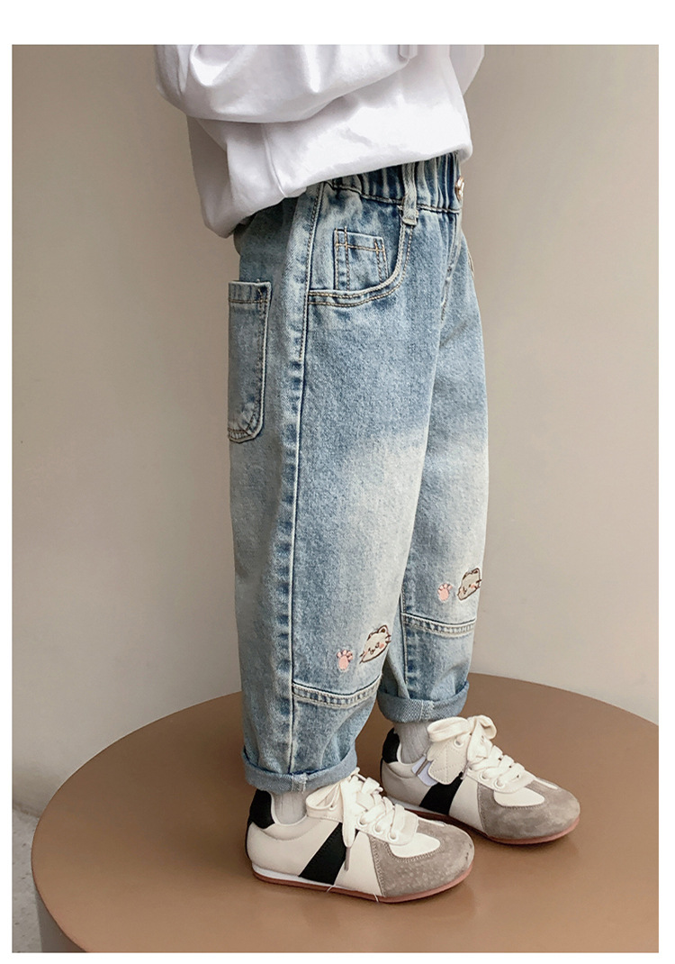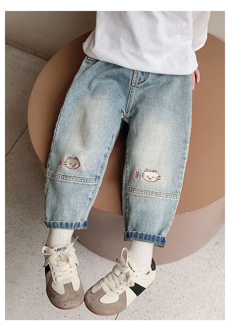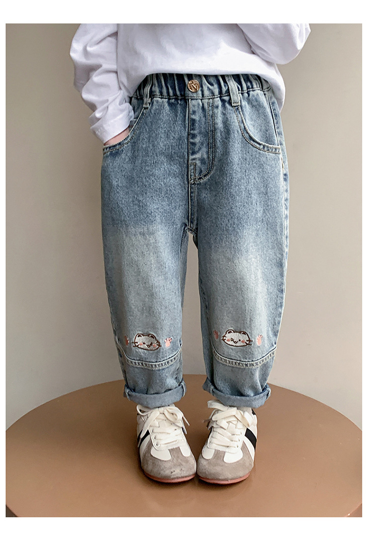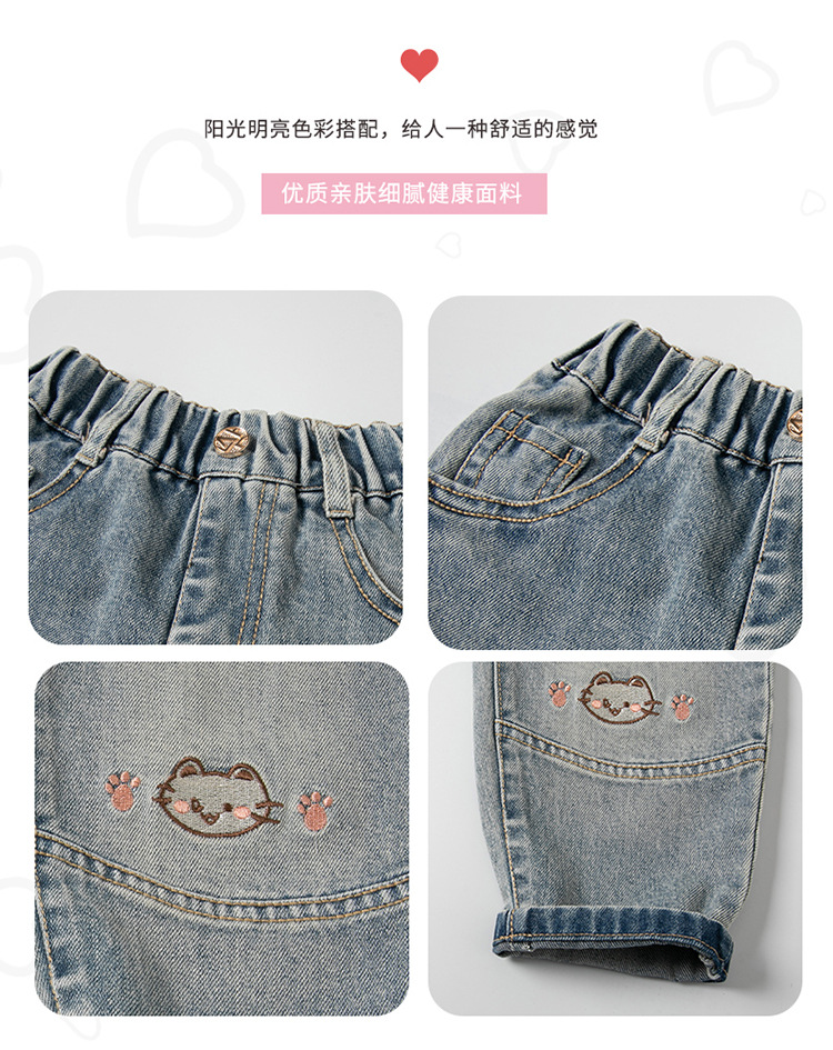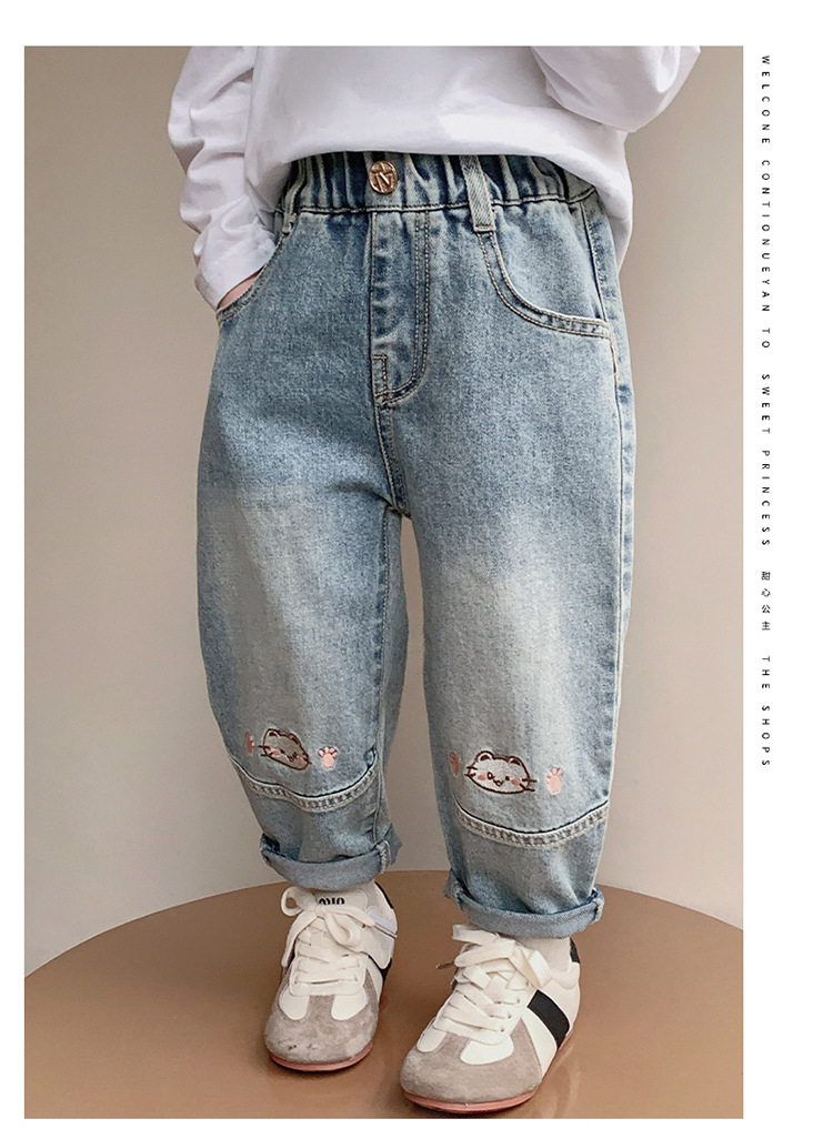 소녀 새끼 고양이 수 놓은 청바지 2025 새로운 패션 어린 소녀 바지 중소 어린이 스트레이트 다리 바지스토어 가기