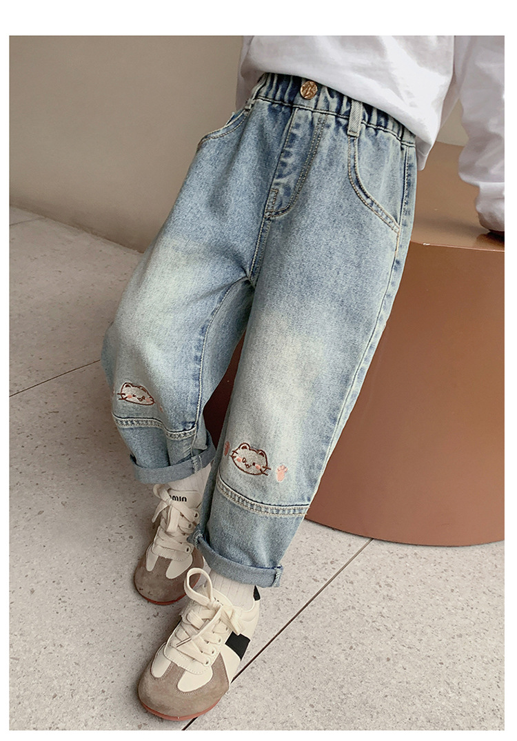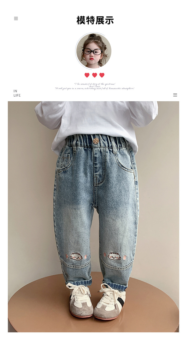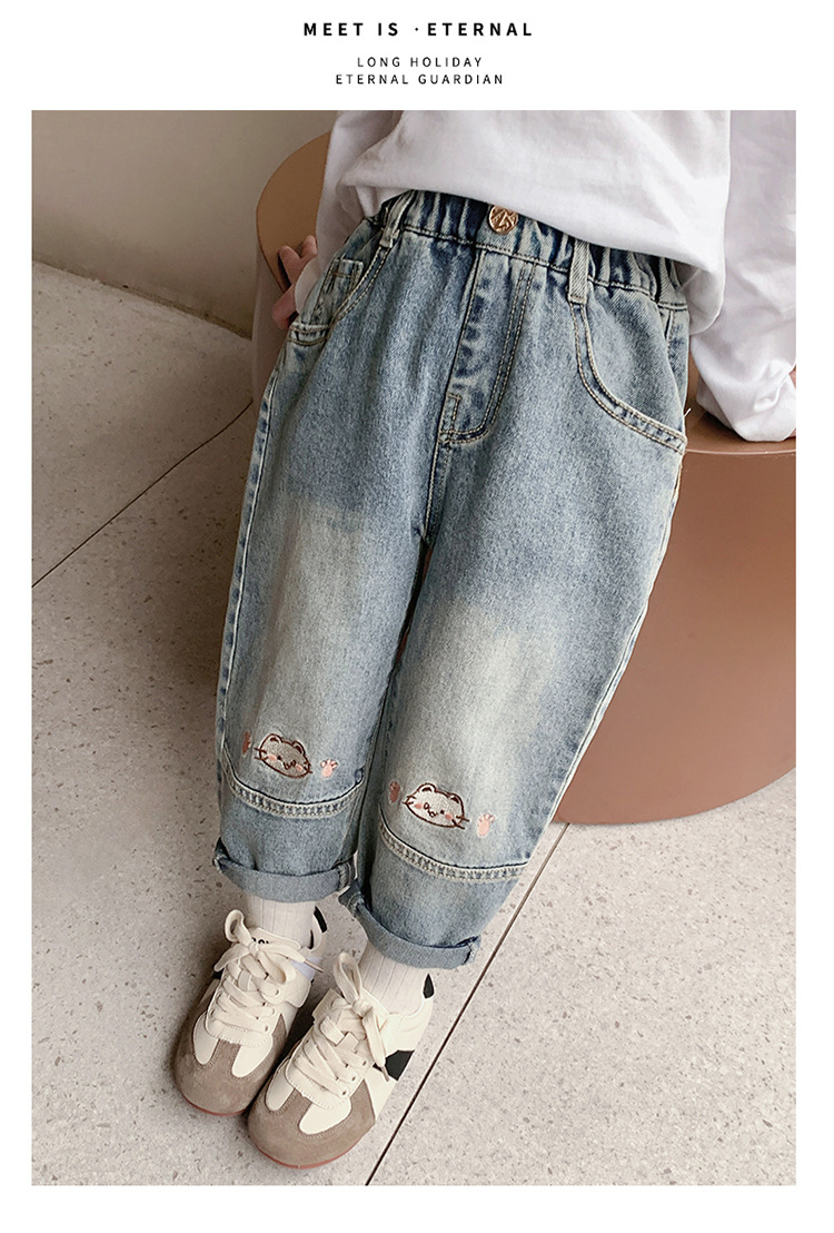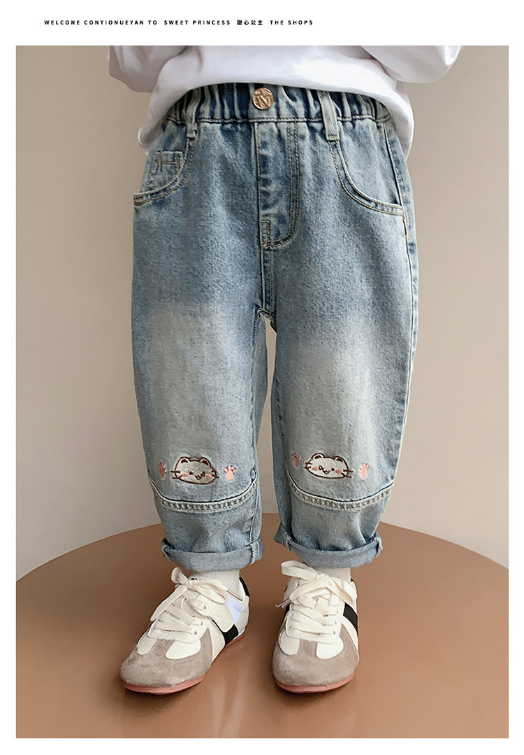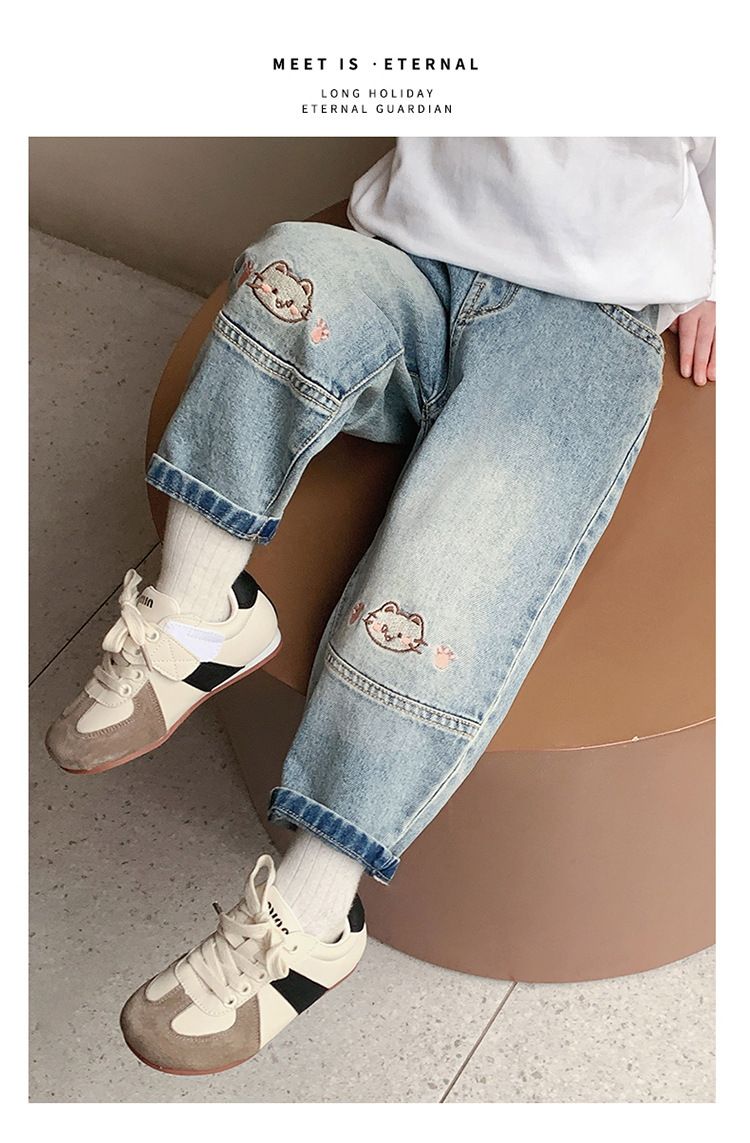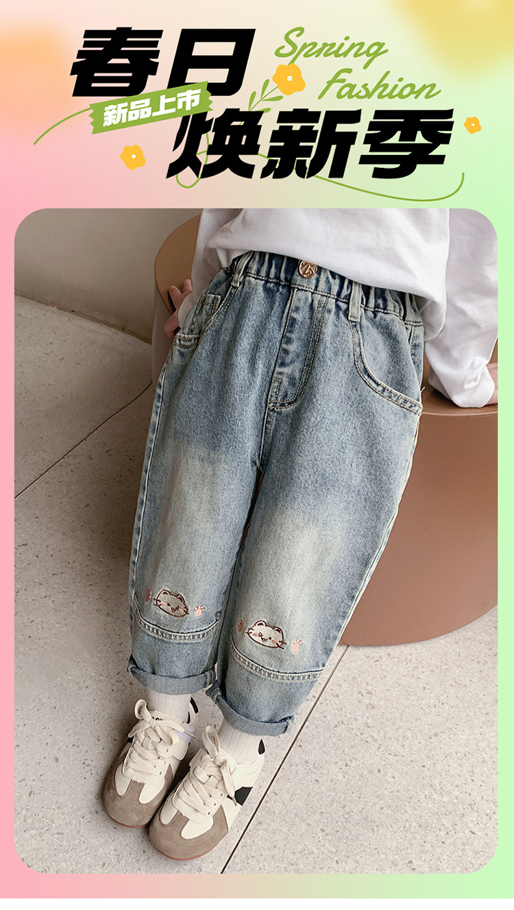 소녀 새끼 고양이 수 놓은 청바지 2025 새로운 패션 어린 소녀 바지 중소 어린이 스트레이트 다리 바지스토어 가기