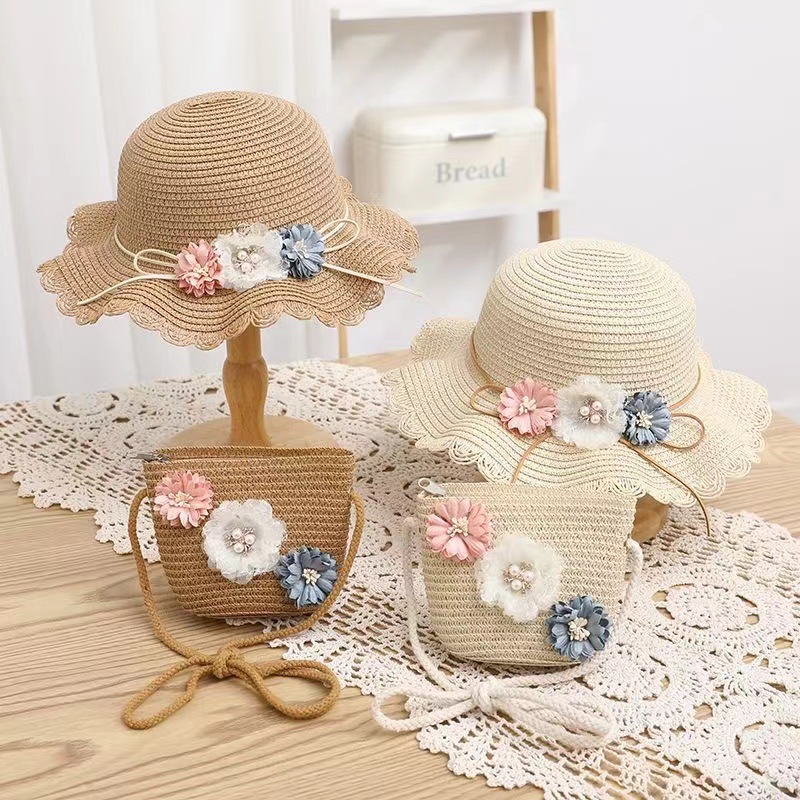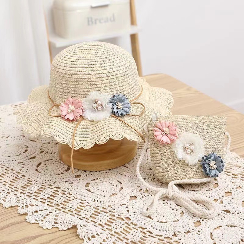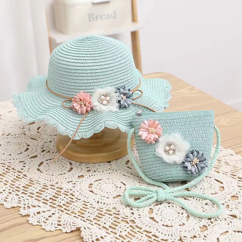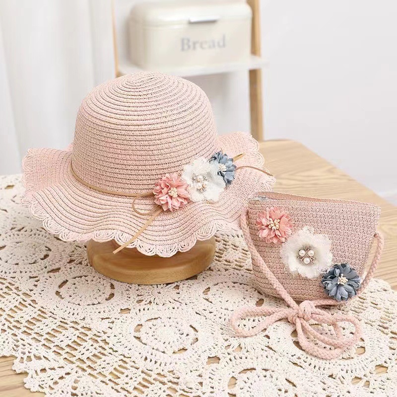 소녀 서양식 선 스크린 모자 어린이 어부 모자 여름 그늘 밀짚 소녀 모자 가방 부모-자식 여행 태양 모자 조수