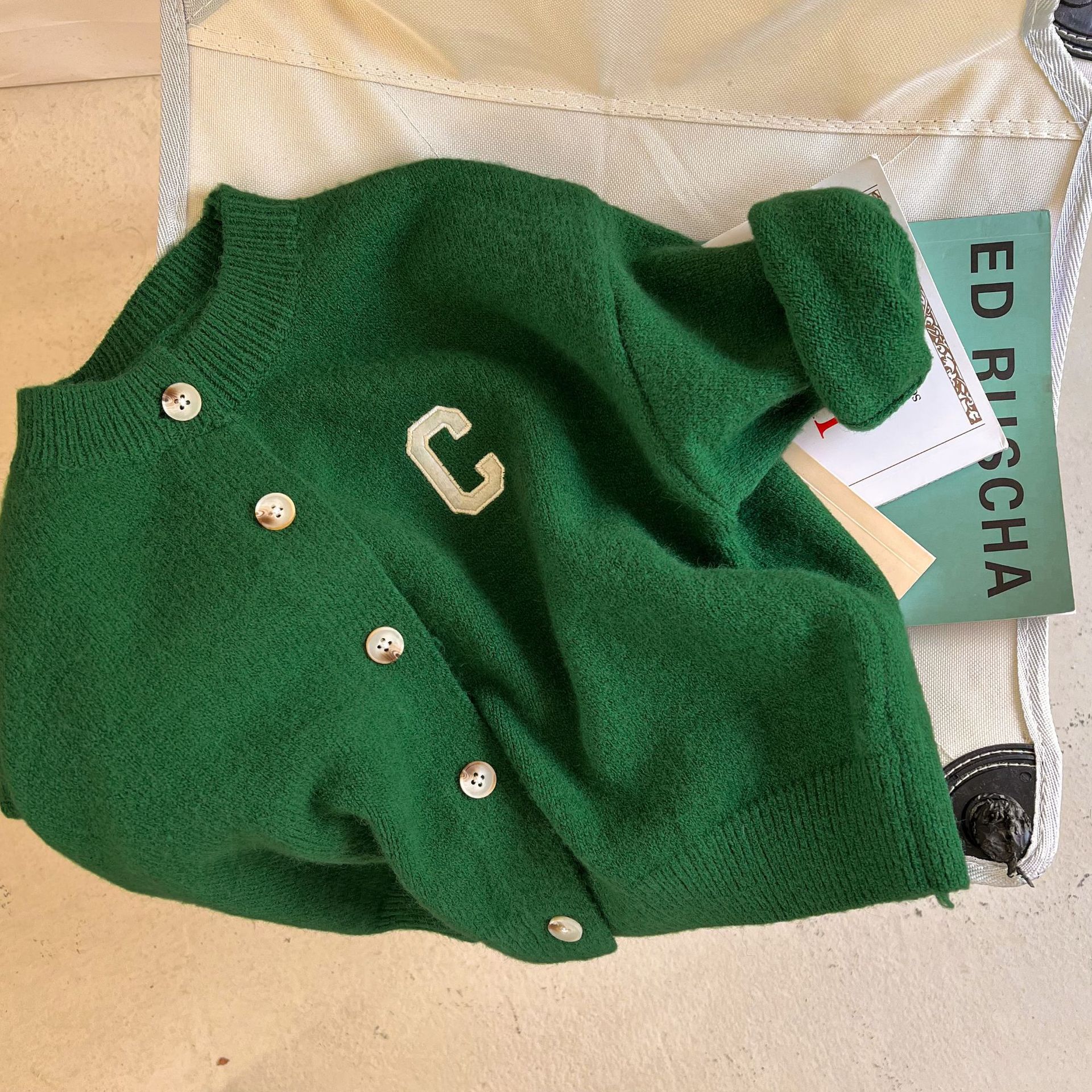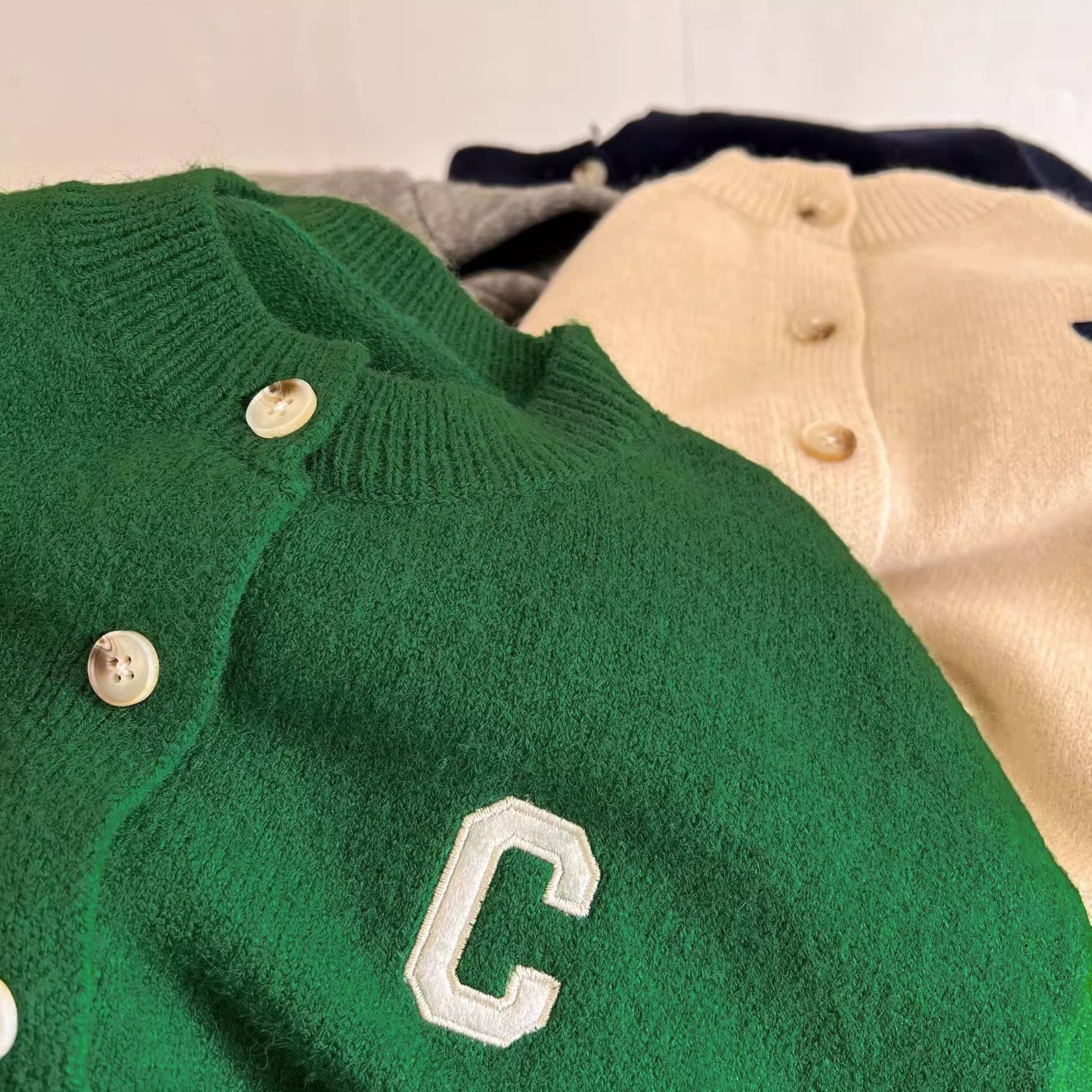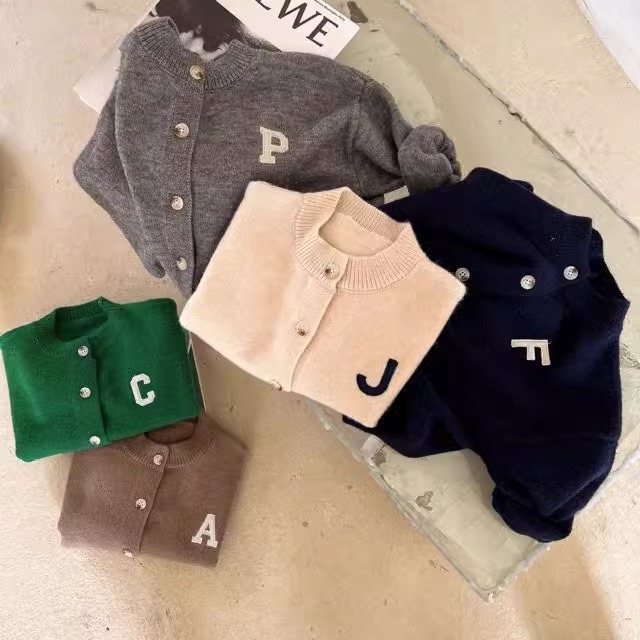 어린이 스웨터 2025 봄 새 소년과 소녀 둥근 목 단색 편지 카디건 아기 캐주얼 자켓스토어 가기