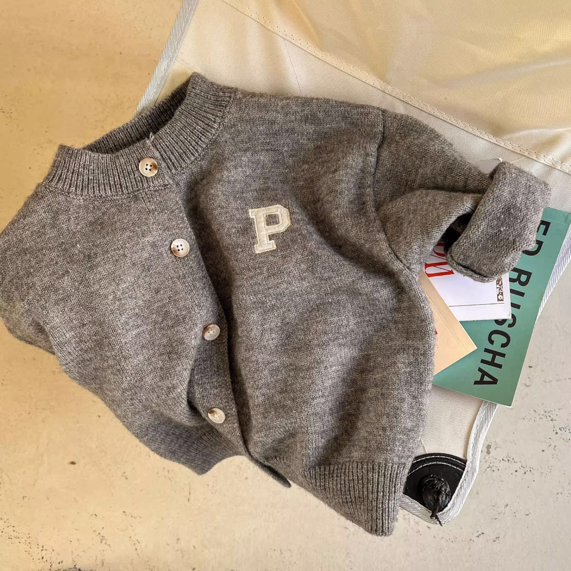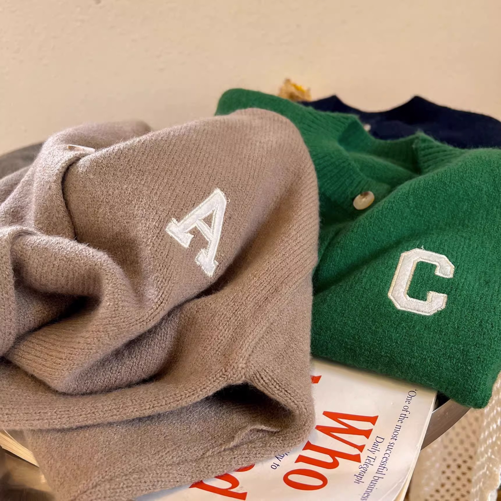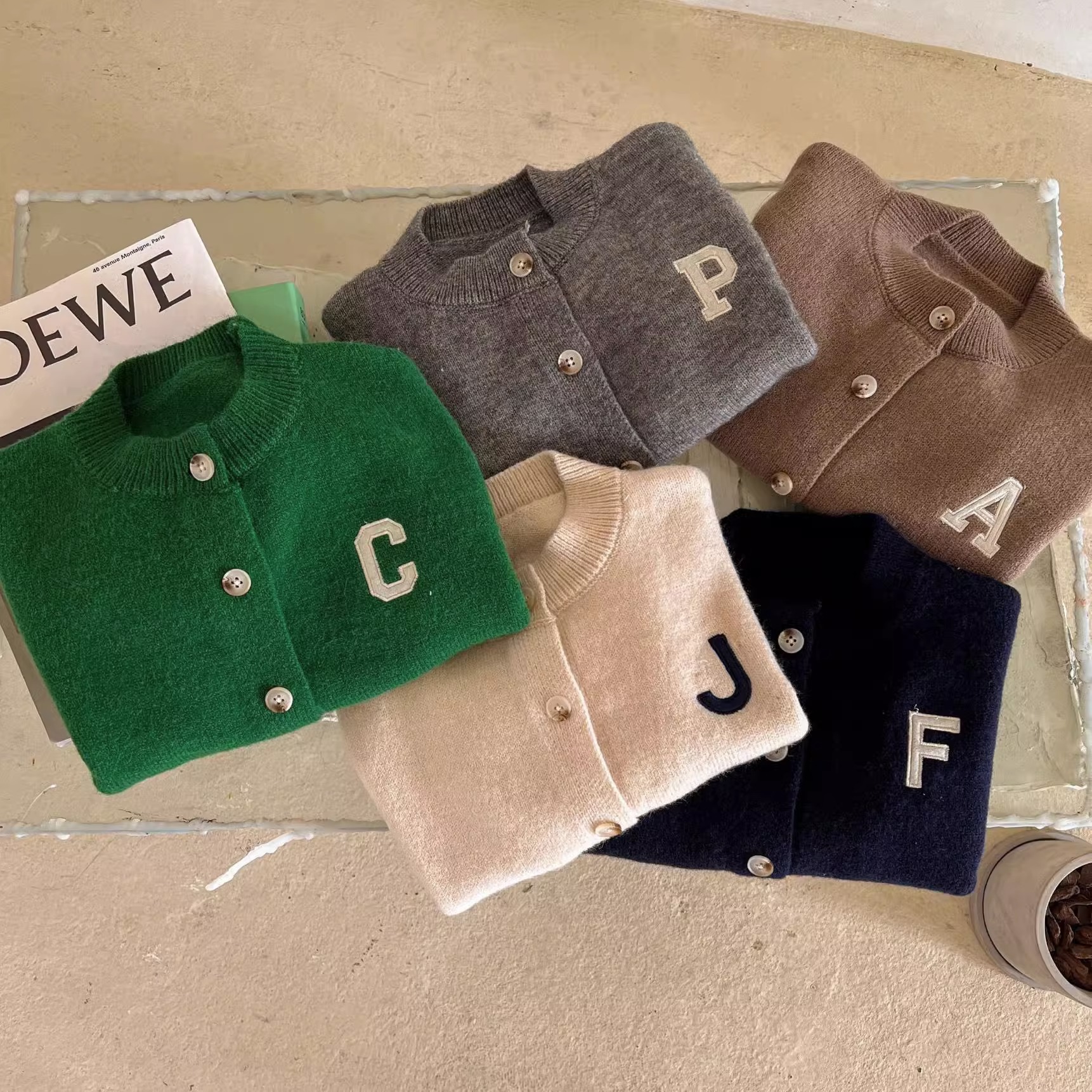 어린이 스웨터 2025 봄 새 소년과 소녀 둥근 목 단색 편지 카디건 아기 캐주얼 자켓